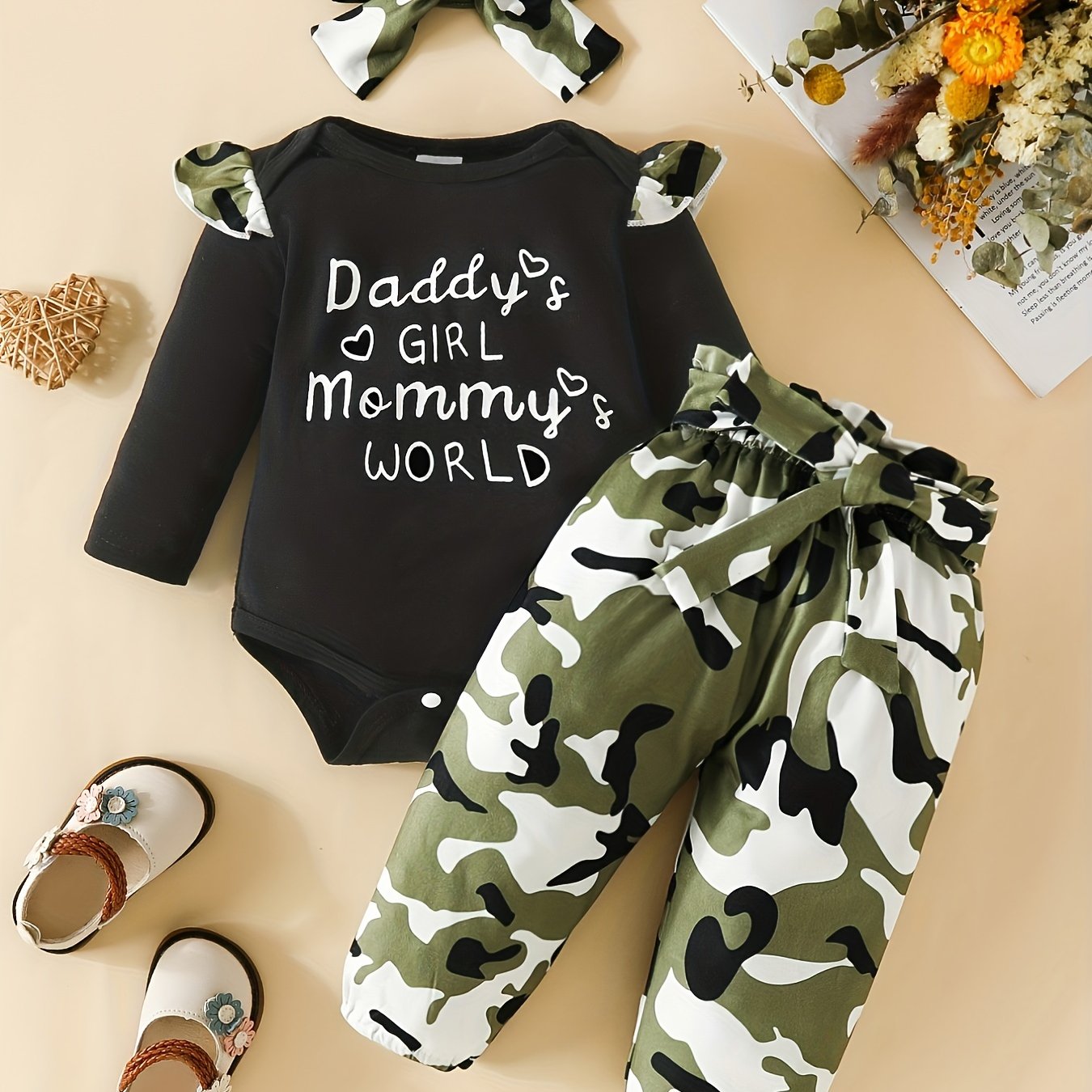 Letter Print Long Sleeve Shirt + Camouflage Long Pants Three Piece Set