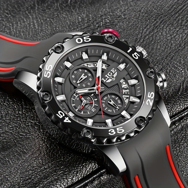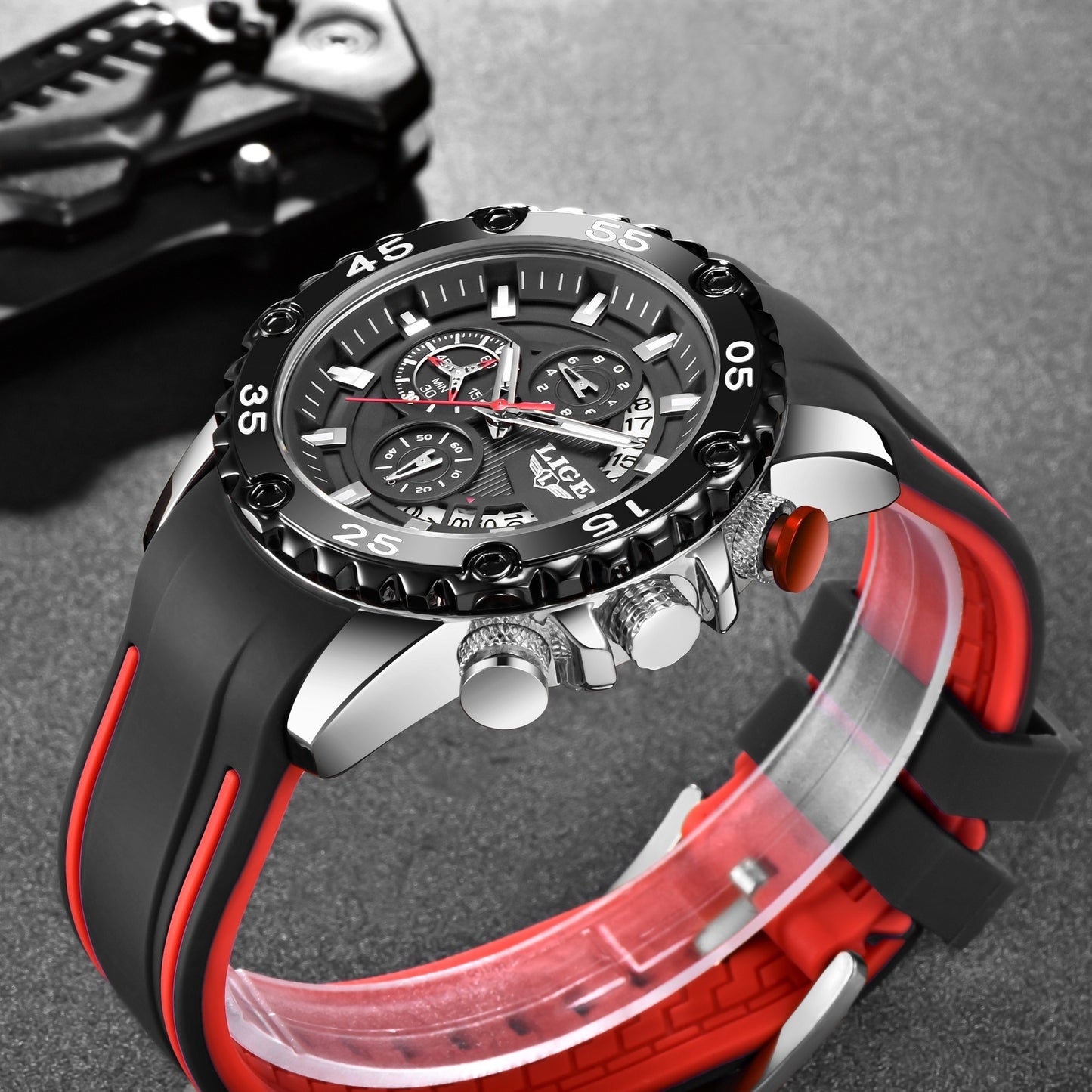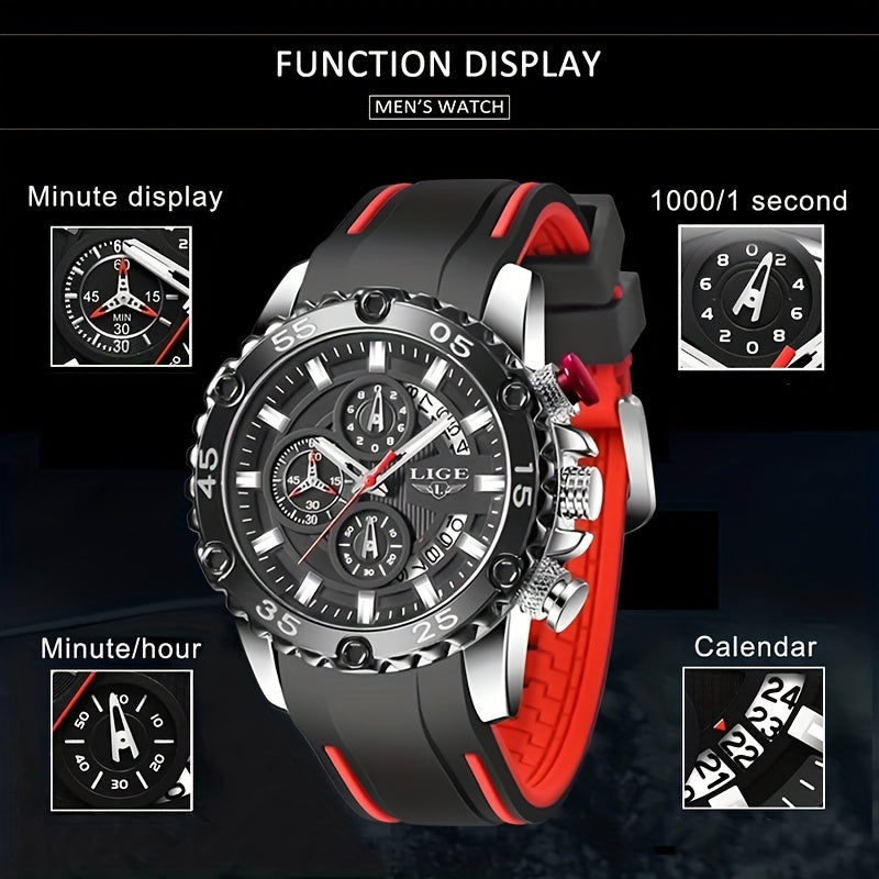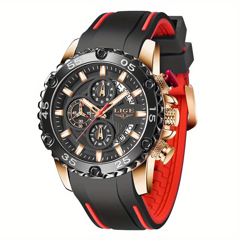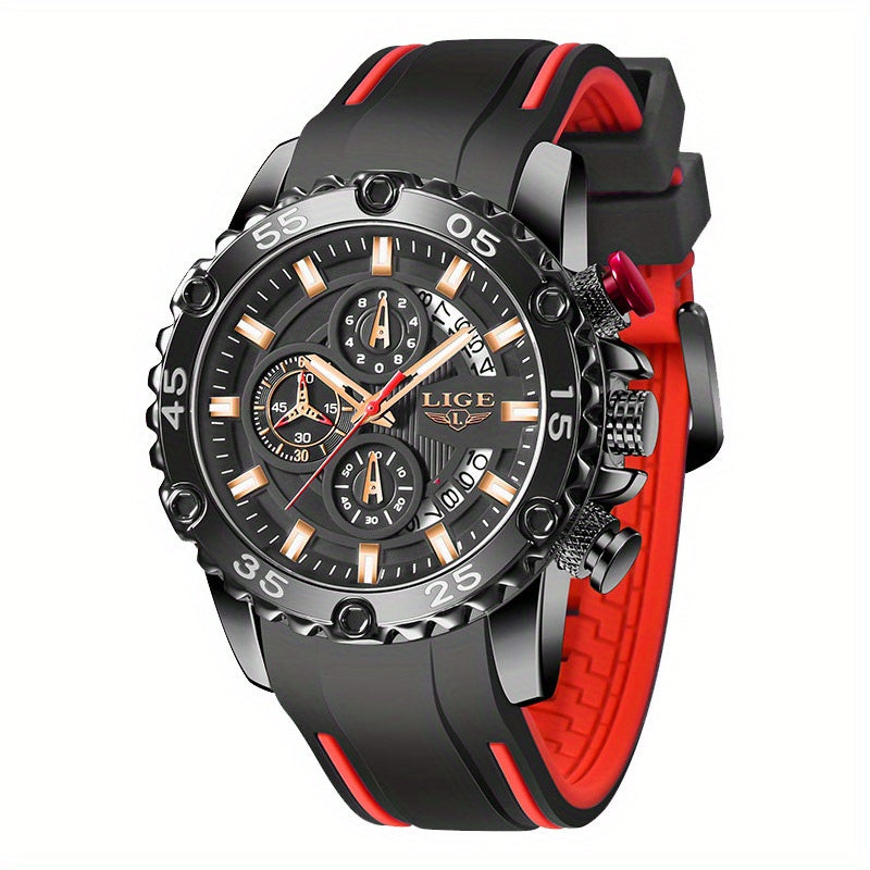 LIGE Luminous Men's Sports Watch - 30m, Chronograph Quartz Wristwatch with Black Silicone Strap, Red Accents, for Outdoor &
