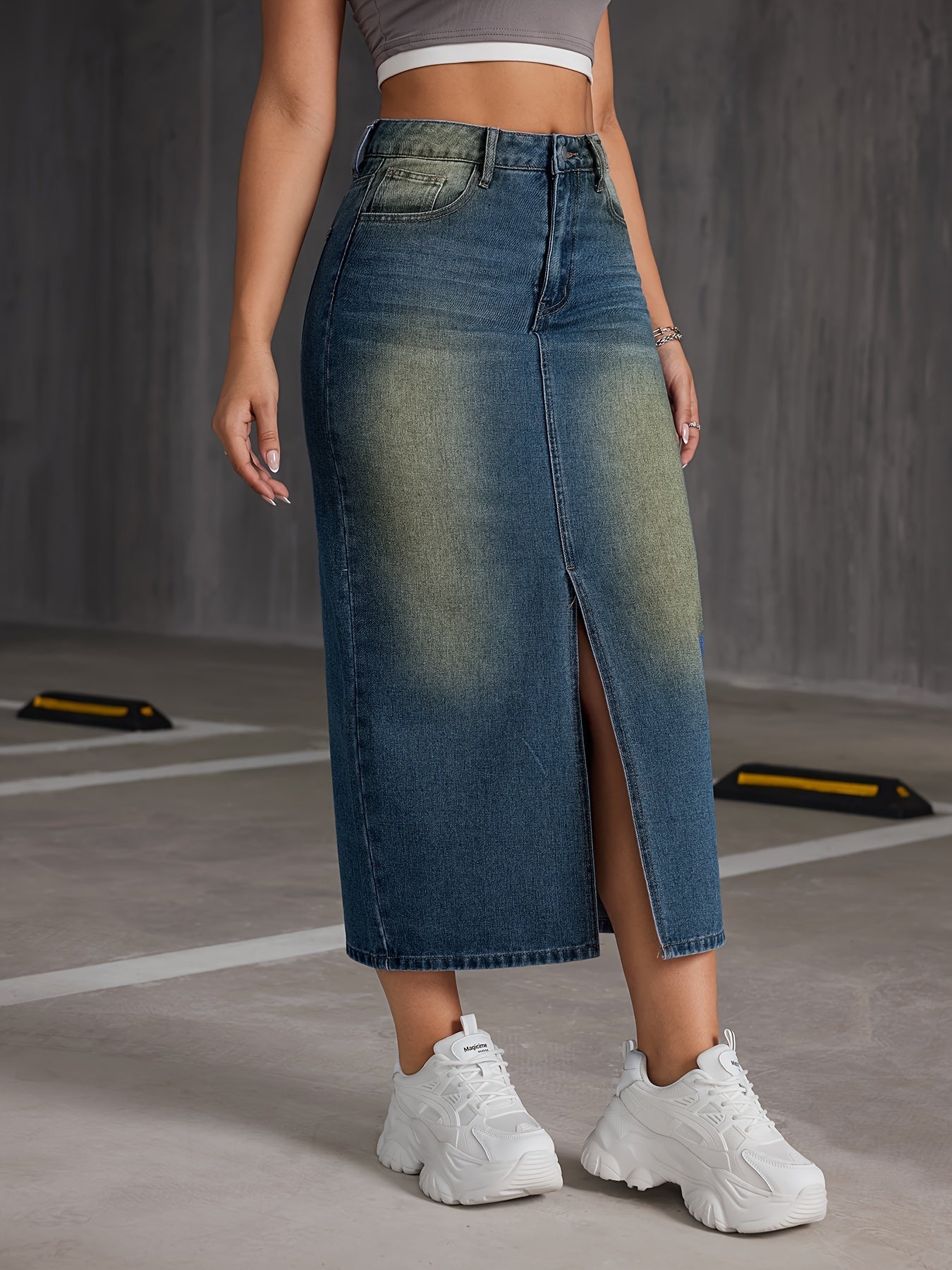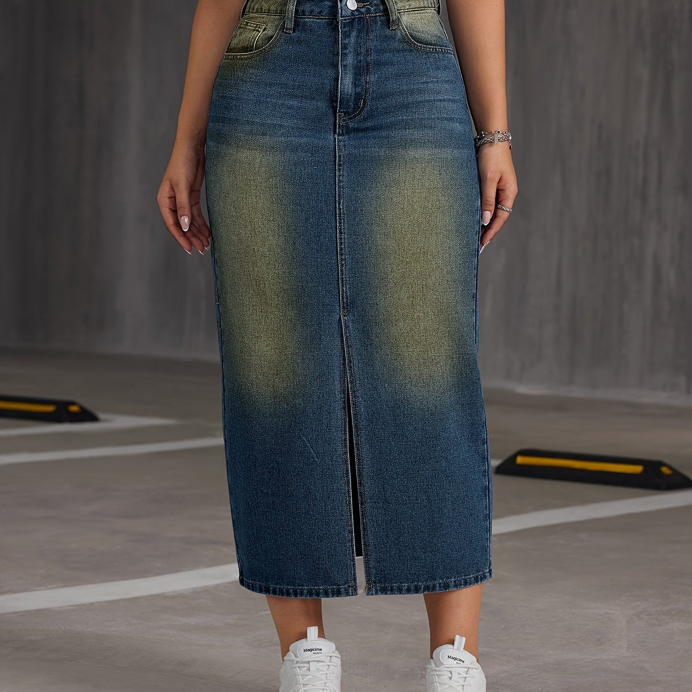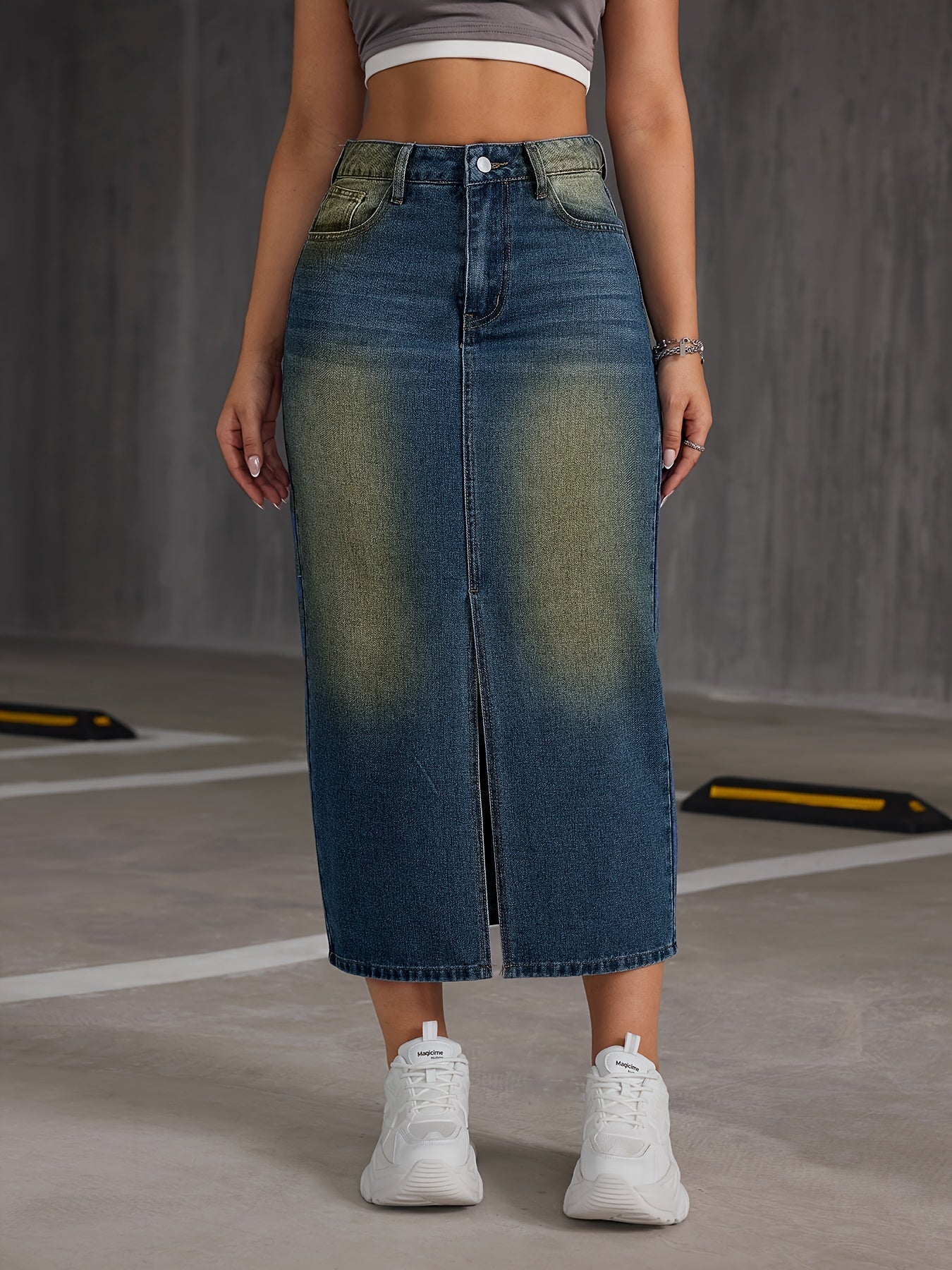 [Lightweight Design] Women's High-Waisted Denim Midi Skirt with Front Slit - Casual Stretch Fit, Light Blue to Yellow Gradient, Side Pockets, Comfortable Spring/Summer/Fall Wear, Spring Summer Wear|Trendy Split Skirt|No Inner Lining