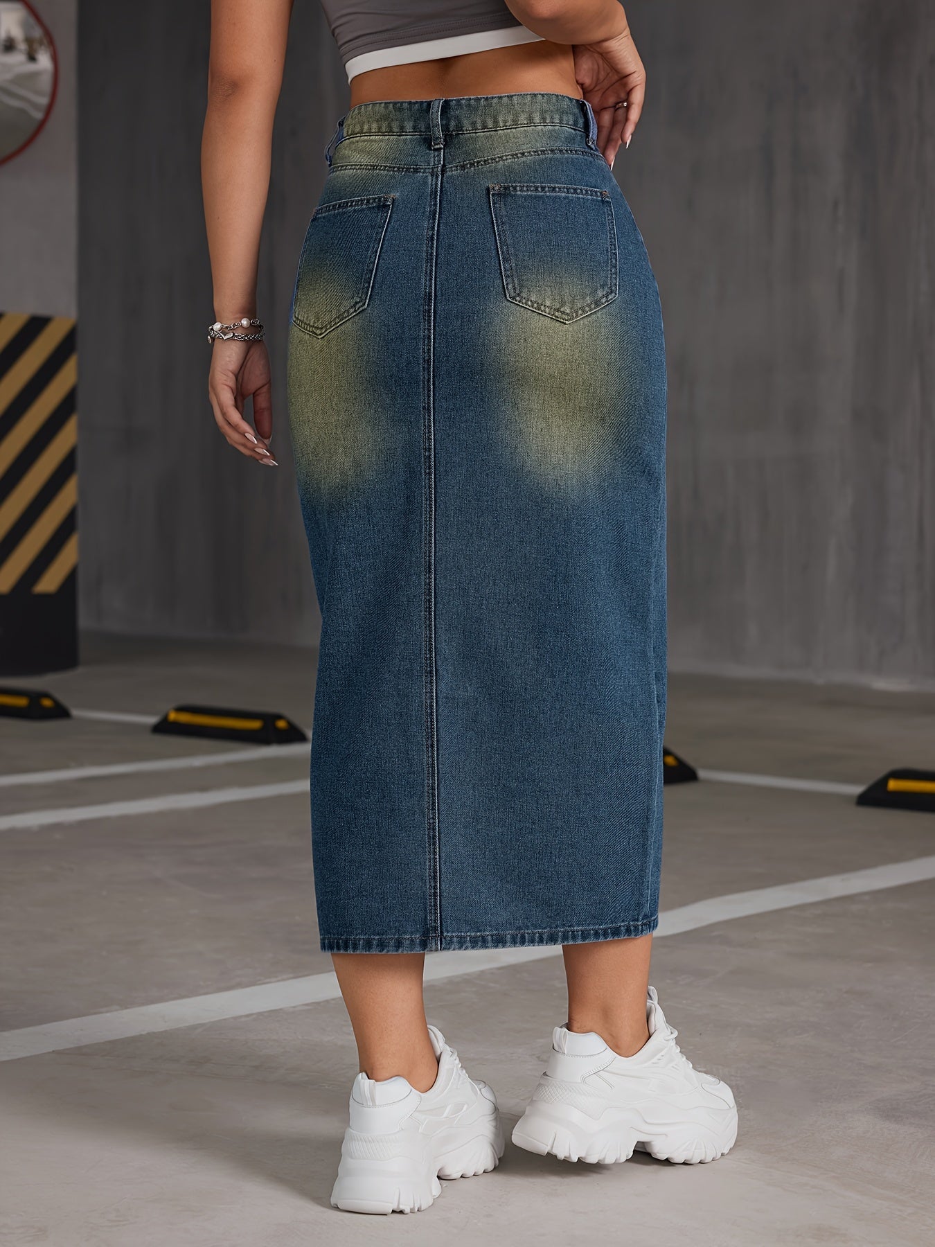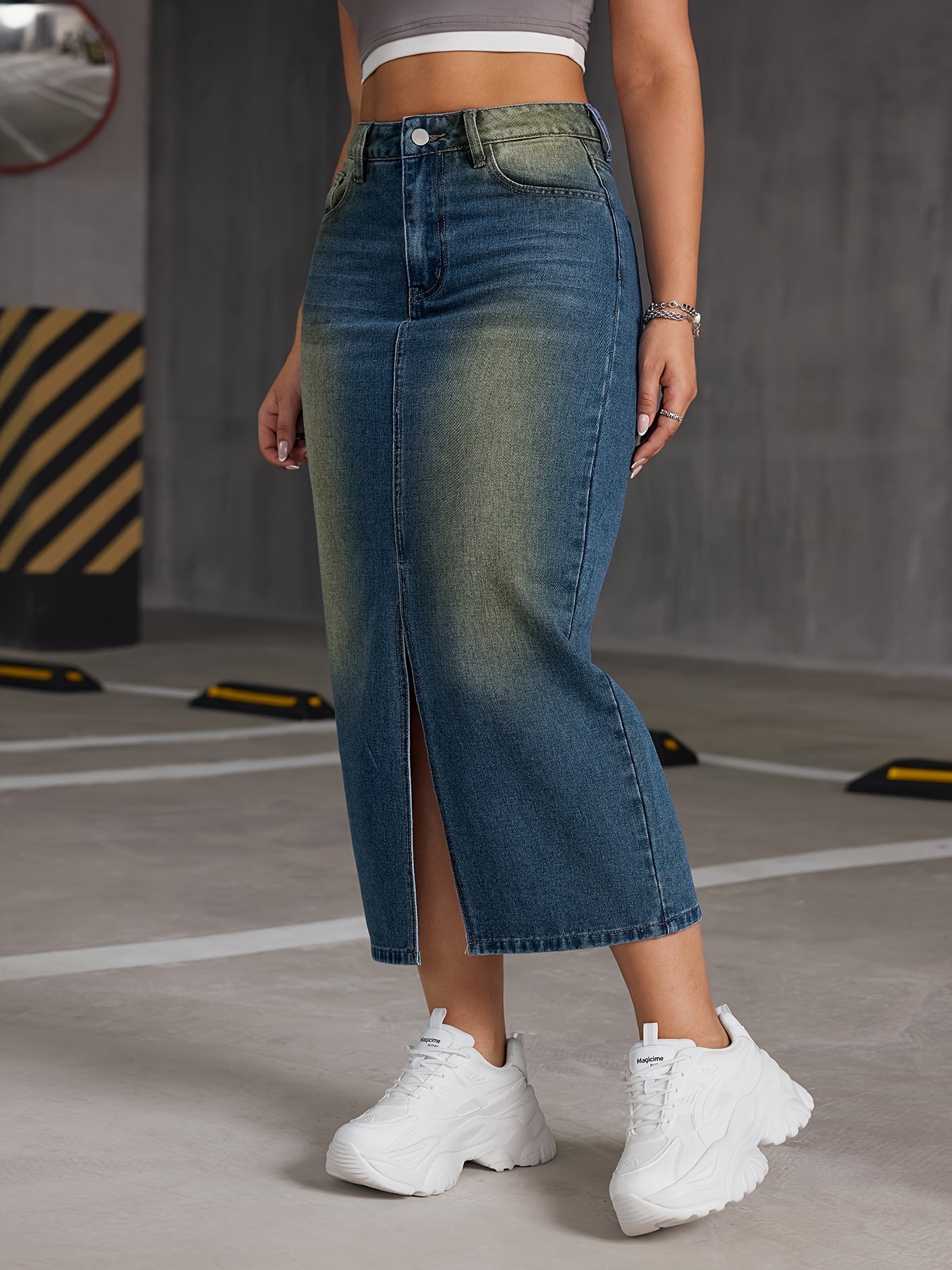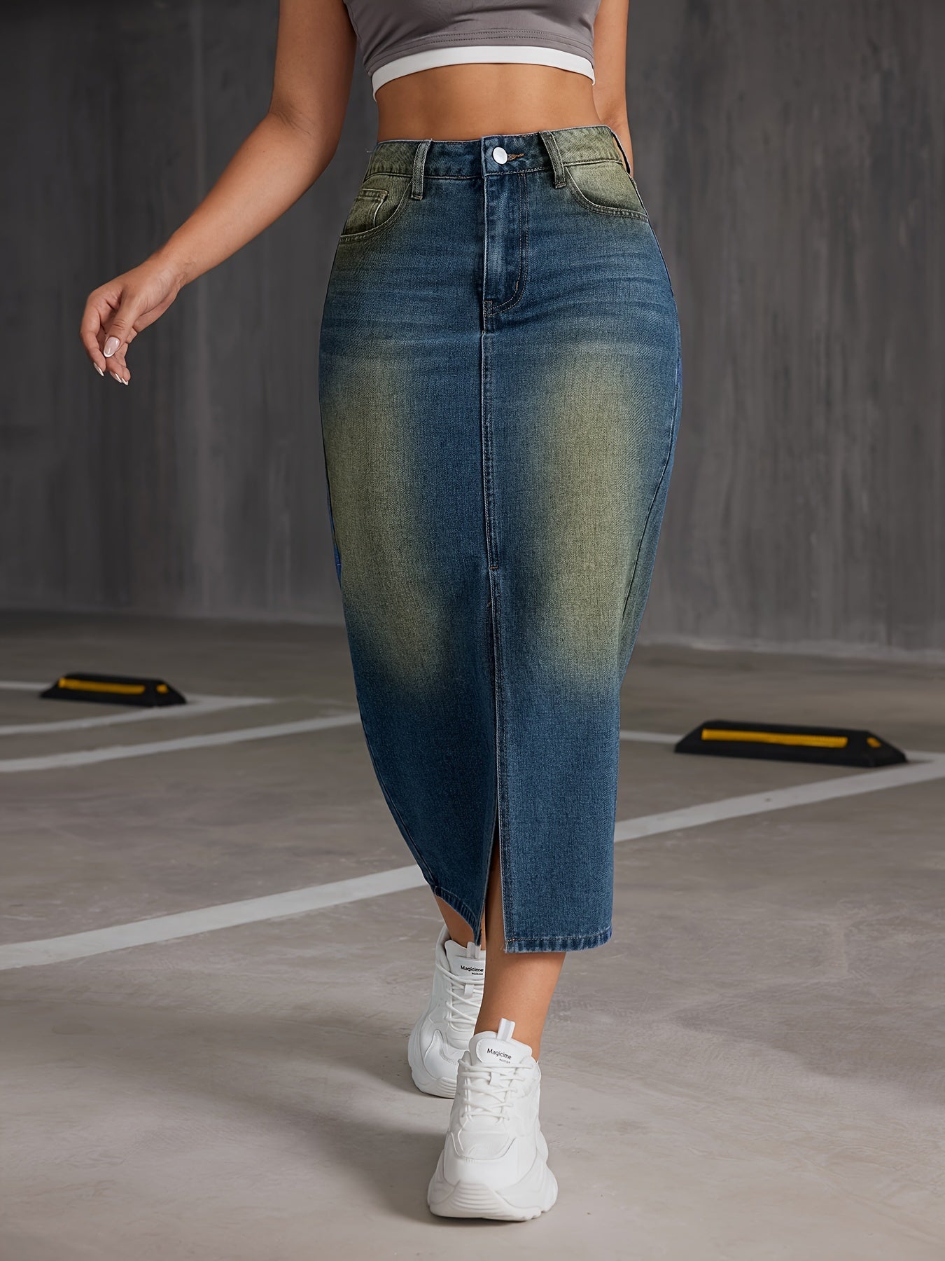[Lightweight Design] Women's High-Waisted Denim Midi Skirt with Front Slit - Casual Stretch Fit, Light Blue to Yellow Gradient, Side Pockets, Comfortable Spring/Summer/Fall Wear, Spring Summer Wear|Trendy Split Skirt|No Inner Lining