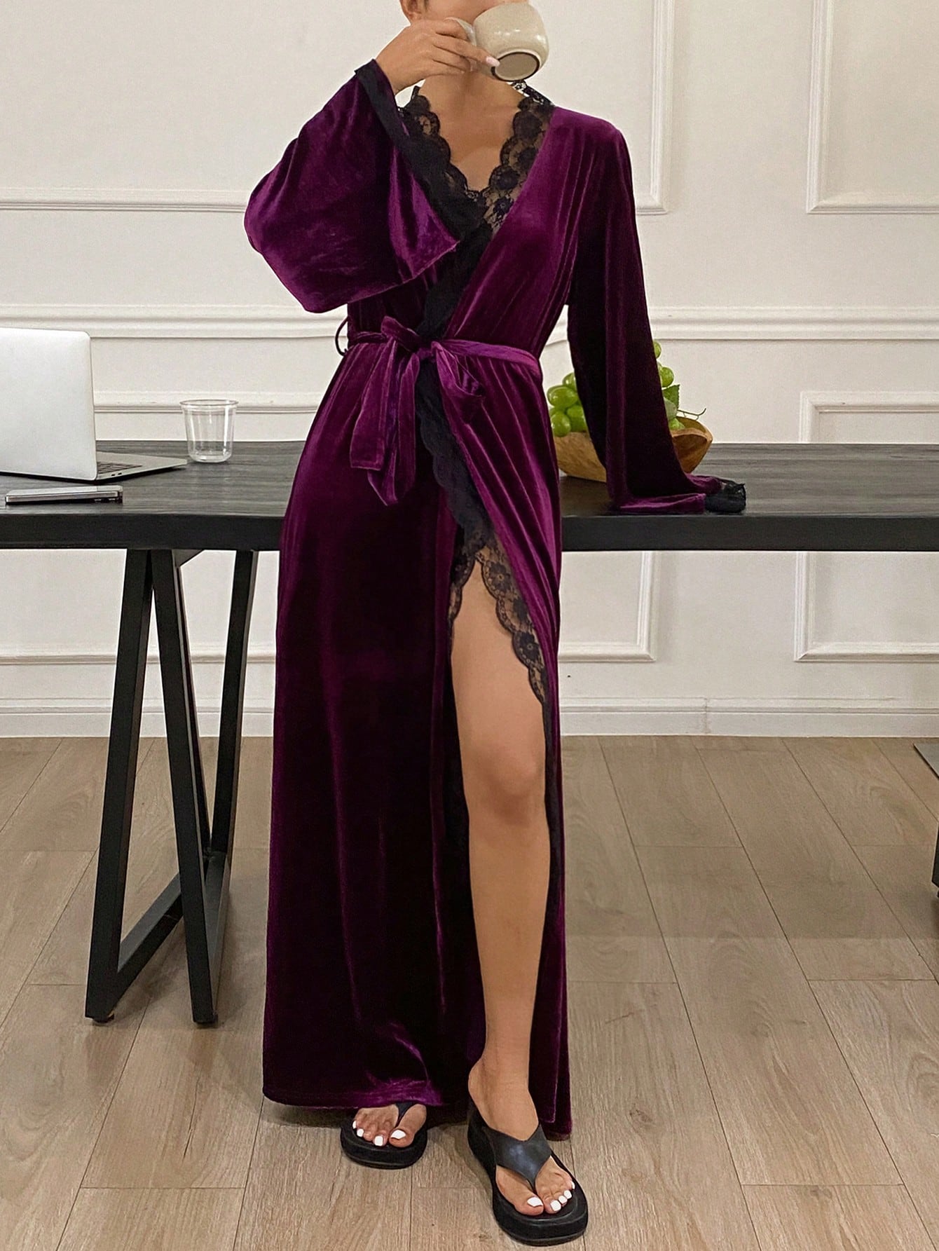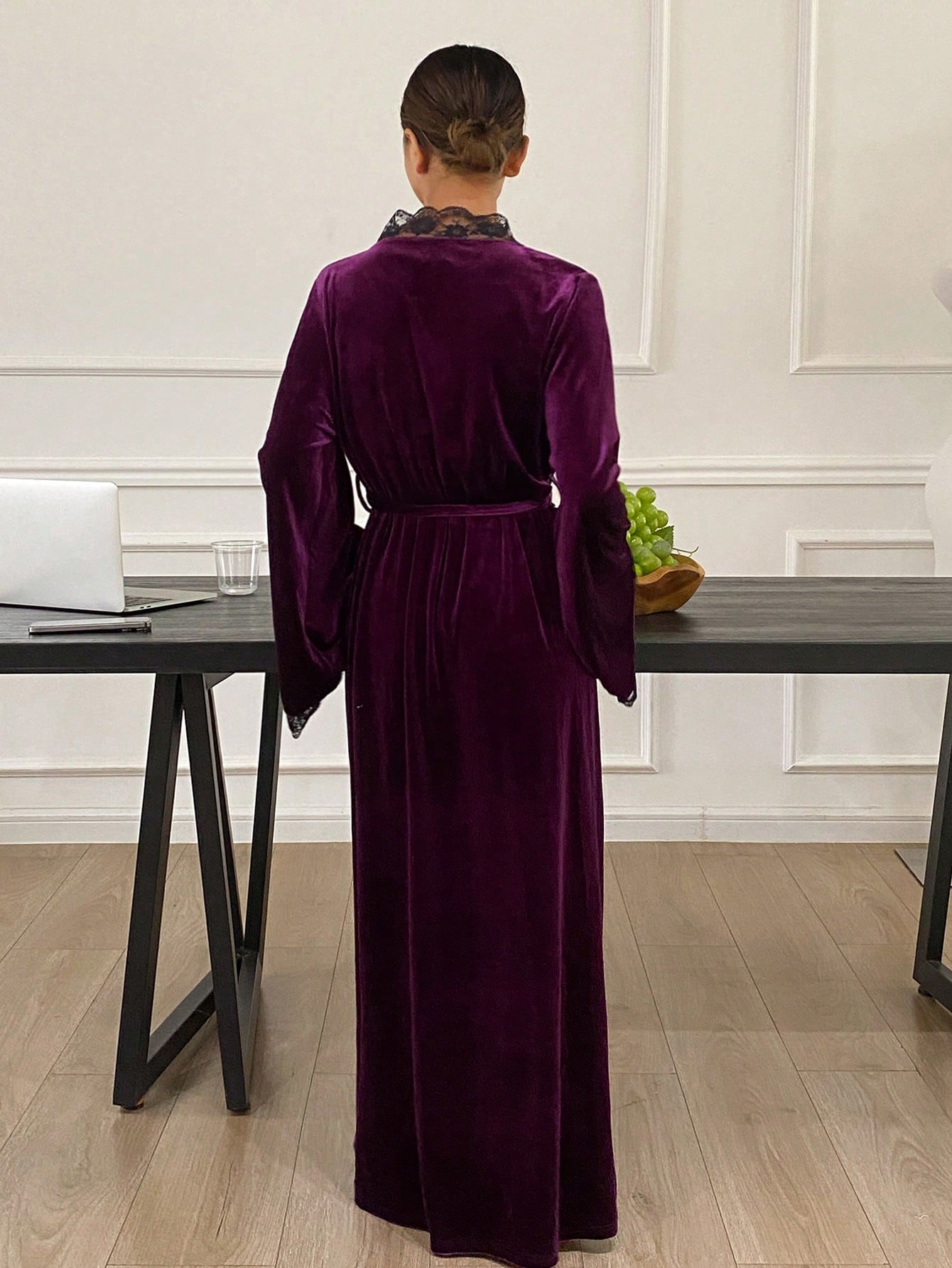 Livesso 1pc Velvet & Contrast Lace Long Robe, Winter