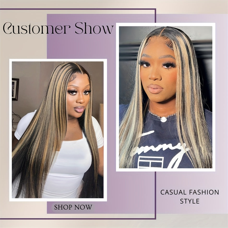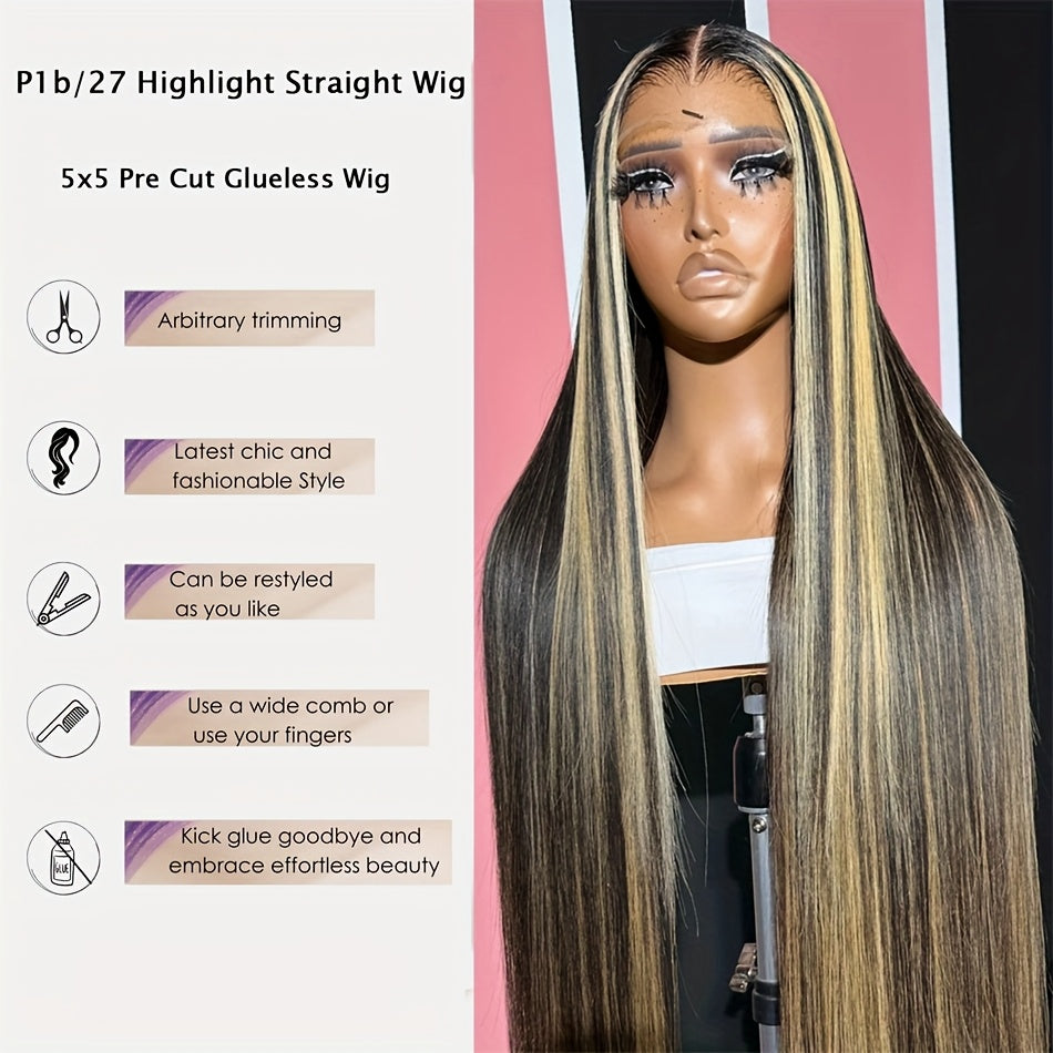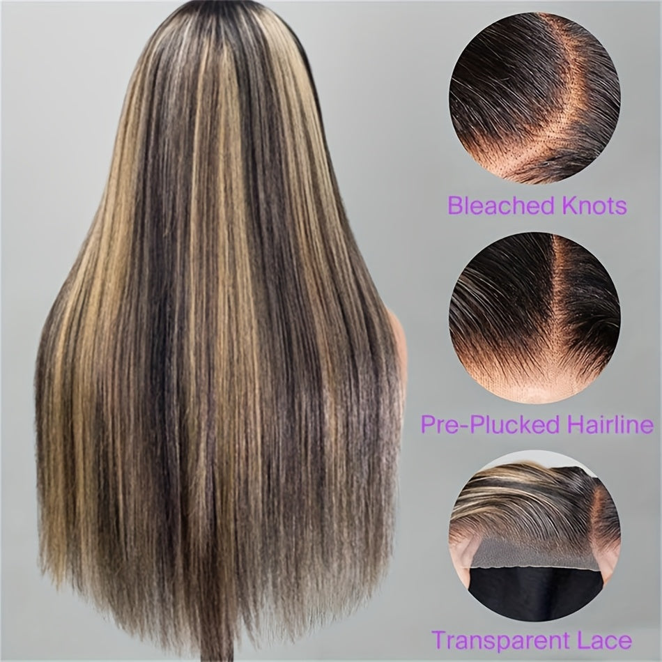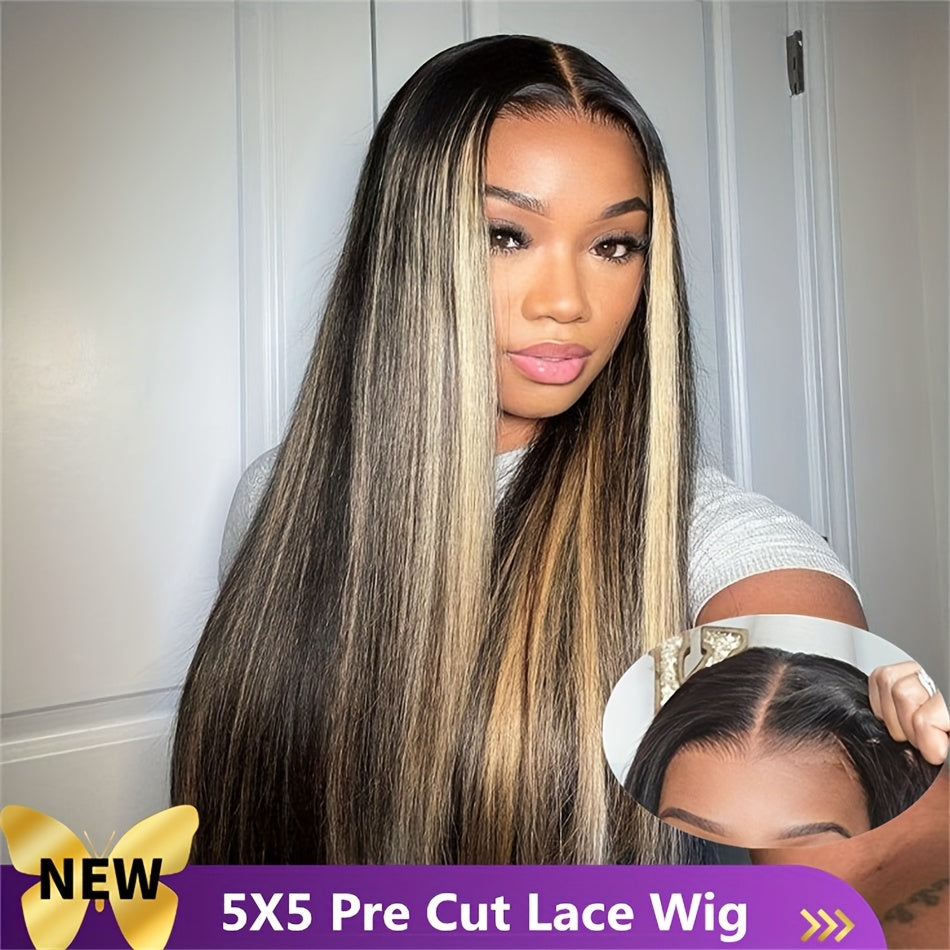 Luxurious 200% Density 5x5 Pre-Cut Lace Front Wig - Bone Straight Blonde Highlights, 100% Brazilian Virgin Human Hair, Natural Hairline, Glueless Design for Women, Ready to Use - Perfect for Everyday or Vacation Style