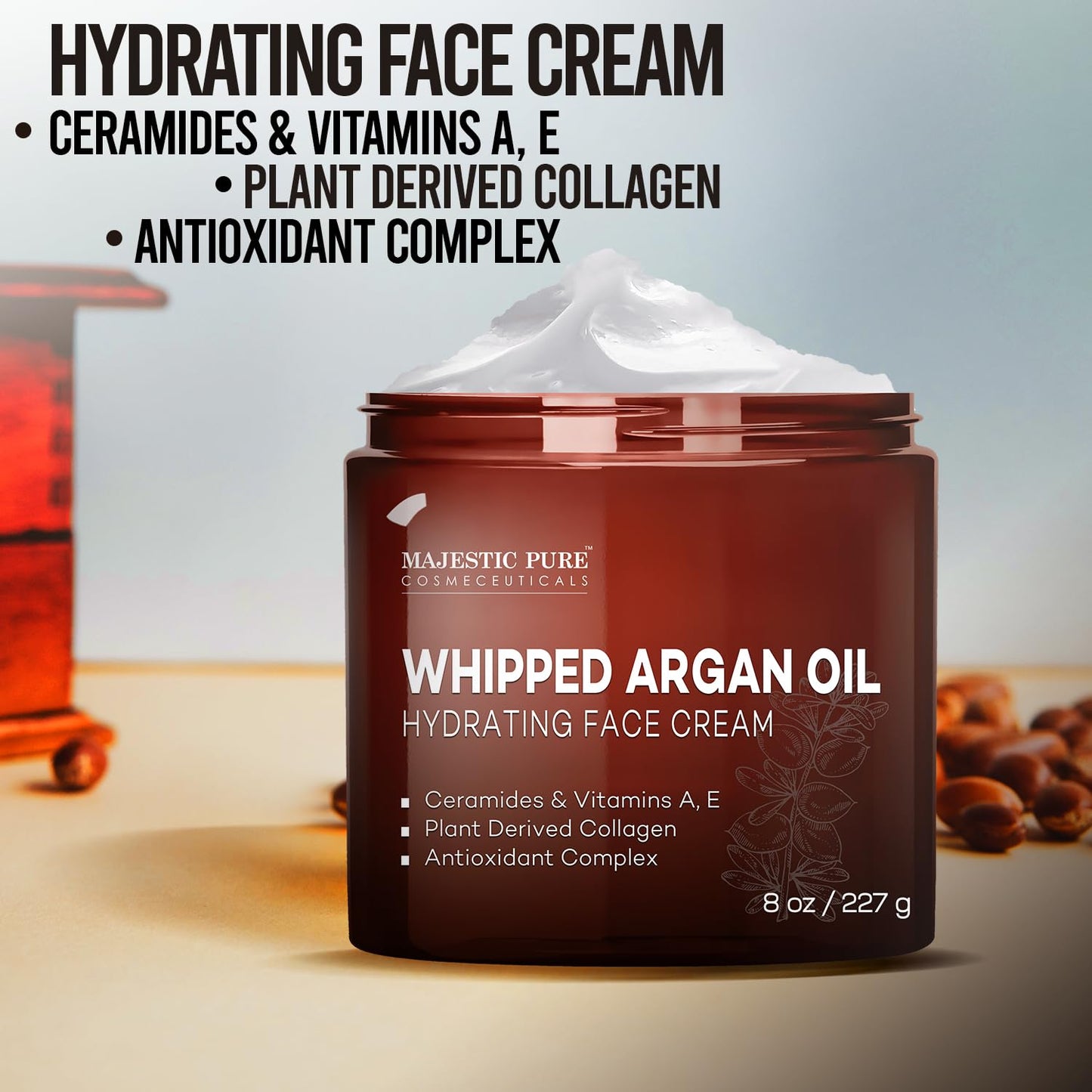 Majestic Pure Whipped Argan Oil Moisturizer Face Cream for Women & Men - With Vitamin E A, Collagen & Ceramides - Hydrates Dry Skin, Oily Skin, Reduces Appearance of Fine Lines – 8oz