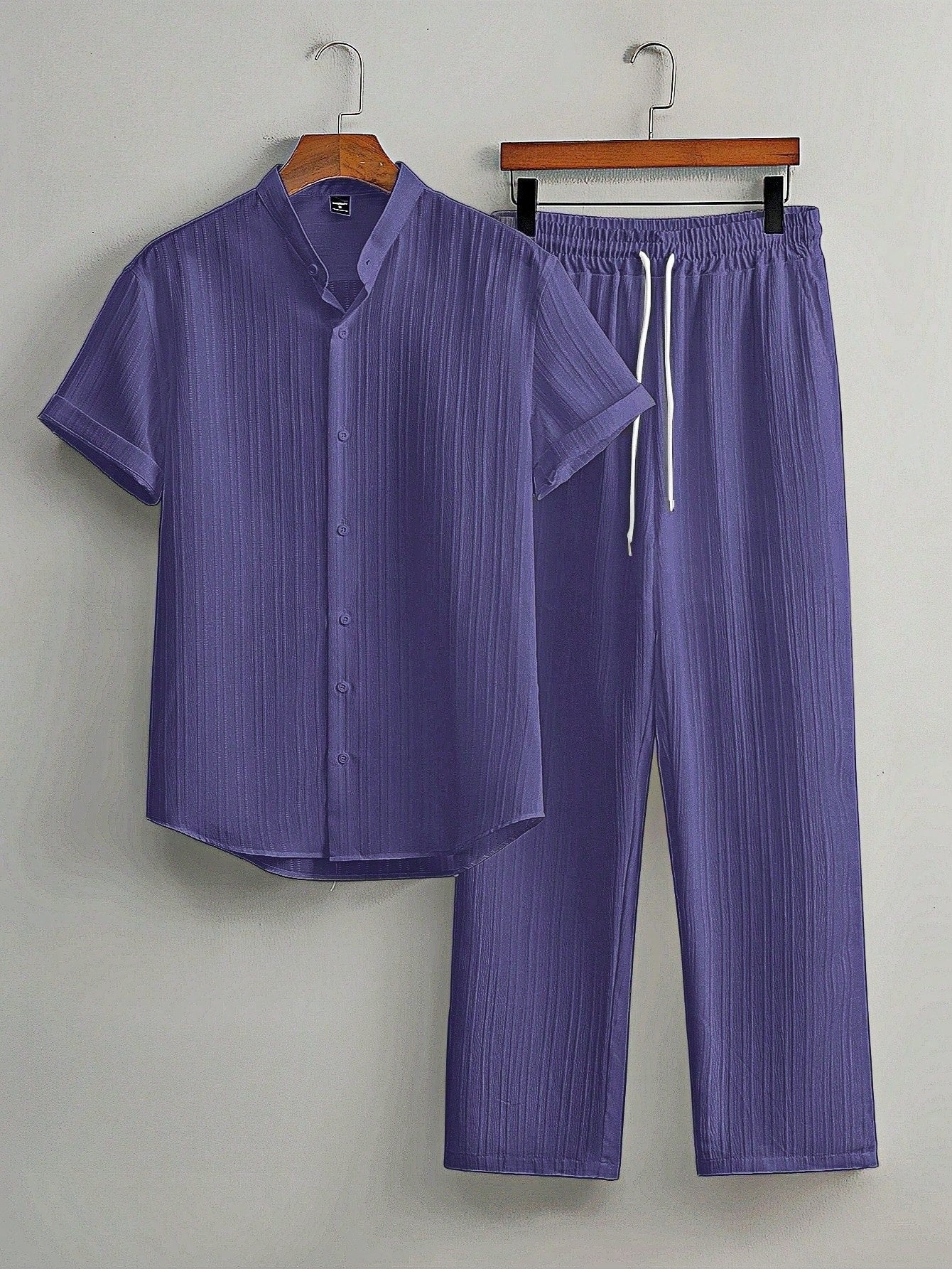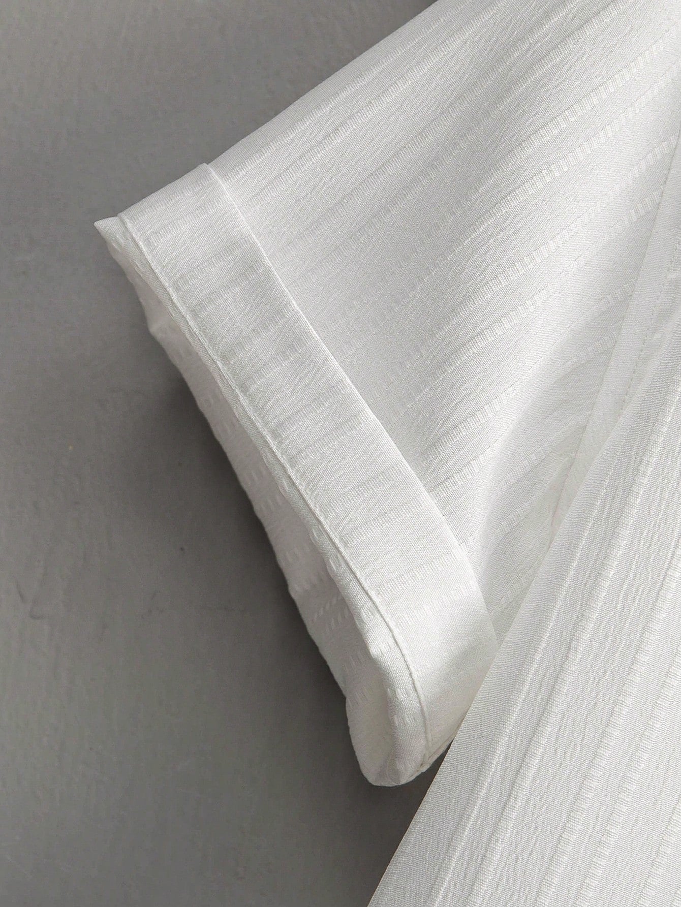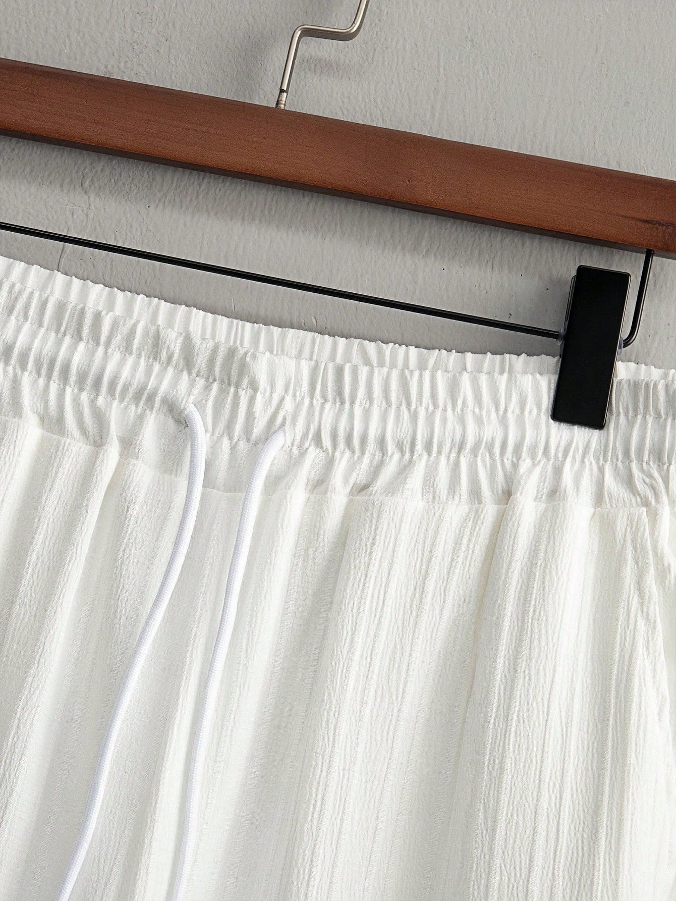 Manfinity Homme 2pcs Men Casual Solid Color Textured Short Sleeve Shirt And Drawstring Waist Loose Straight-Leg Pant Set,Men Two Piece Outfits,Fall And Winter Men Clothes,White Set