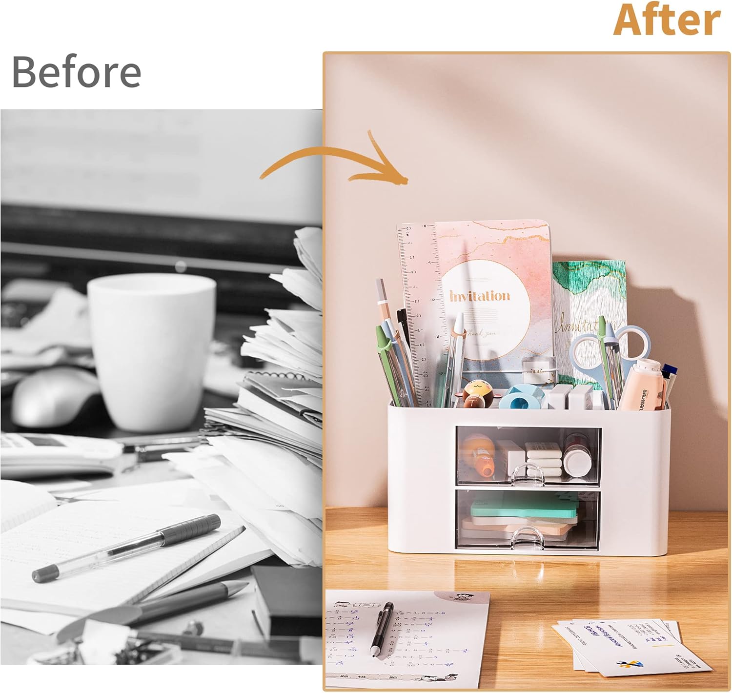 Marbrasse Pen Organizer with 2 Drawer, Multi-Functional Pencil Holder for Desk, Desk Organizers and Accessories with 5 Compartments + Drawer for Office Art Supplies (White)