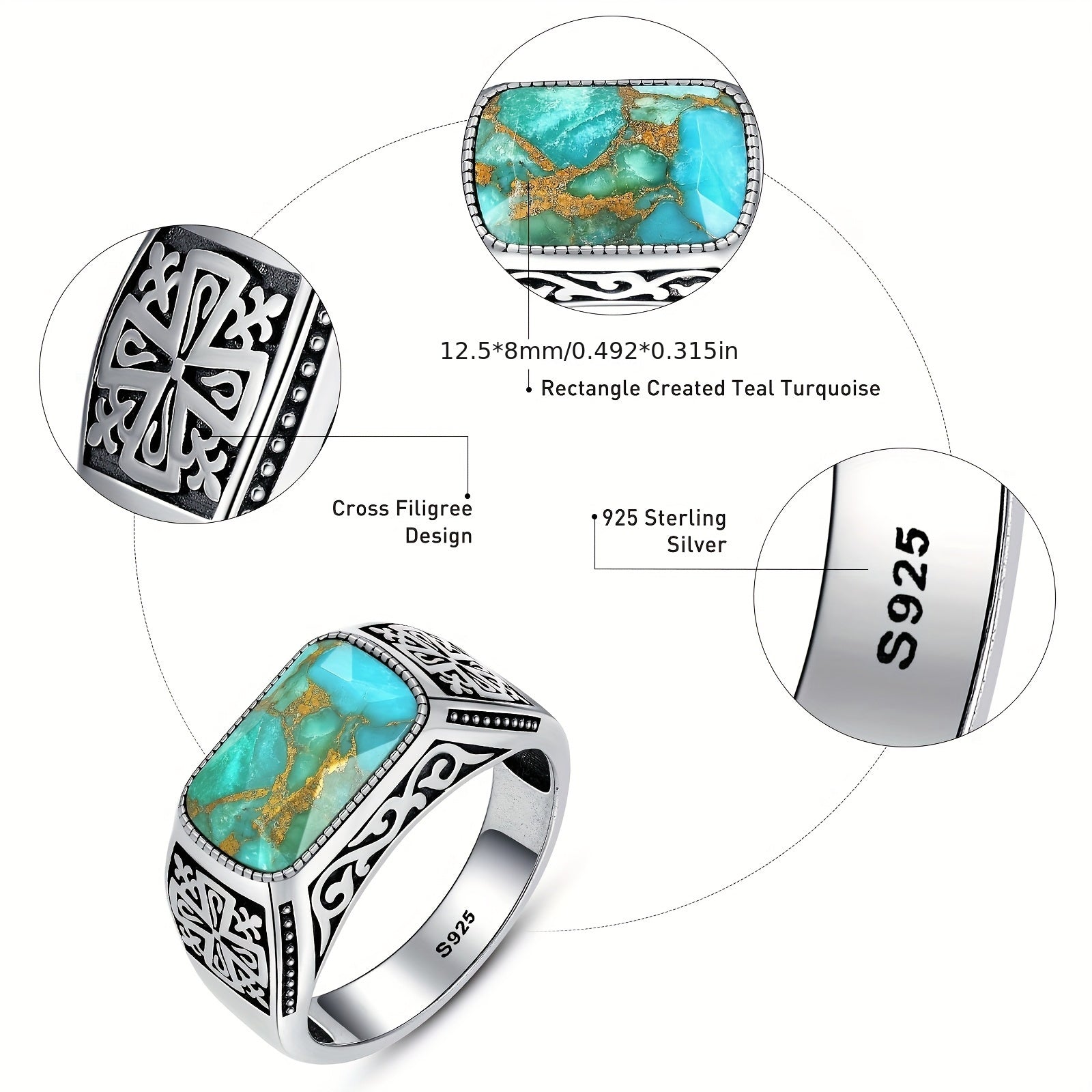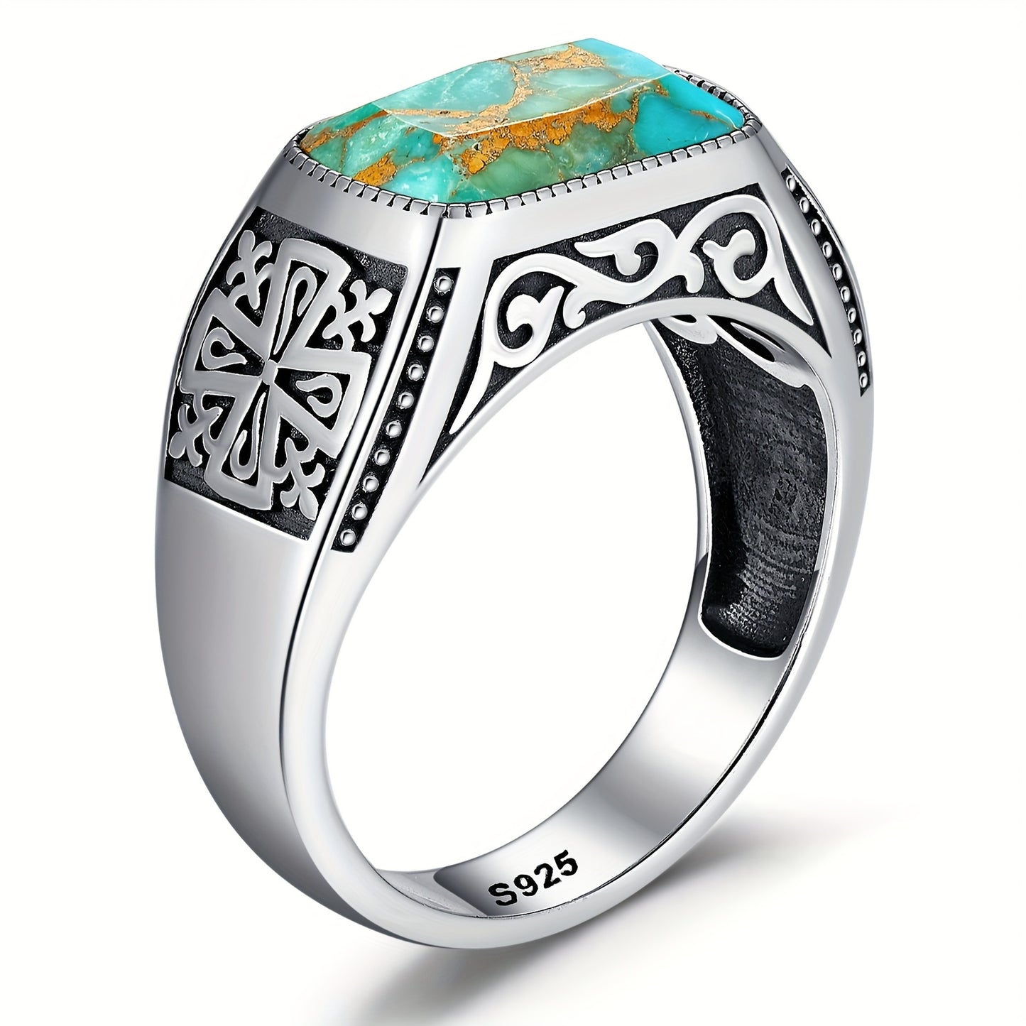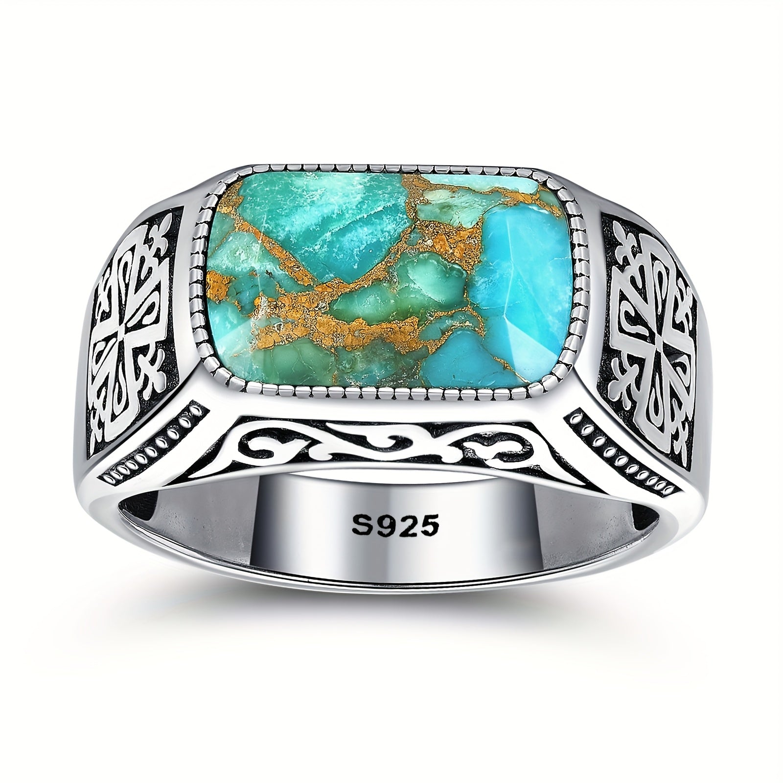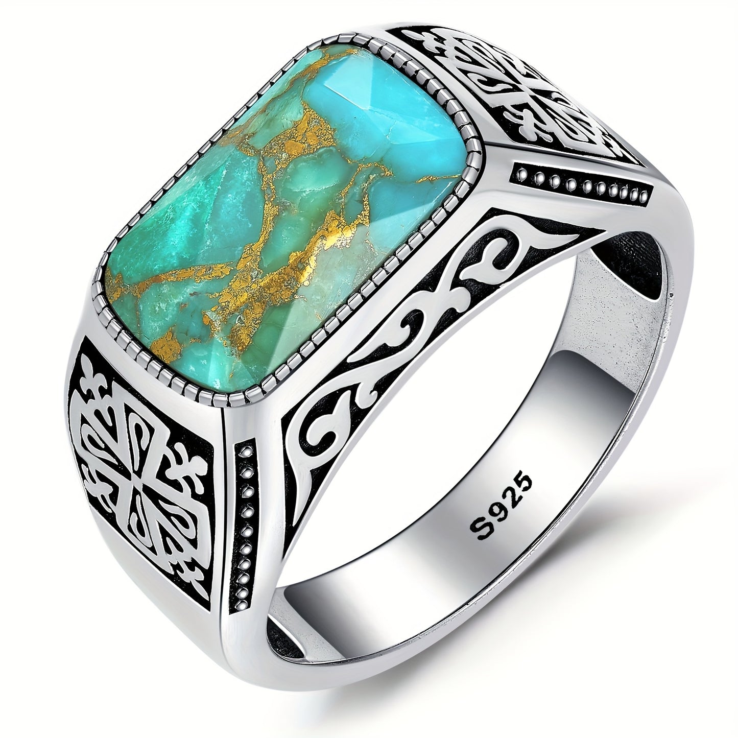 Men'S Blue Green Turquoise Ring 925 Sterling Silveryy Men'S Ring, Men'S Turquoise Ring with Inlay Fashion Ring Jewelry Gift for Father Size 8-1