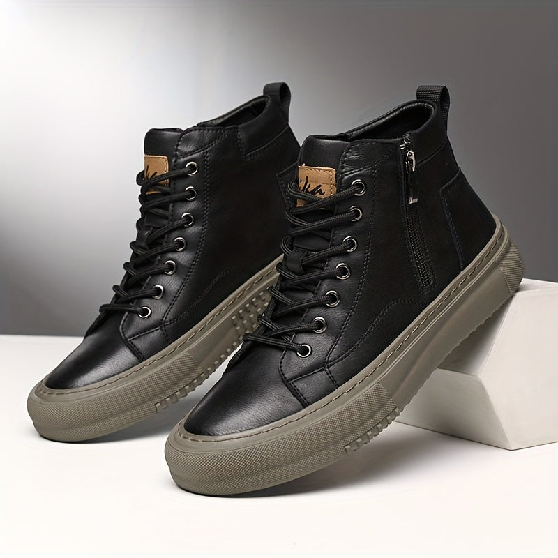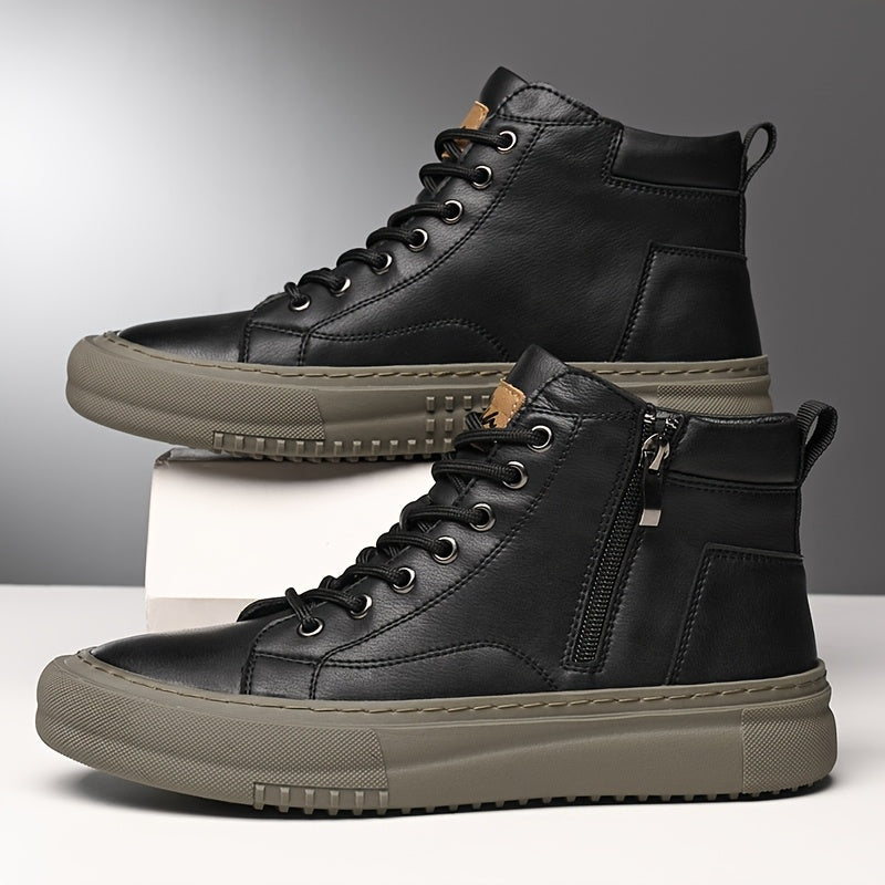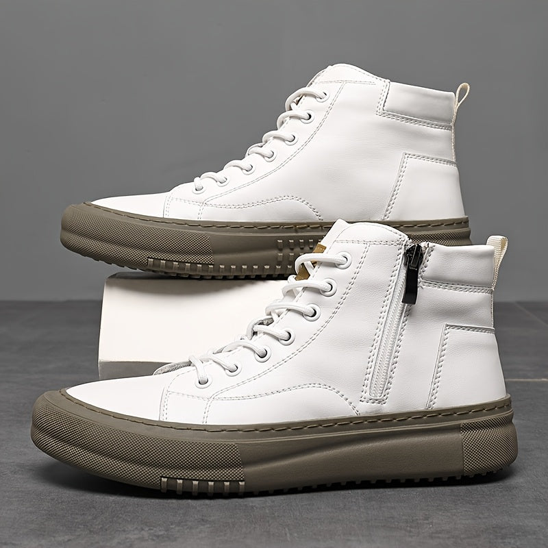 Men's Fashion High-Top Sneakers with Side Zipper, Casual Sports Shoes, White and Olive Green, Durable Rubber Sole, Comfortable PU Lining, Chunky Shoes
