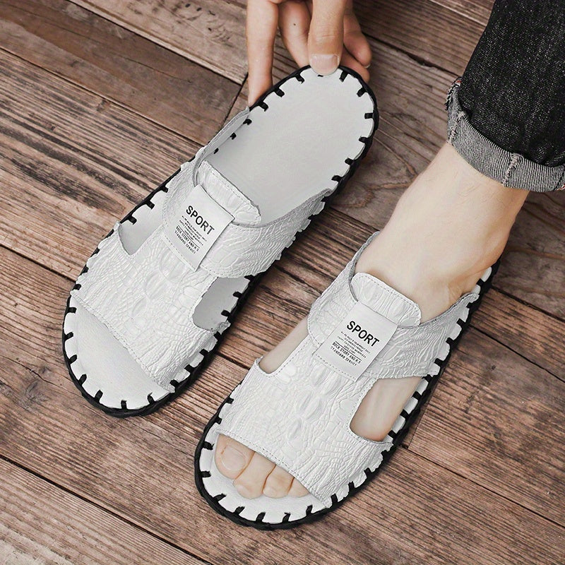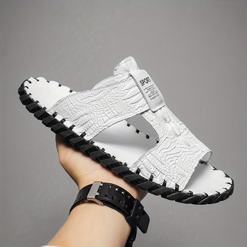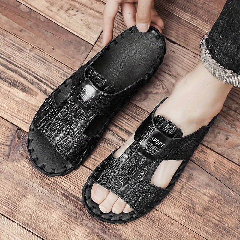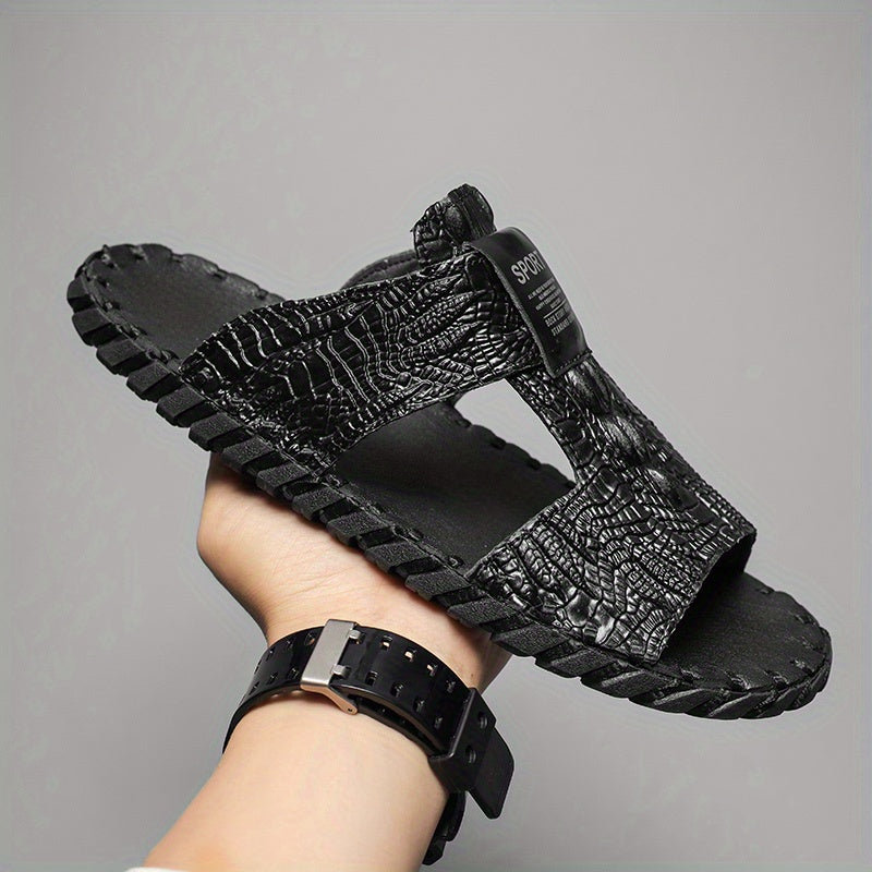 Men's Hand-Stitched Crocodile-Textured PU Slide Sandals - Slip-On Rubber Sole, Lightweight Beach & Urban Streetwear, Retro Casual Summer Shoes for Outdoor Activities, Crisscross Strap Design