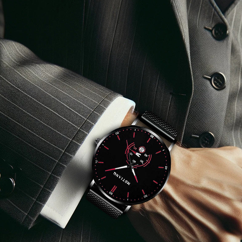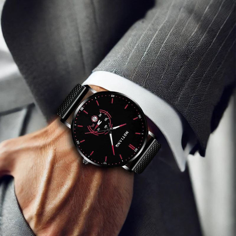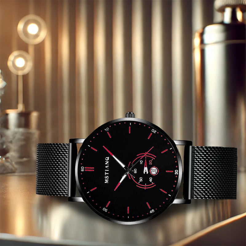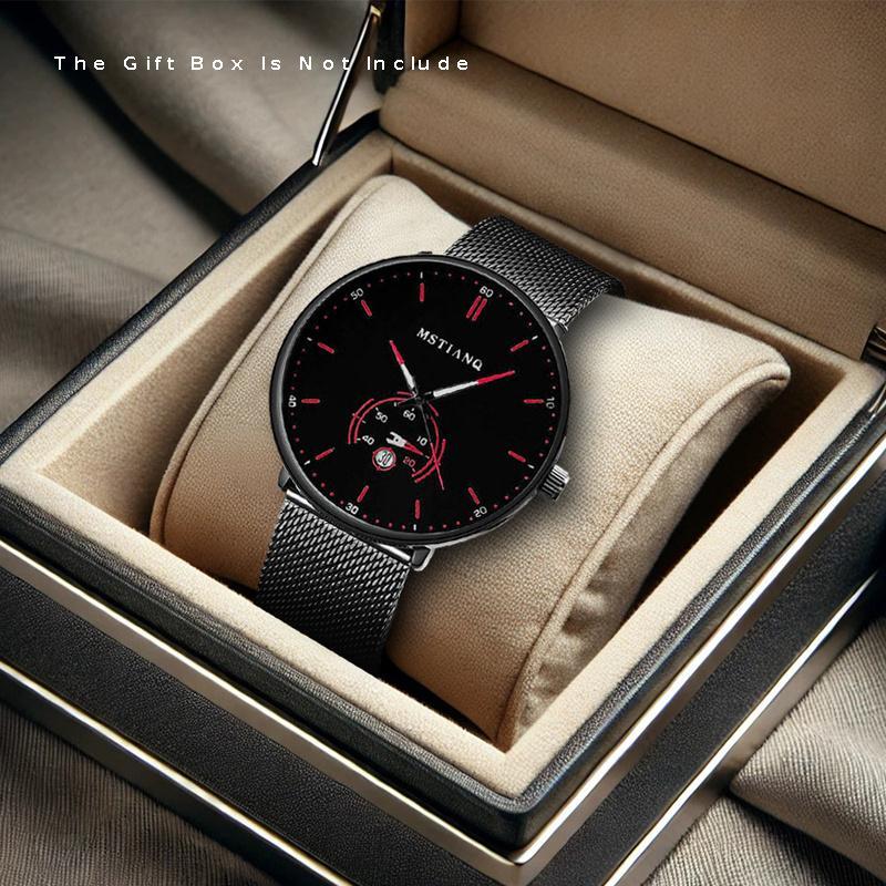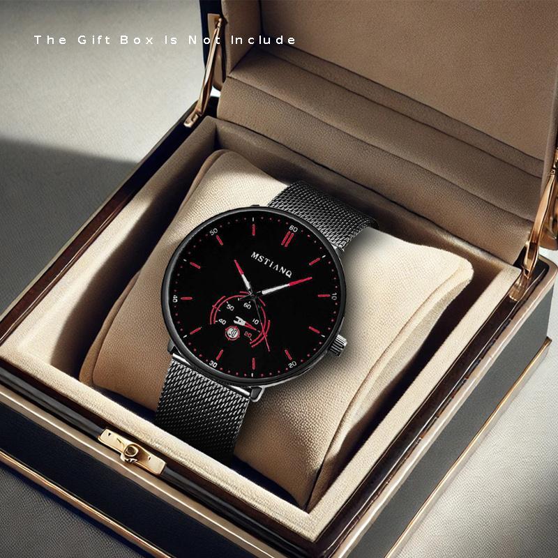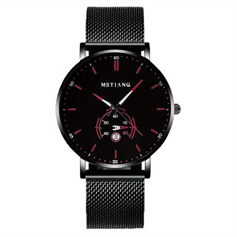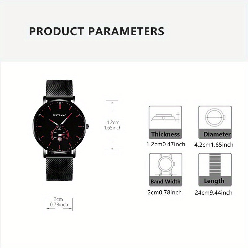 [Men's Mesh Strap Quartz Watch] 1pcs Men's Black and Red Mesh Strap Quartz Watch - Novel Car Disk, Night Light Calendar, Personalized Style