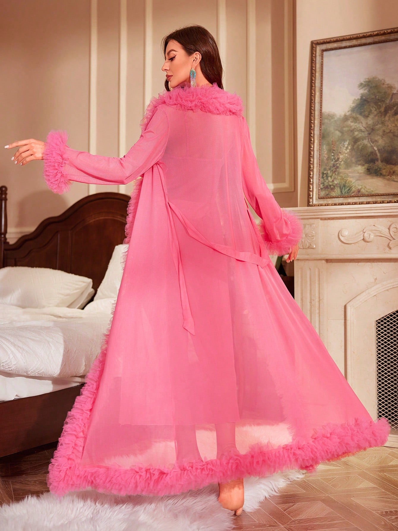 Mesh Trim Belted Robe & Mesh Dress PJ Set / Pajama Set