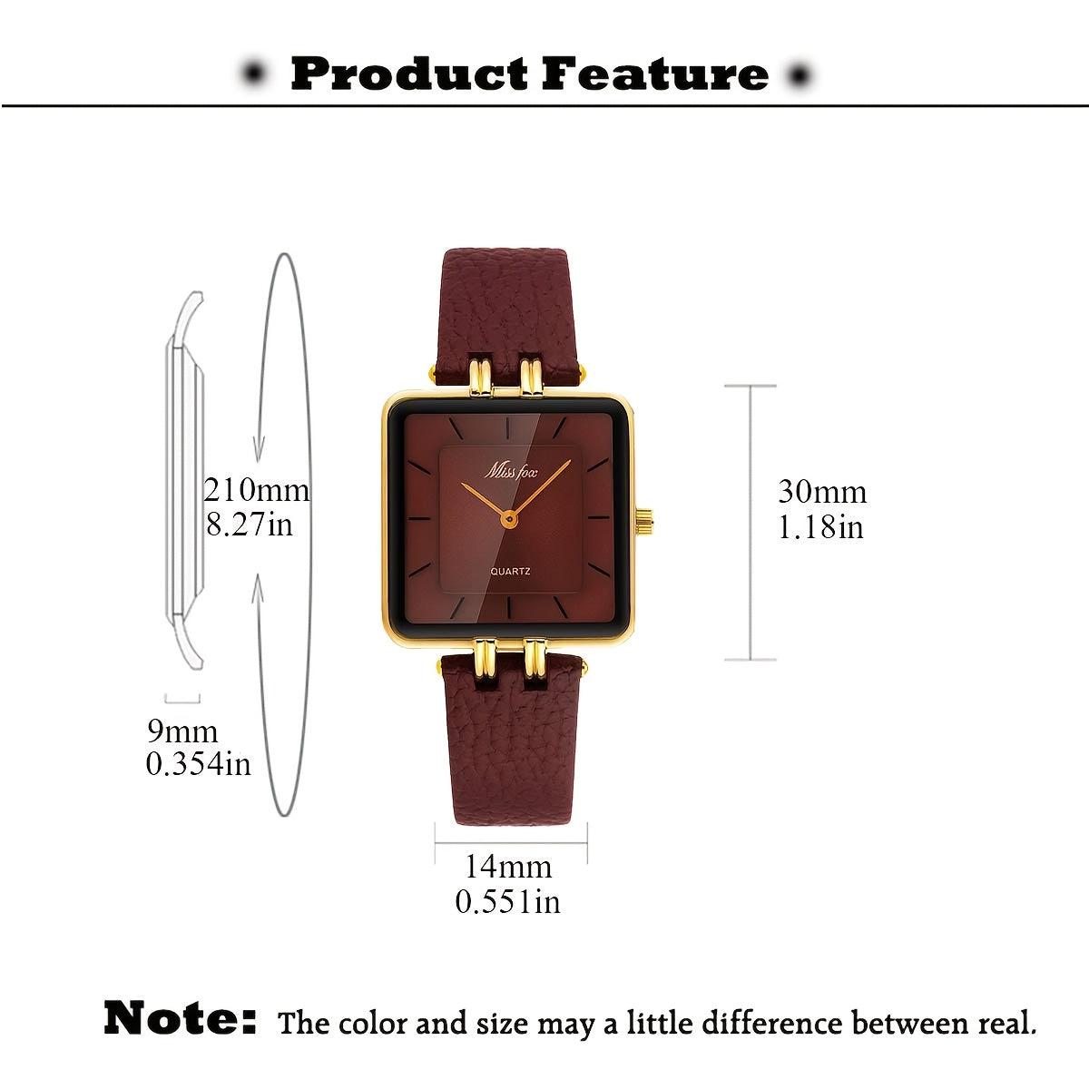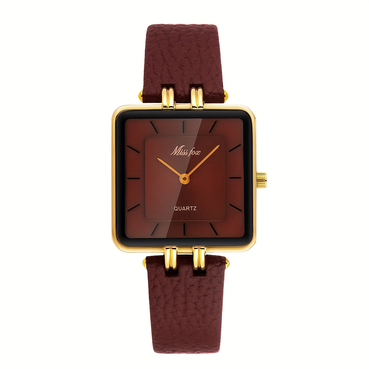 MISSFOX Luxury Square Burgundy Quartz Watch for Women, Vintage Style, Water-Resistant, Alloy Case, Genuine Strap, MISSFOX