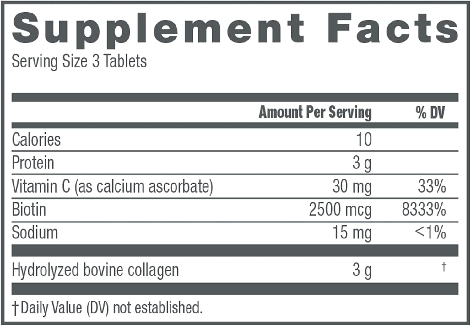 BIOTIN AND VITAMIN C TABLETS: Collagen supplement with biotin to help support healthy hair and nails, plus essential vitamin C for antioxidant support and to promote healthy collagen formation (1)
