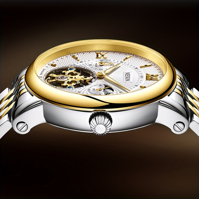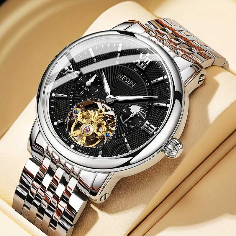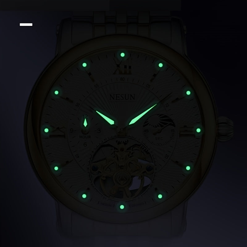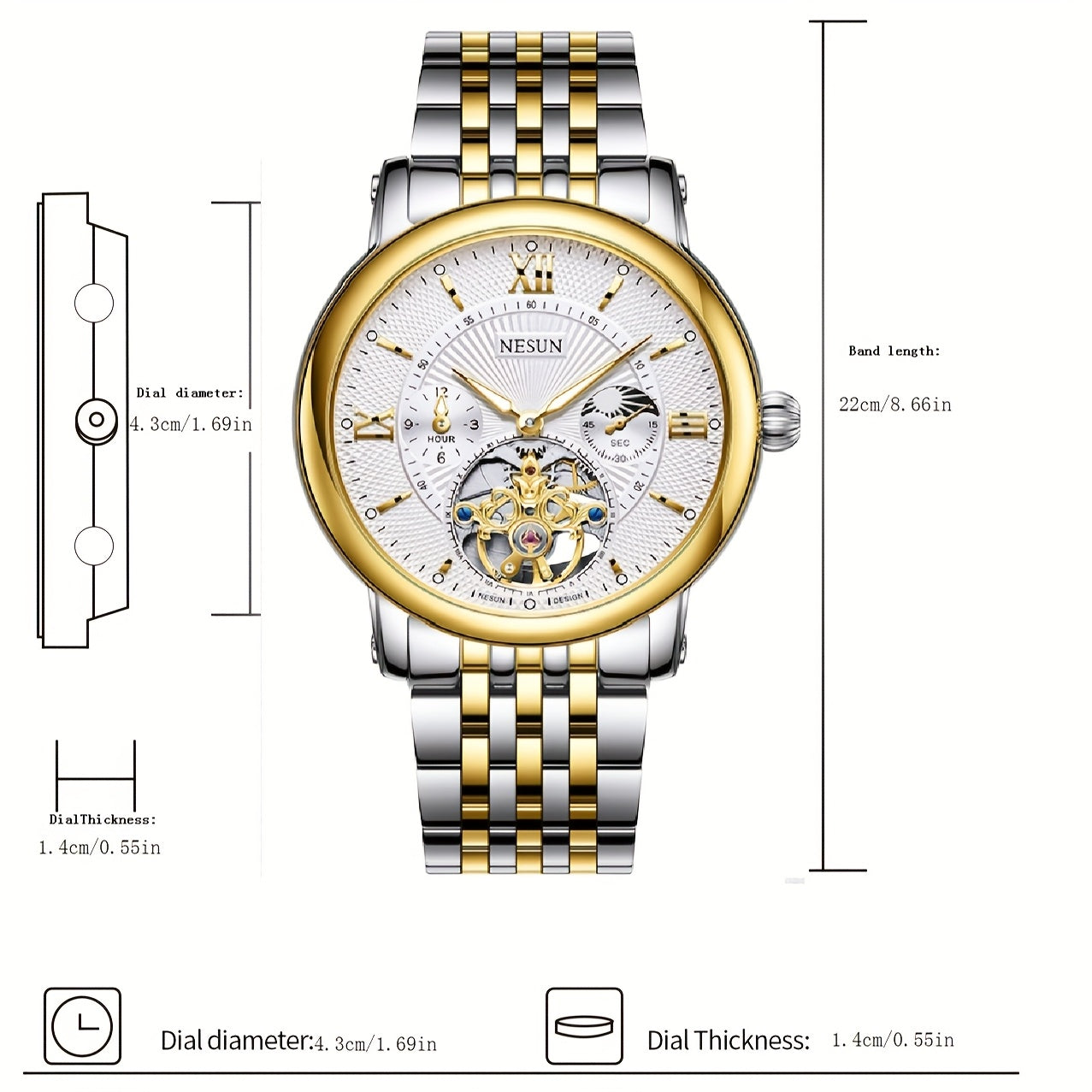 NESUN Automatic Mechanical Men'S Watch - Luminous Stainless Steel, Multi-Functional Business Style with Date Display, Golden-Tone Case & Bracelet, Round Dial, Mechanical Movement, No Battery Needed, Perfect for Christmas & Thanksgiving Gifts, Business Cas