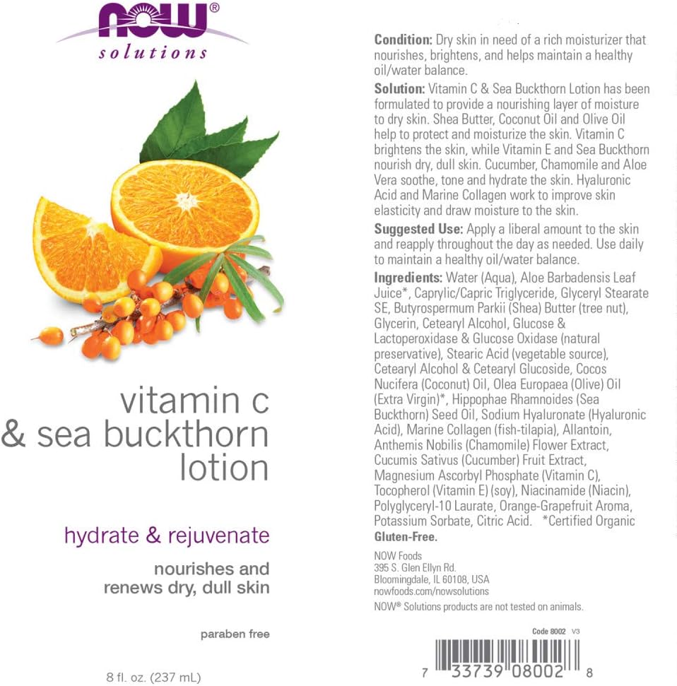 NOW Foods Solutions, Vitamin C and Sea Buckthorn Lotion, Hydrates, Repairs and Nourishes Dry Dull Skin, 8-Ounce