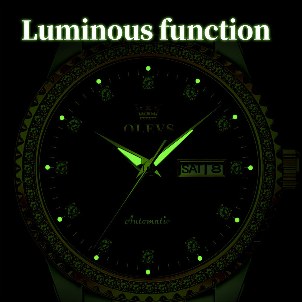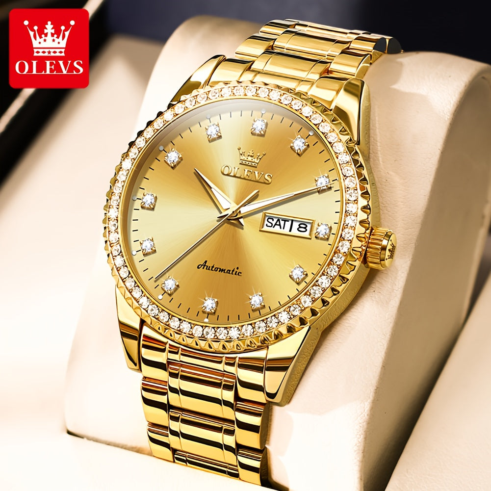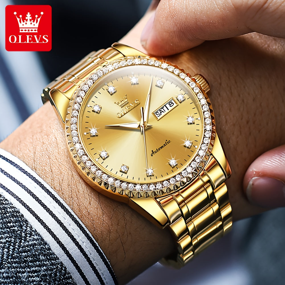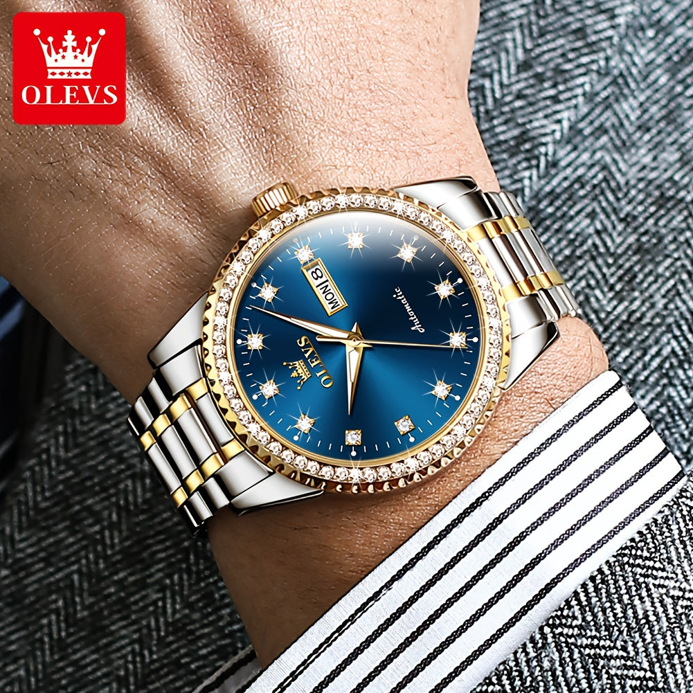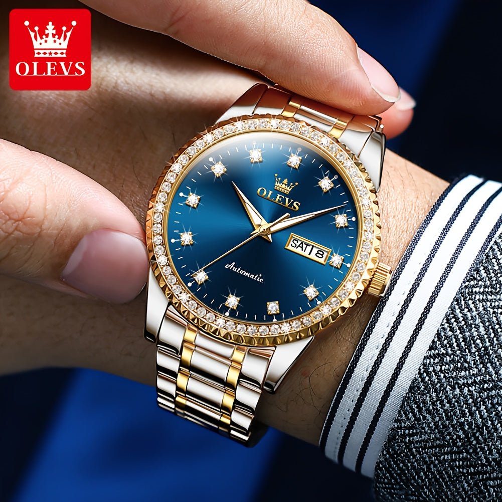 OLEVS Luxury Men's Automatic Mechanical Watch - Stainless Steel Blue Dial with Golden Markers, Luminous Hands, Dual Calendar/Date, Day/Date Display, -Accented Bezel & Elegant Strap - Business & Everyday Wristwatch for Formal & Casual Occasions