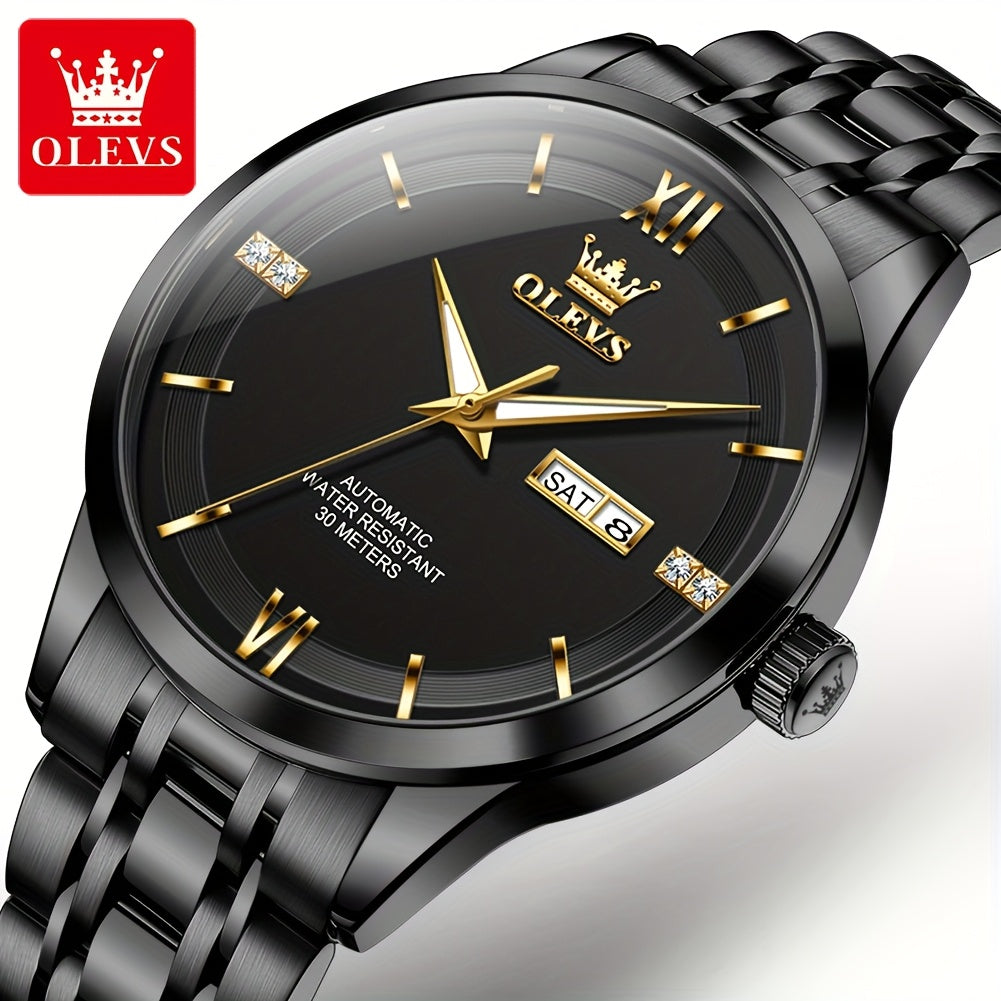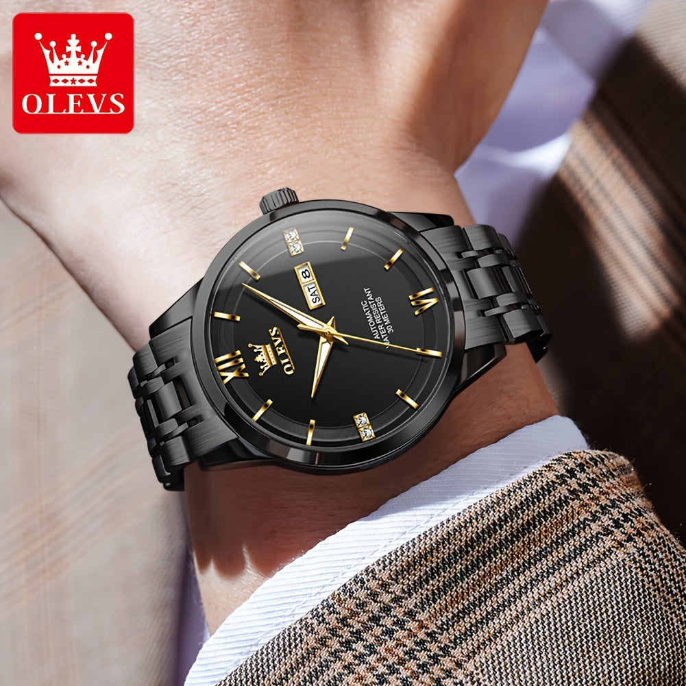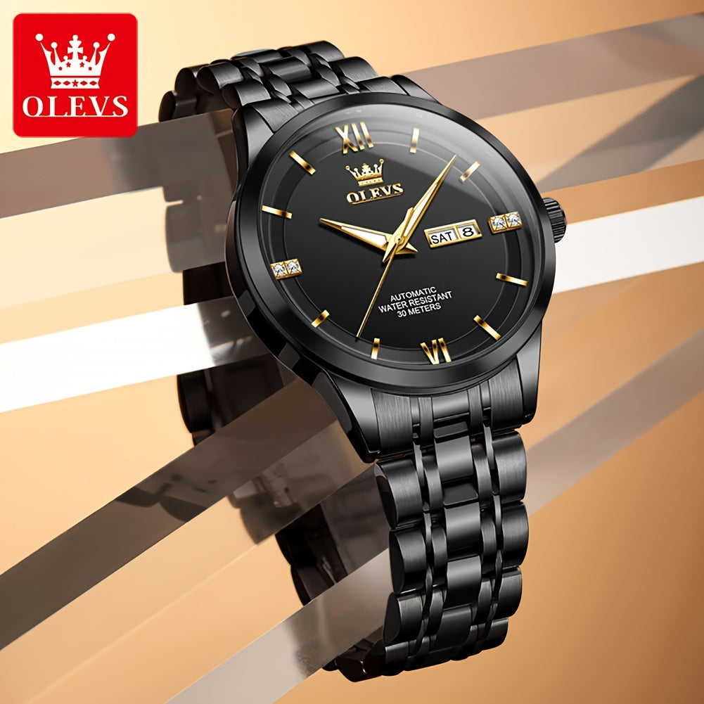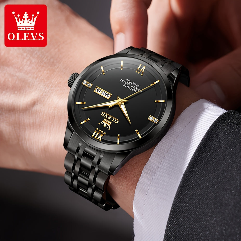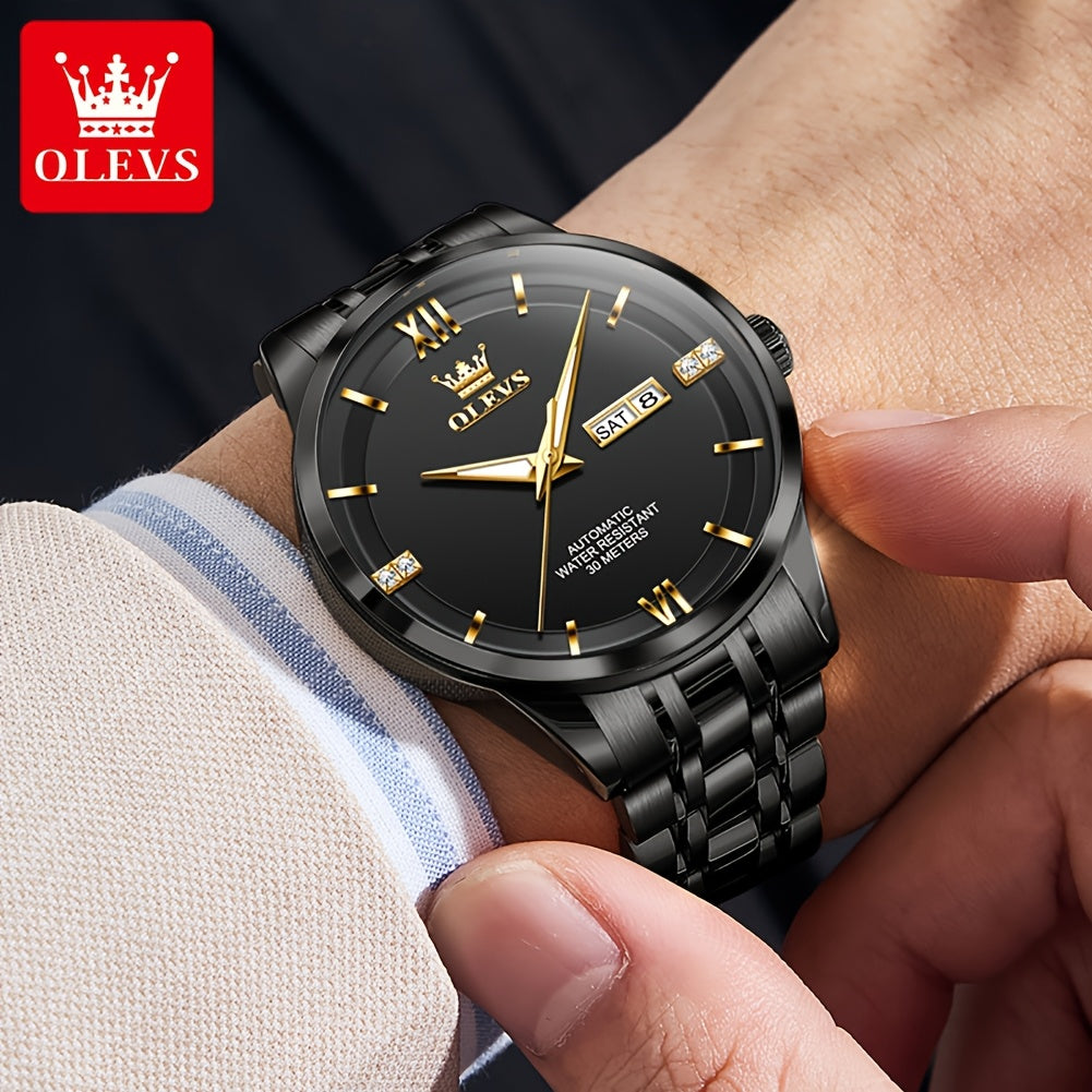 OLEVS Men's Automatic Mechanical Watch with Luminous Black Dial, Golden Accents, Date & Day Display, Stainless Steel Business Casual Dress Watch for Formal & Casual Attire, Professional Wristwatch, Stylish Wristwatch, Highquality Watch, Luxury Wristwatch,