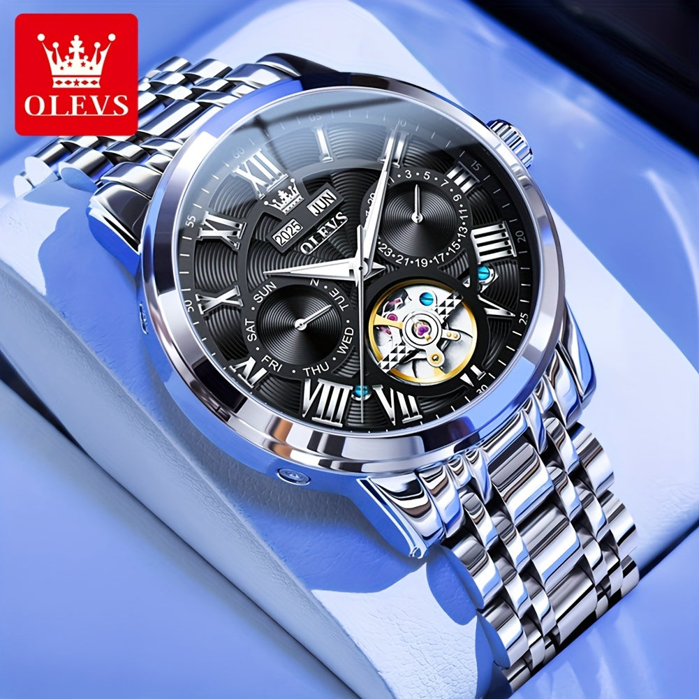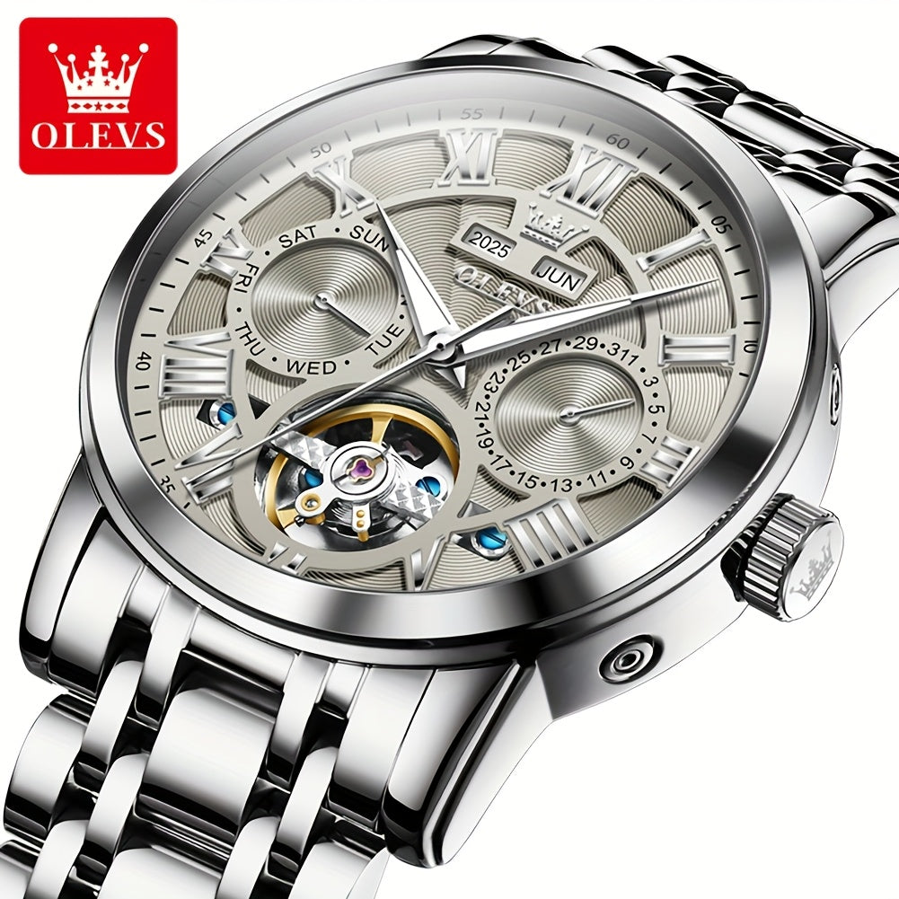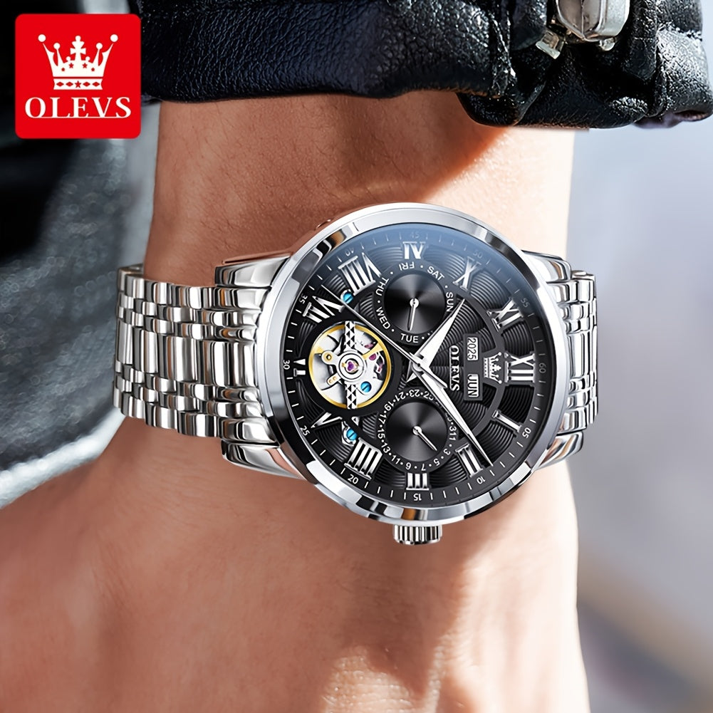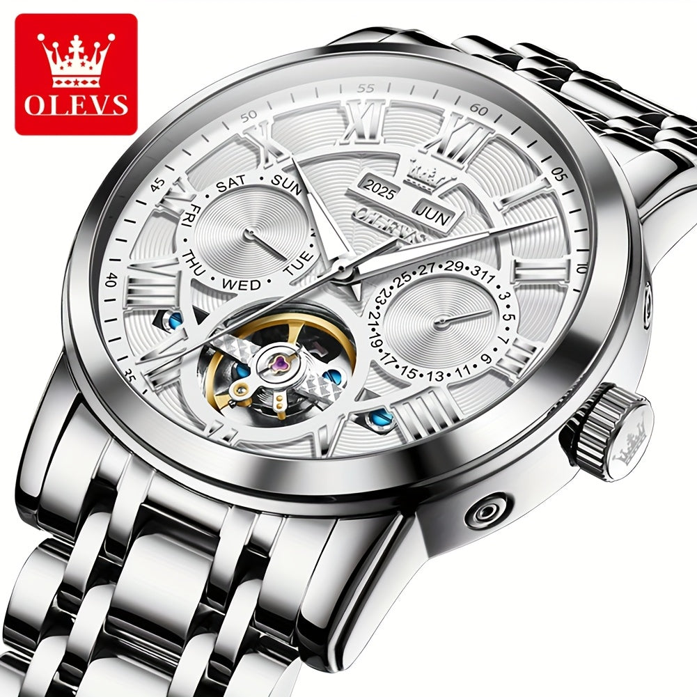 OLEVS Men's Luminous Automatic Mechanical Watch - Stainless Steel Business Casual Watch with Date & Day Display, Roman Numerals & Skeleton Dial, Luxury Dress Watch for Formal & Casual Attire, Professional Timepiece, Polished Finish