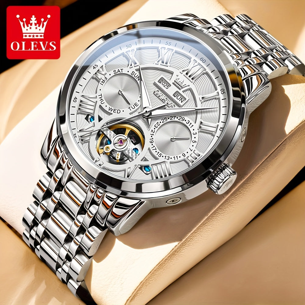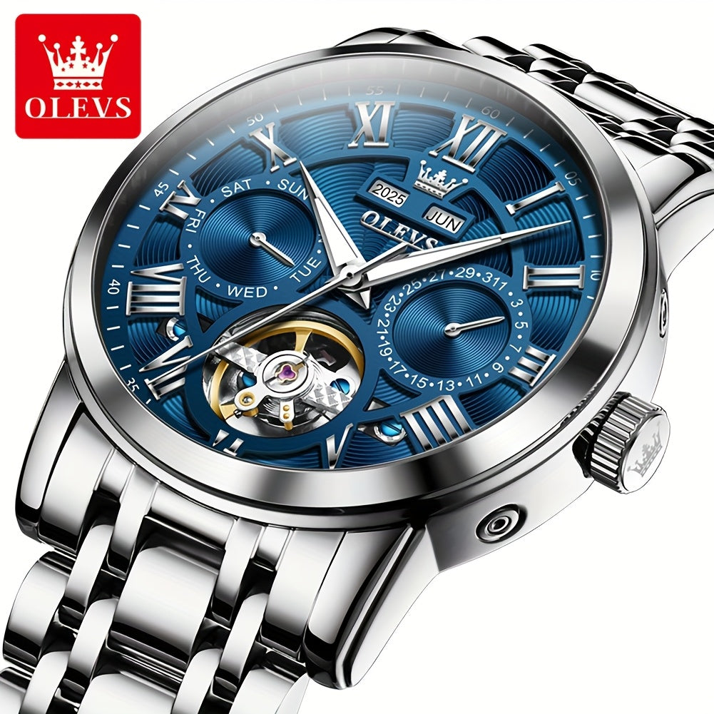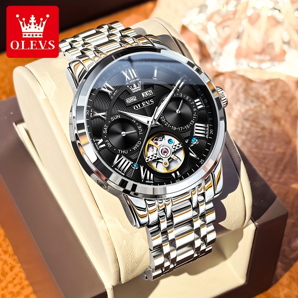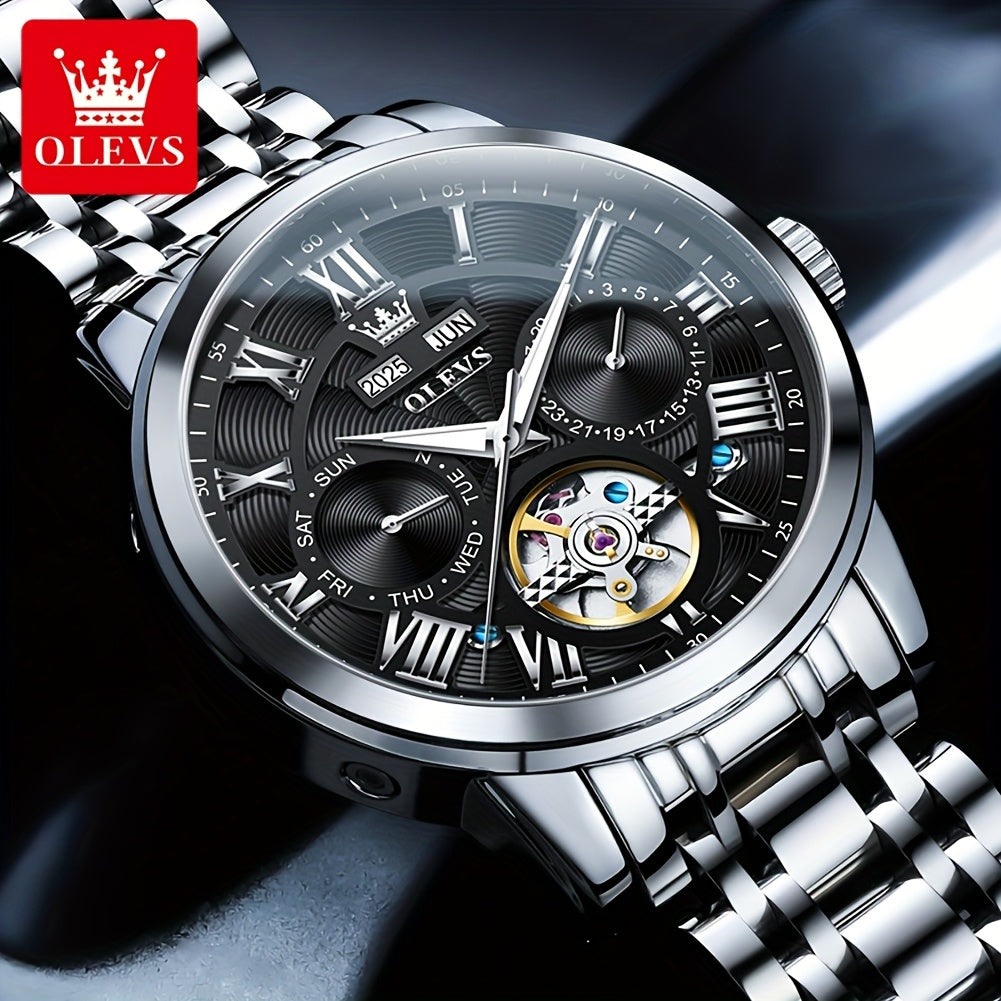 OLEVS Men's Luminous Automatic Mechanical Watch - Stainless Steel Business Casual Watch with Date & Day Display, Roman Numerals & Skeleton Dial, Luxury Dress Watch for Formal & Casual Attire, Professional Timepiece, Polished Finish