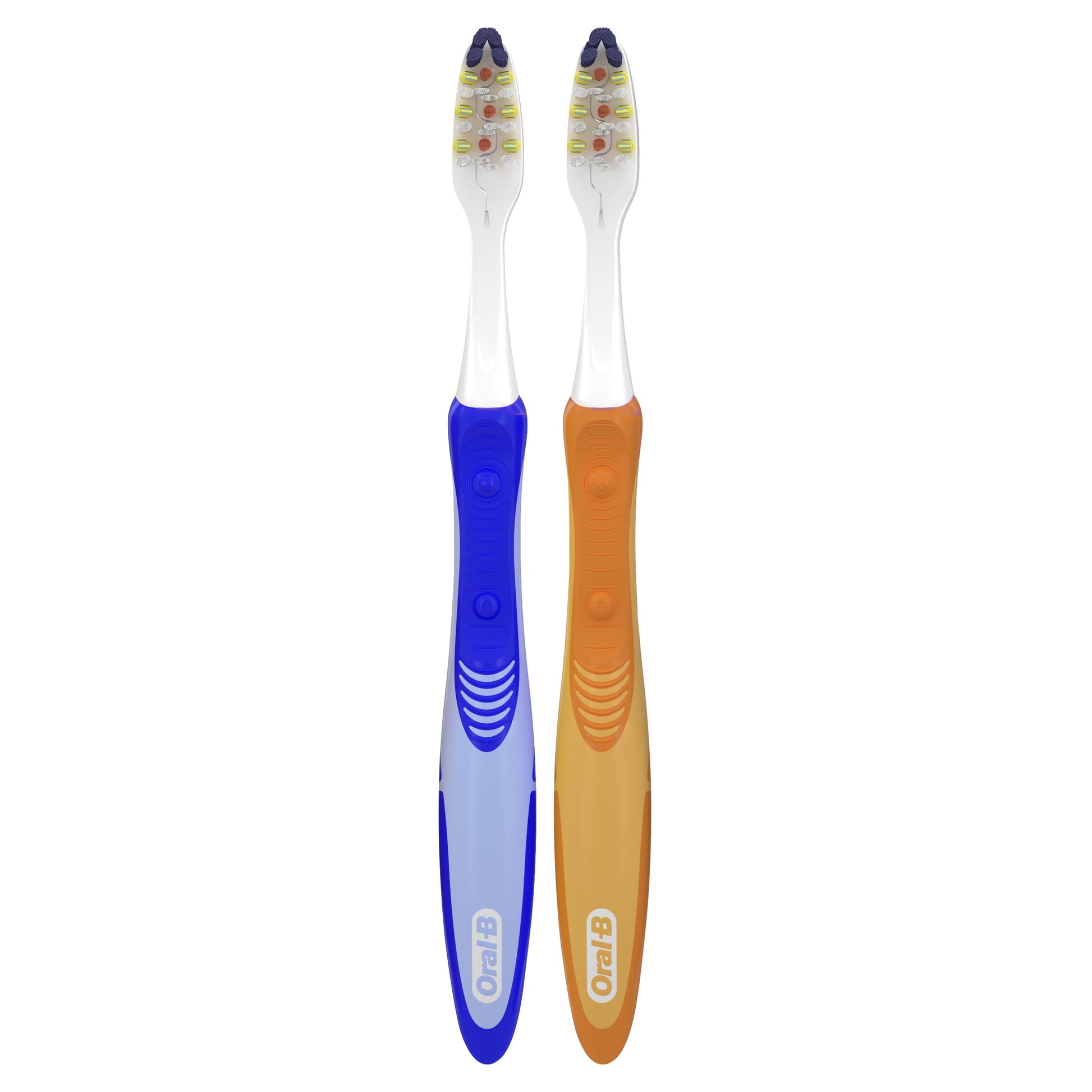 - Toothbrush pack with vibrating bristles helps break up plaque between teeth