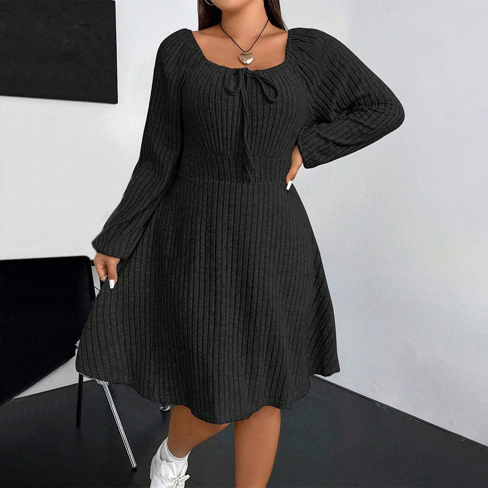 Plus Size Autumn Winter Women Clothing Square Collar Long Sleeve Waist Mini Fleece Sunken Stripe Dress