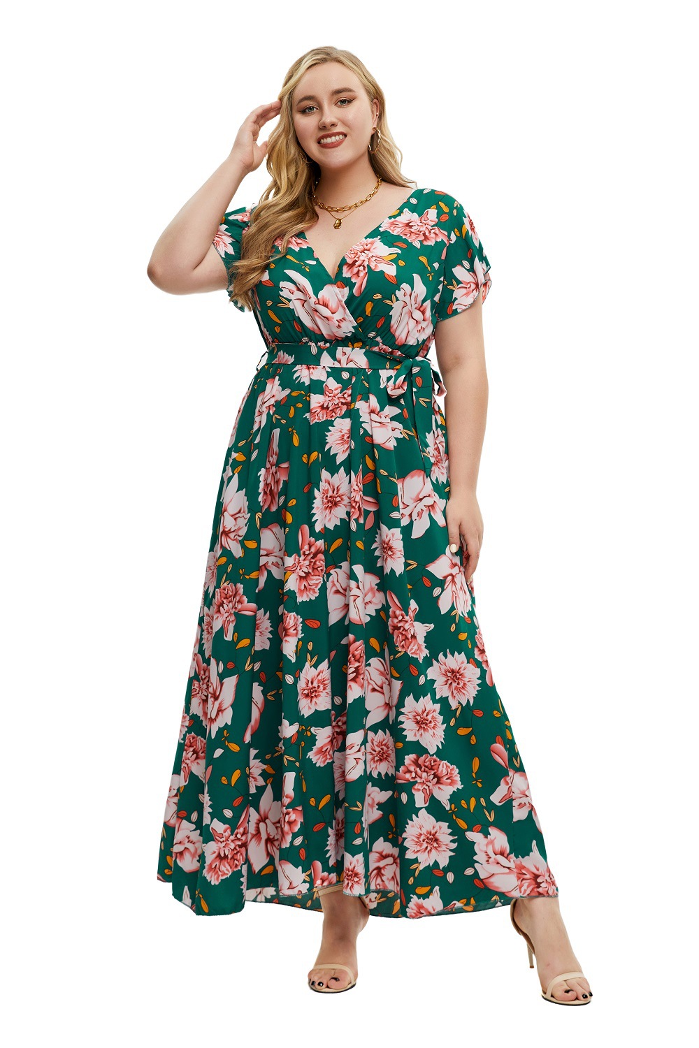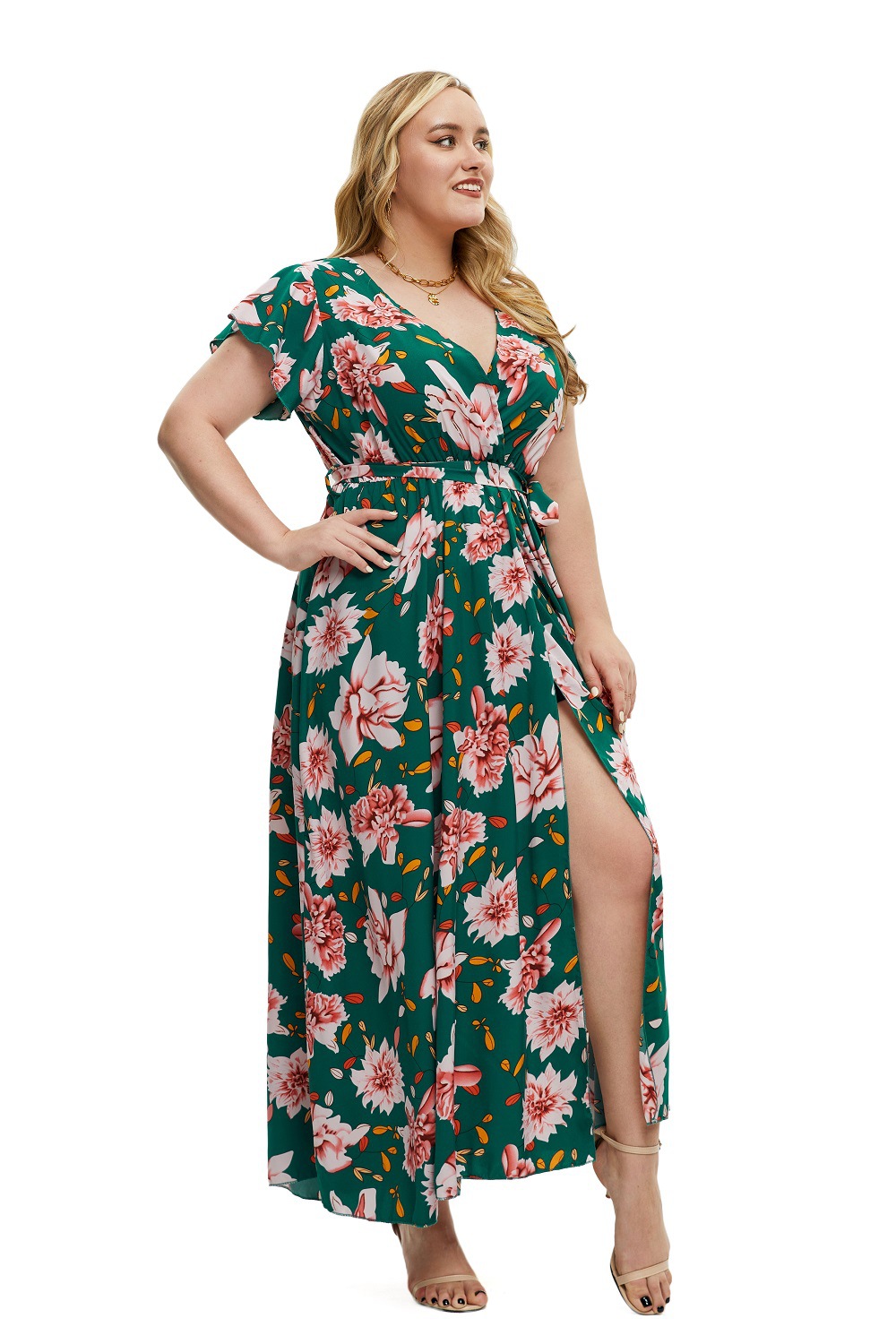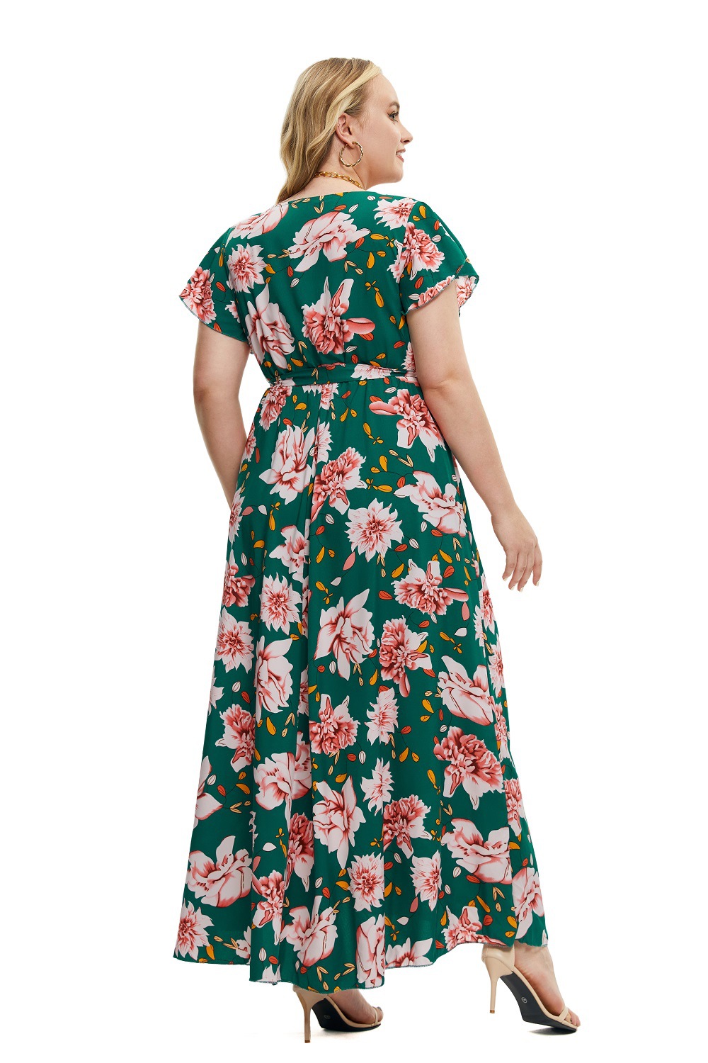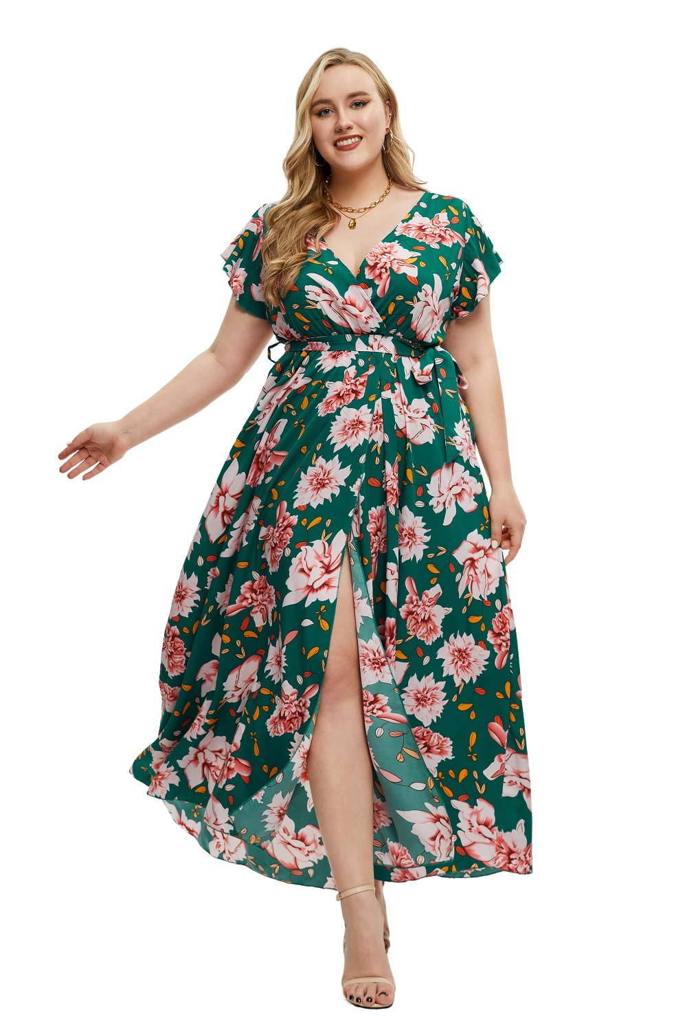 Plus Size Women Clothes Summer Short Sleeve Floral Print Slit Dress