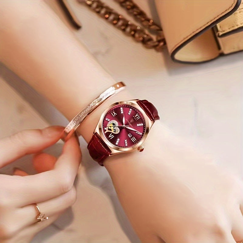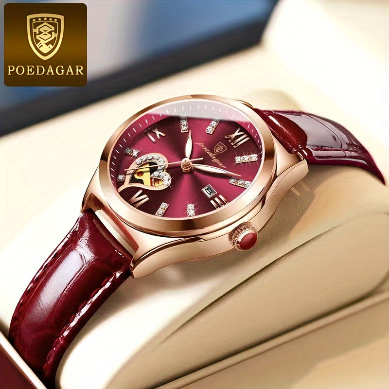 POEDAGAR Women's Elegant Quartz Watch with Luminous Hands,, Genuine PU Leather Strap, Rose Golden Case, Roman Numerals & Gemstone Accents - Stylish Casual Wear for Teens and Ladies