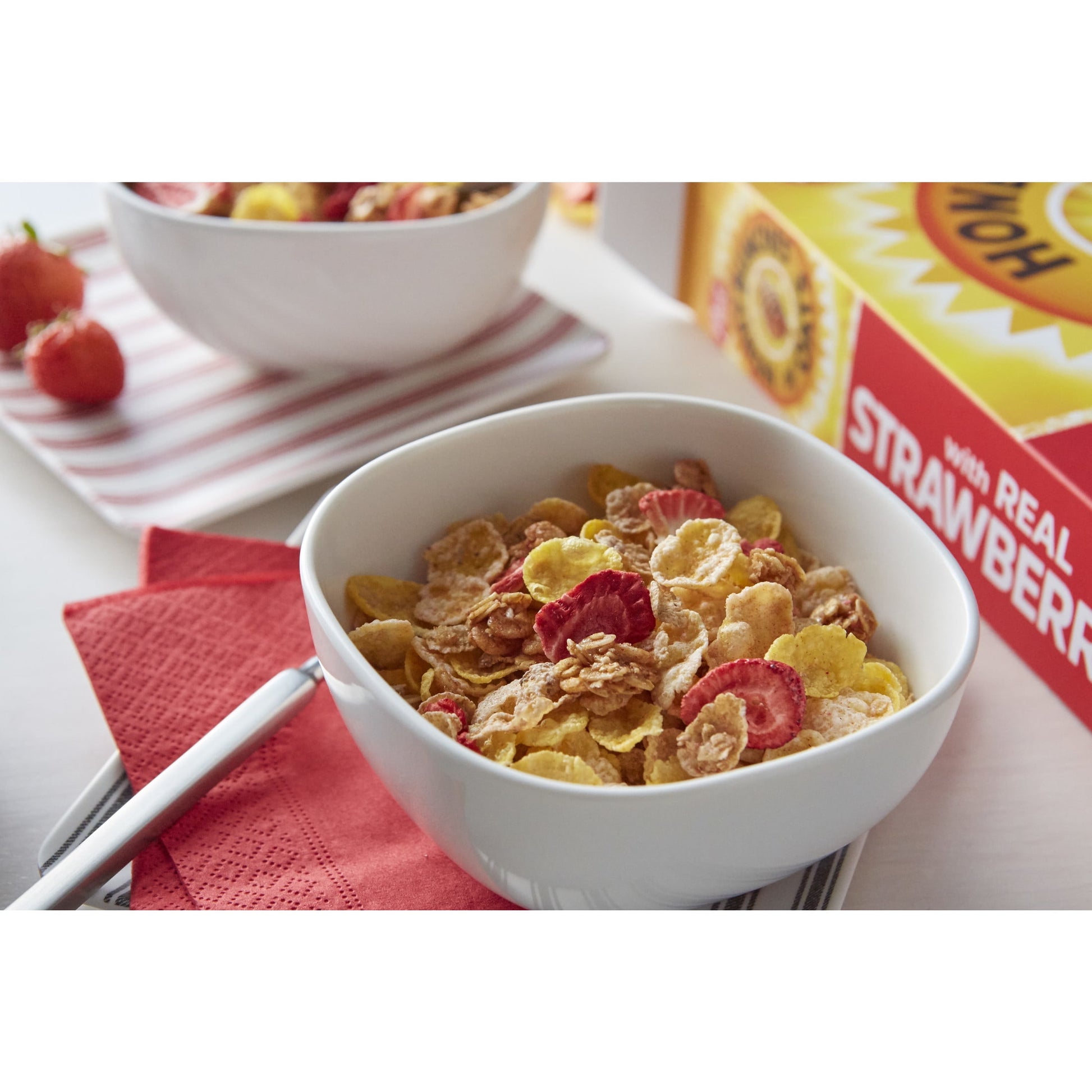 - Help start your mornings feeling energized and enjoy this honey cereal filled with crispy corn flakes, granola clusters and real strawberry slices in an instant