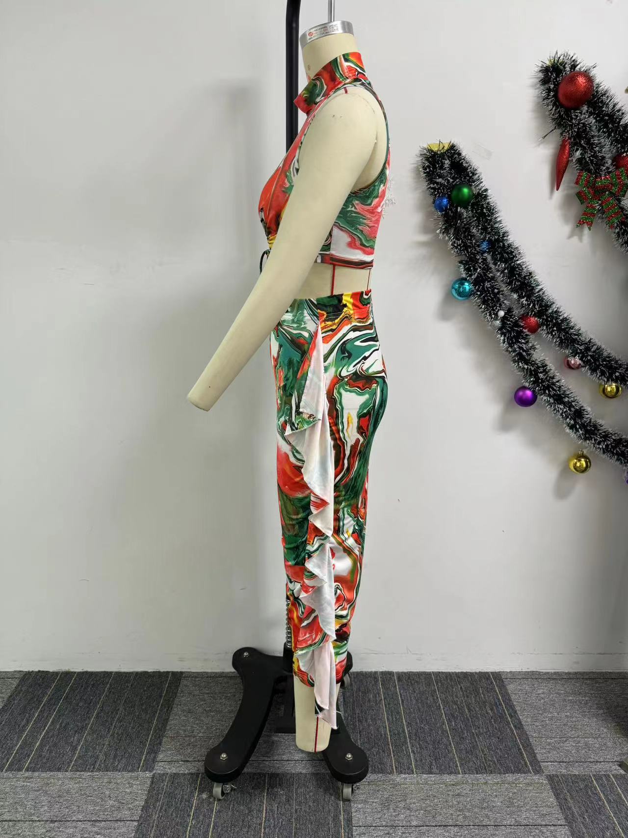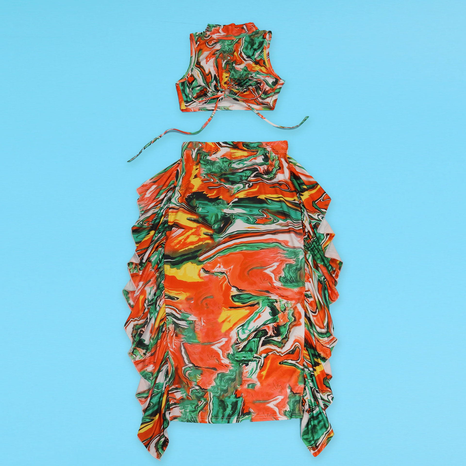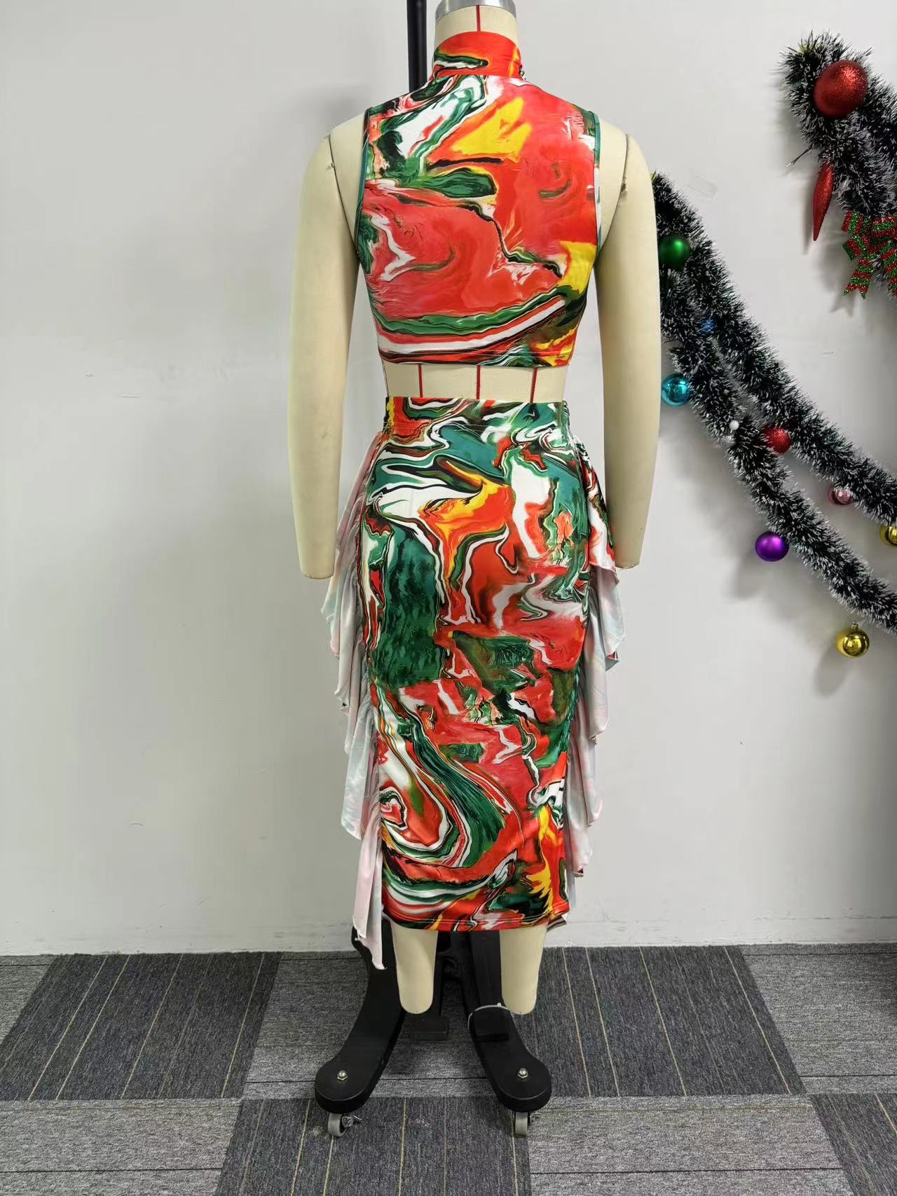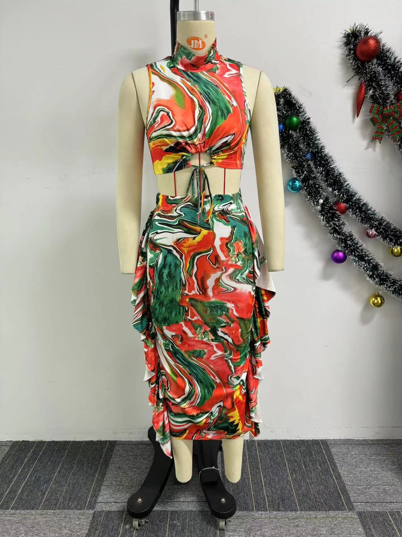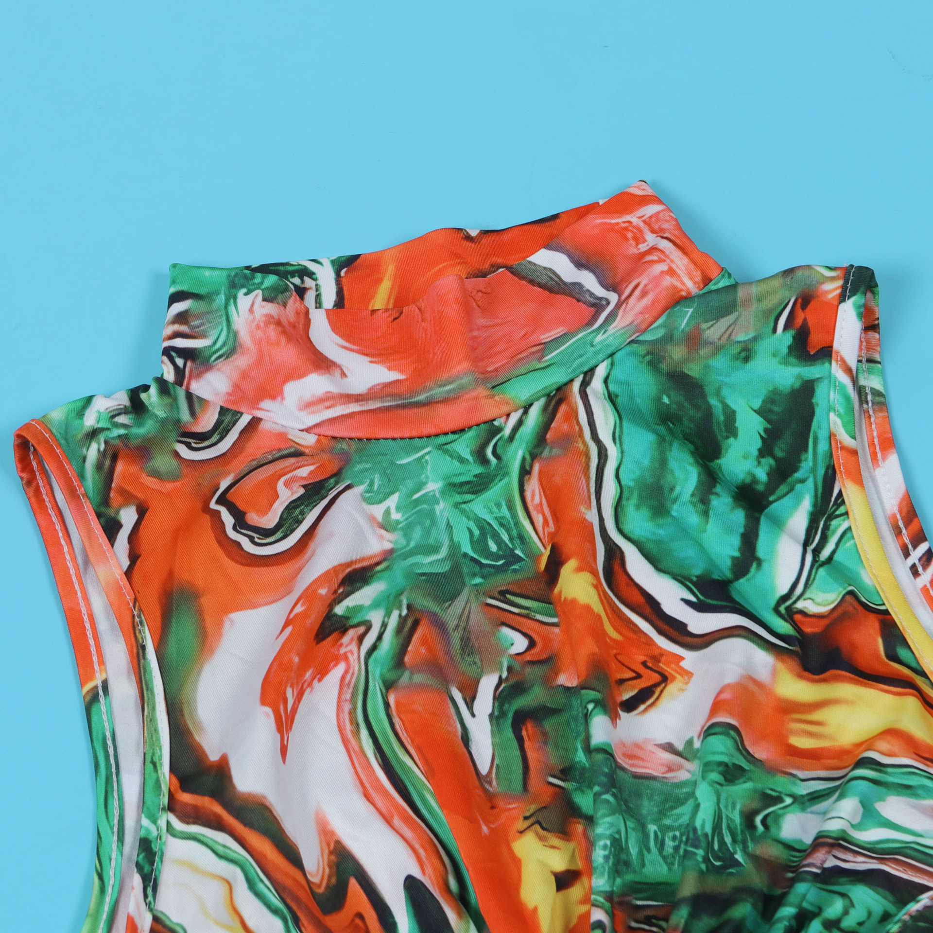 Printed Sleeveless Pullover Lace Midi Dress Two Piece Set