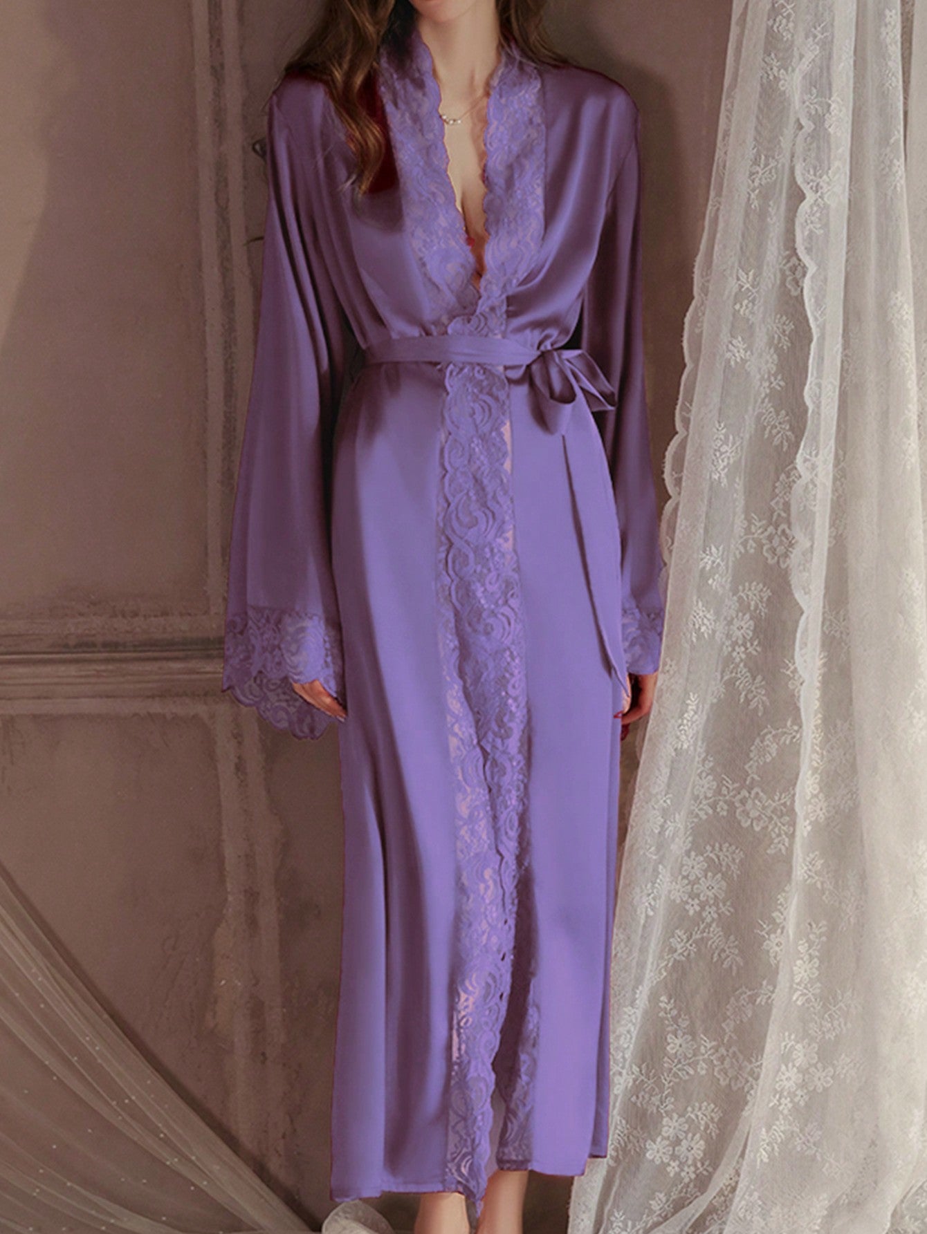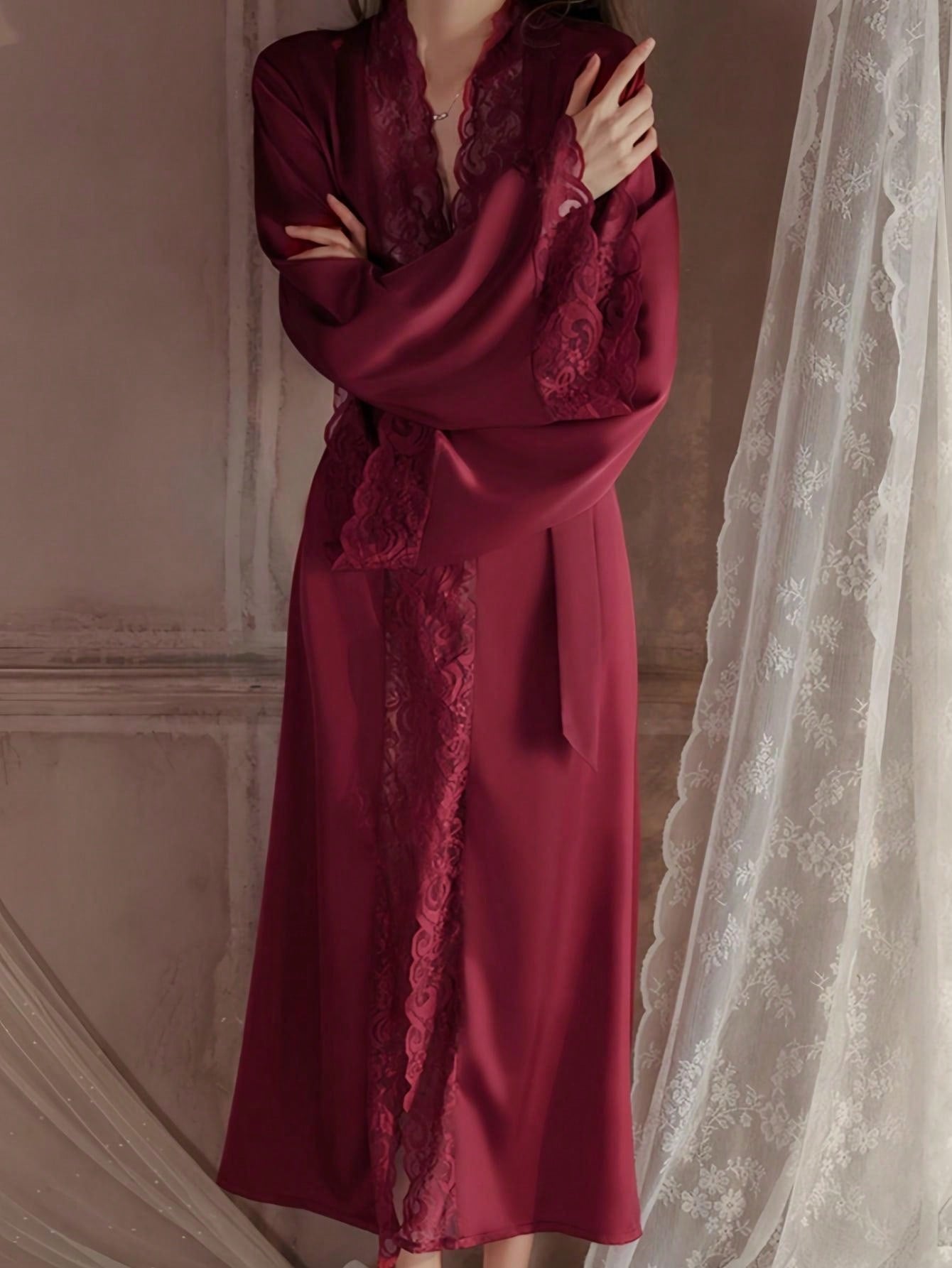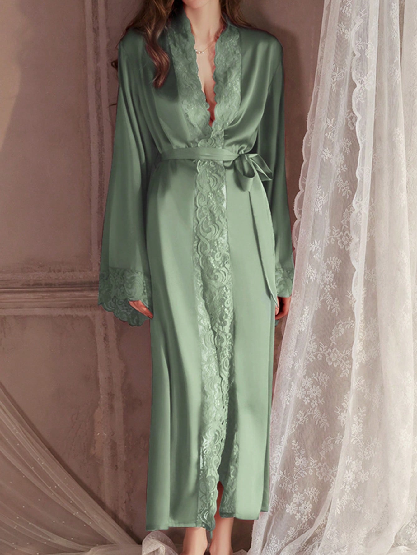 QING ROU Women's Elegant Satin Robe, Soft Lace Trim, Bell Sleeves, With Belt, Smooth And Comfortable, Suitable For Home Use
