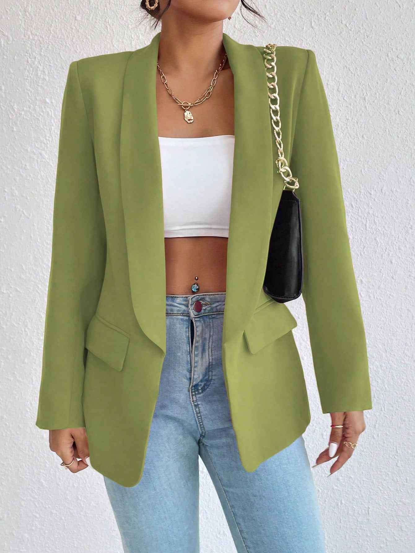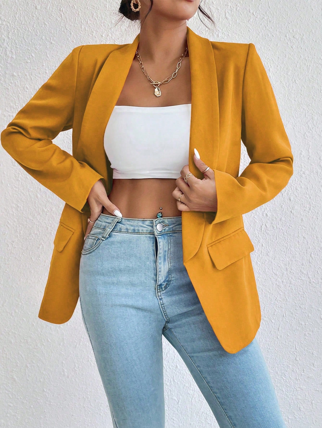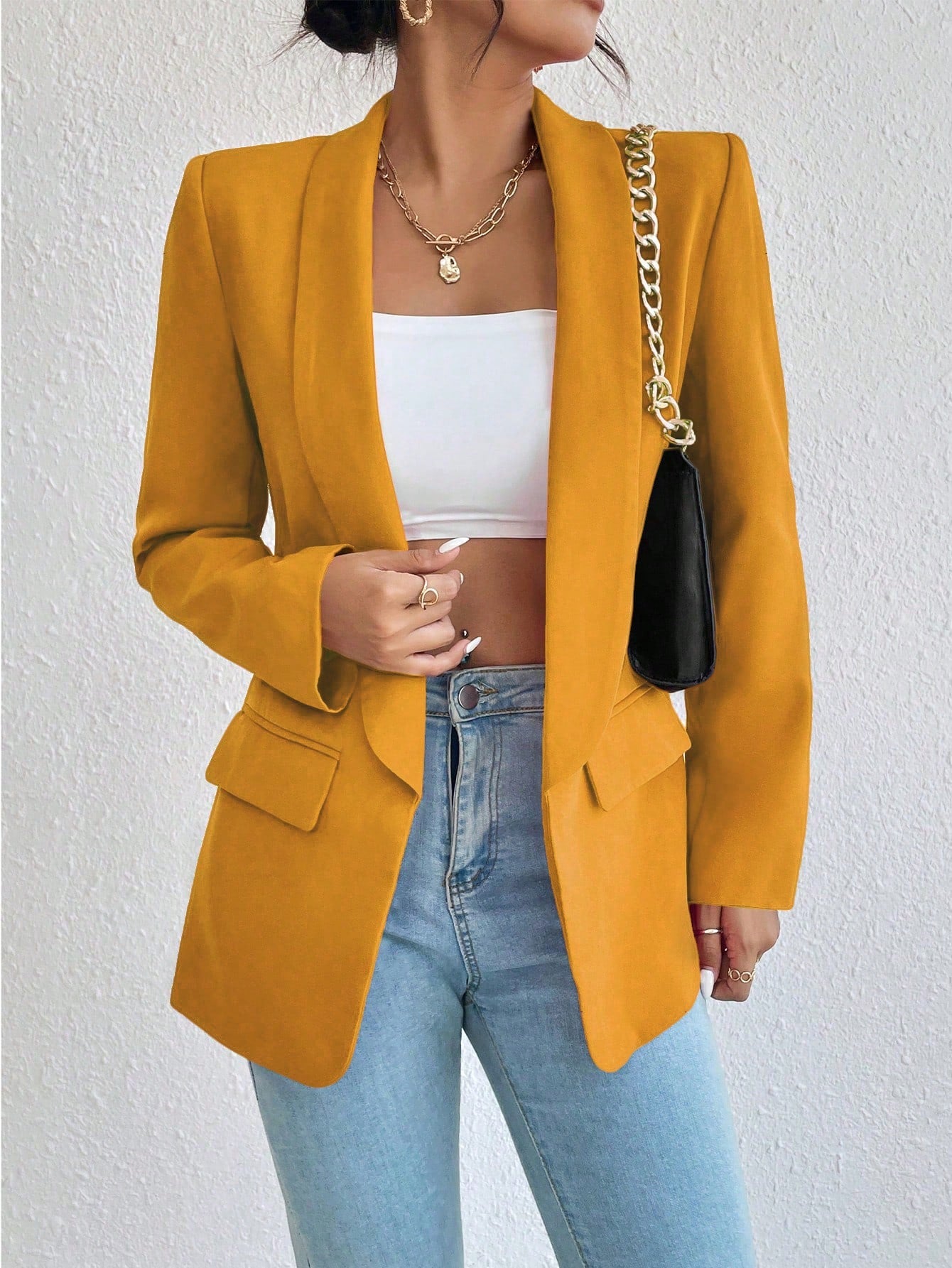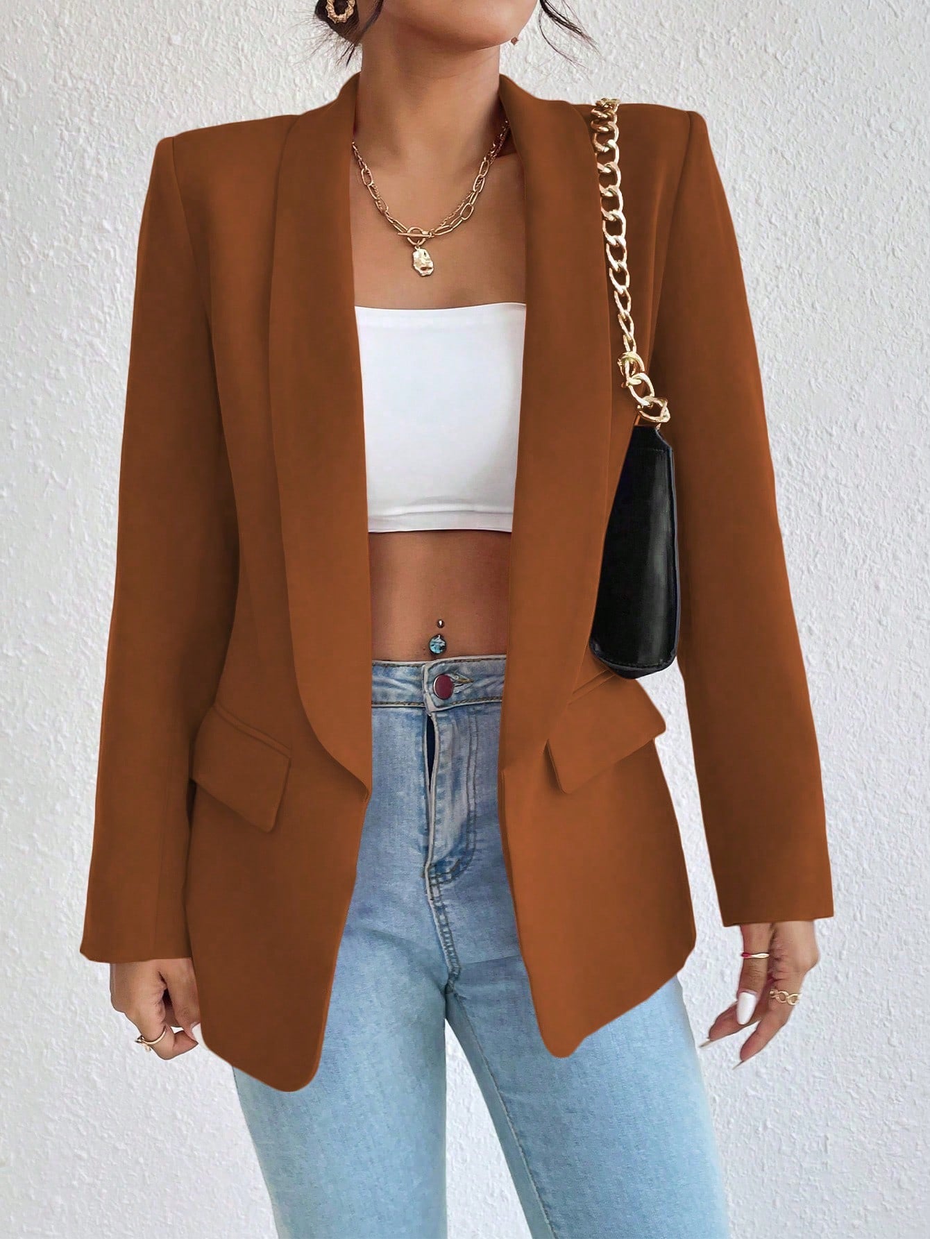 Raffinéa 1pc Women Simple Style Crew Neck Long Sleeve Mock Pocket Blazer Jacket