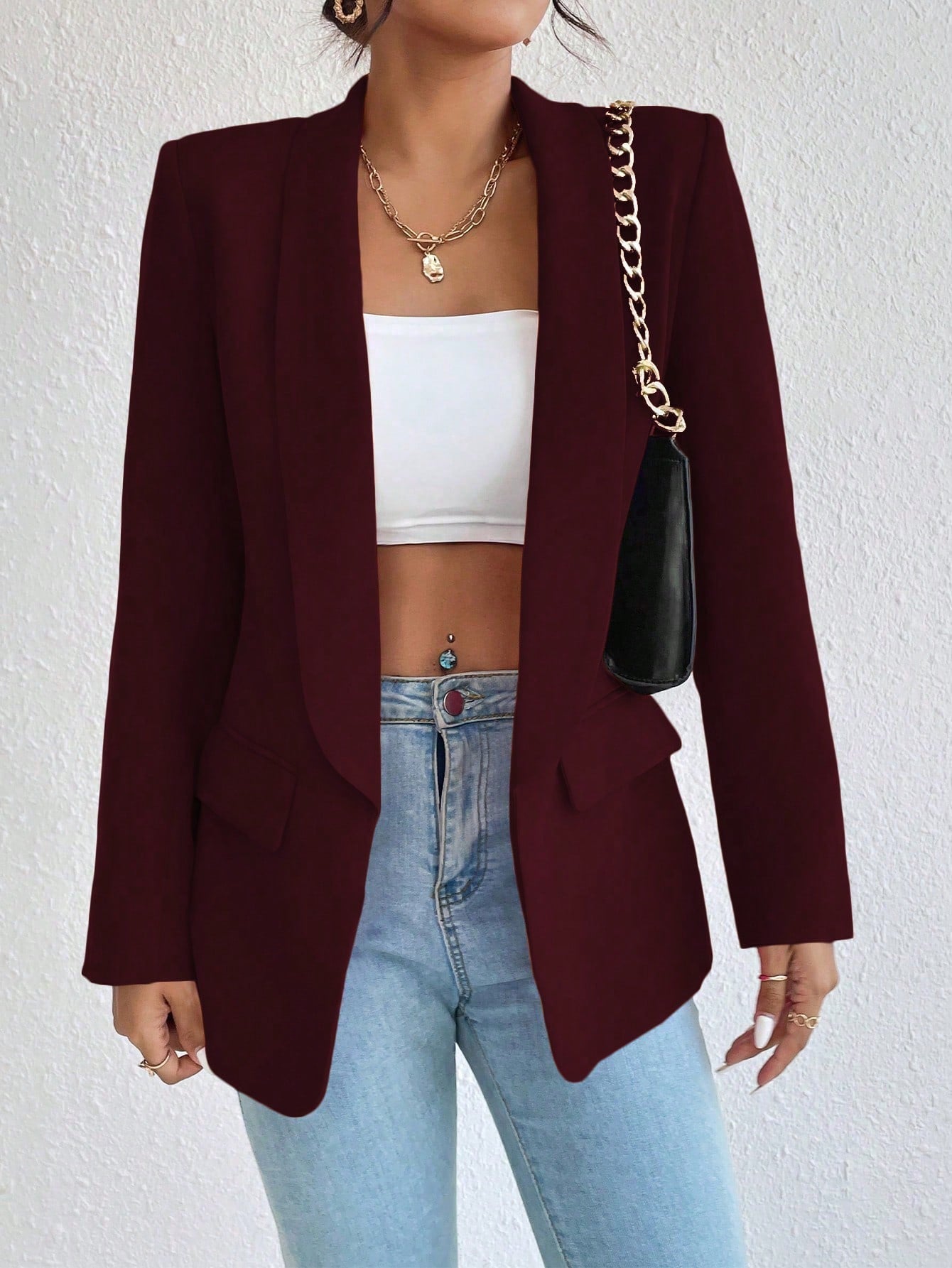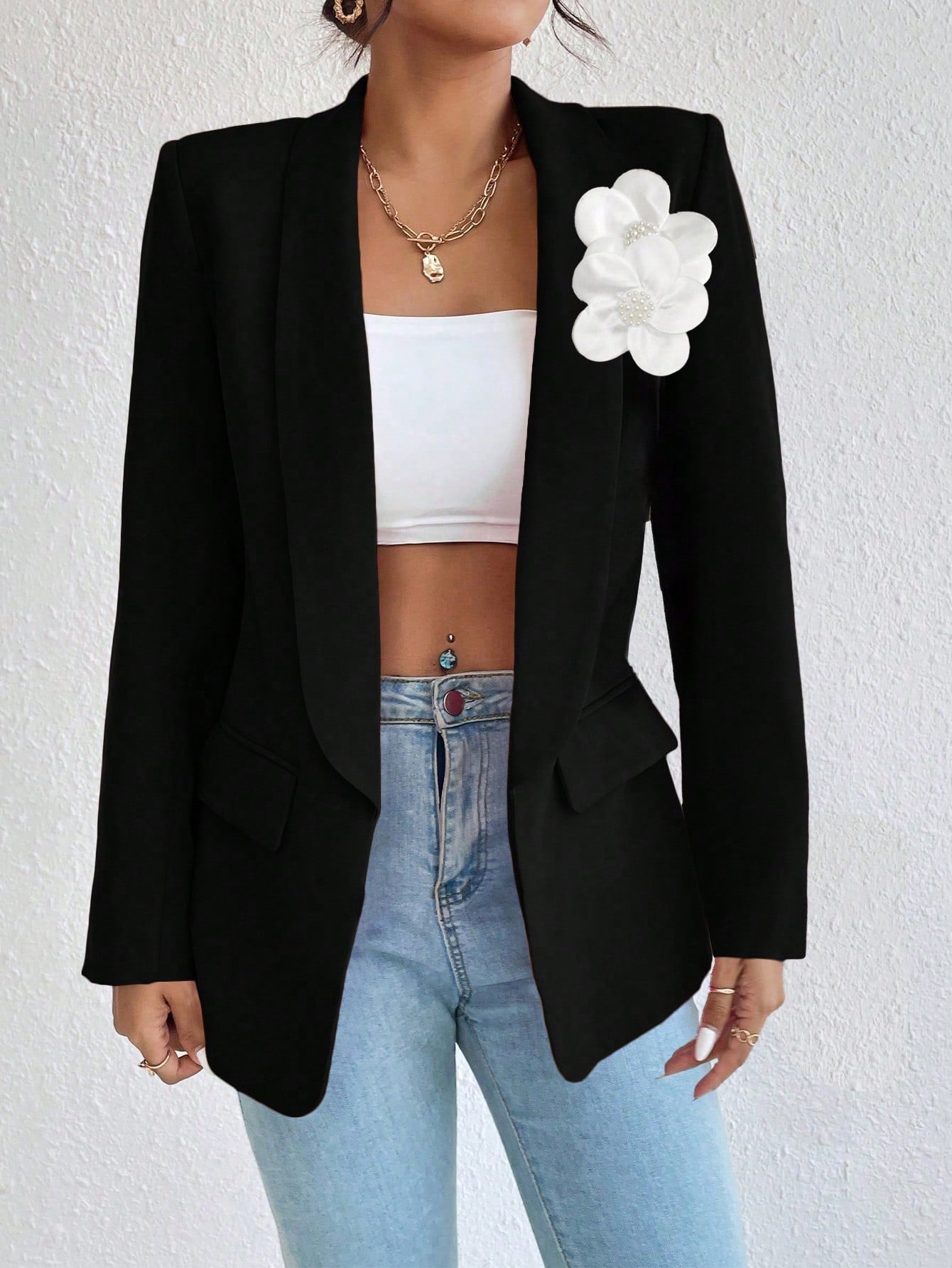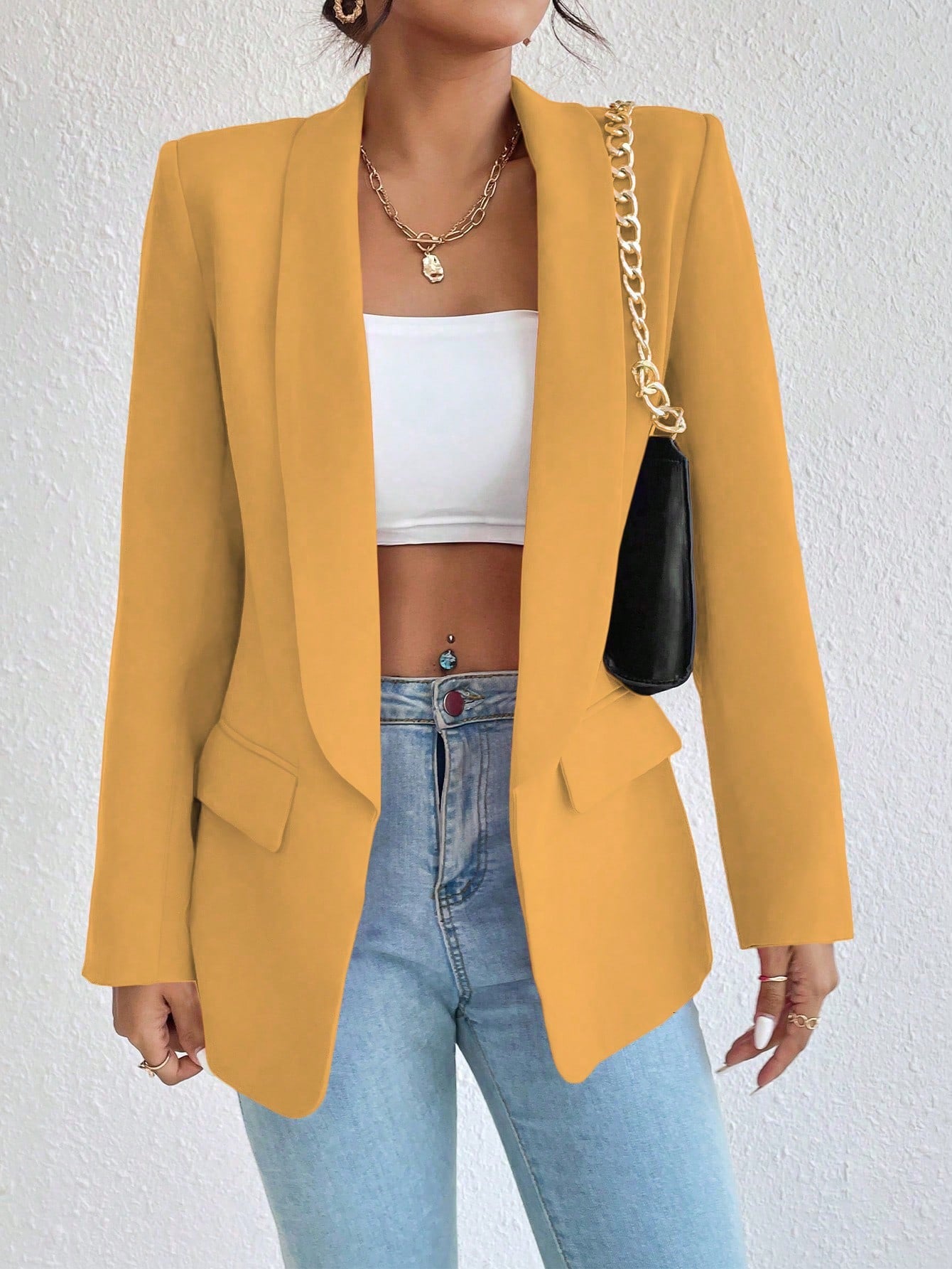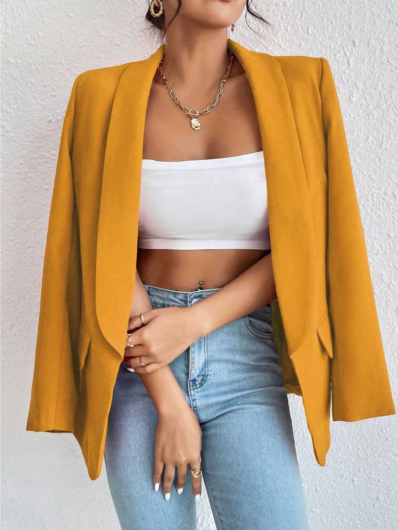 Raffinéa 1pc Women Simple Style Crew Neck Long Sleeve Mock Pocket Blazer Jacket
