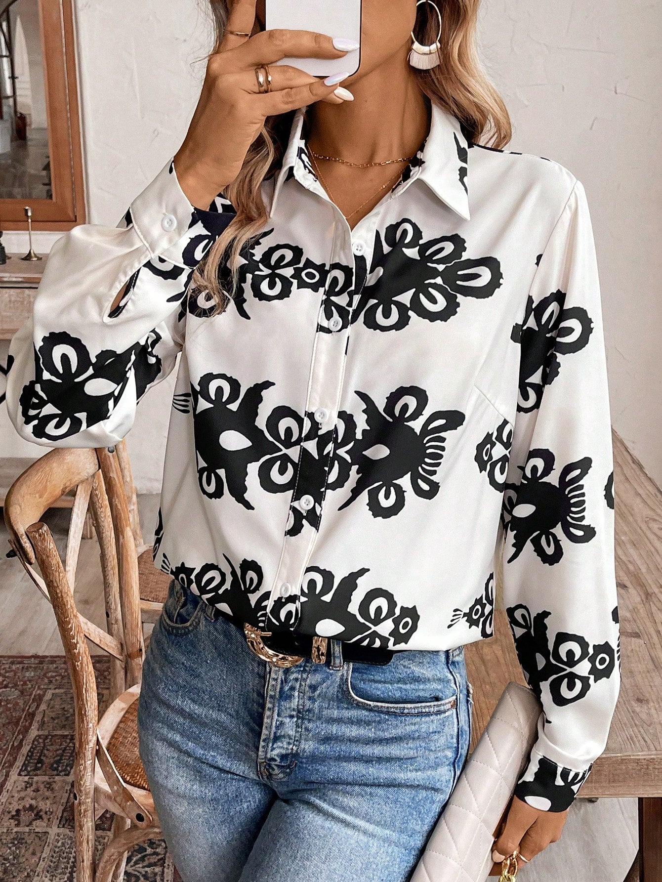 Raffinéa Elegant Commuter Ink Floral Print Open Front Shirt,Ladies Casual Button Long Sleeve Collar Regular Fit Regular Multicolor Regular Sleeve Shirt Women Blouses,Spring/Fall ,Casual Daily Wear,Long Sleeve Tops
