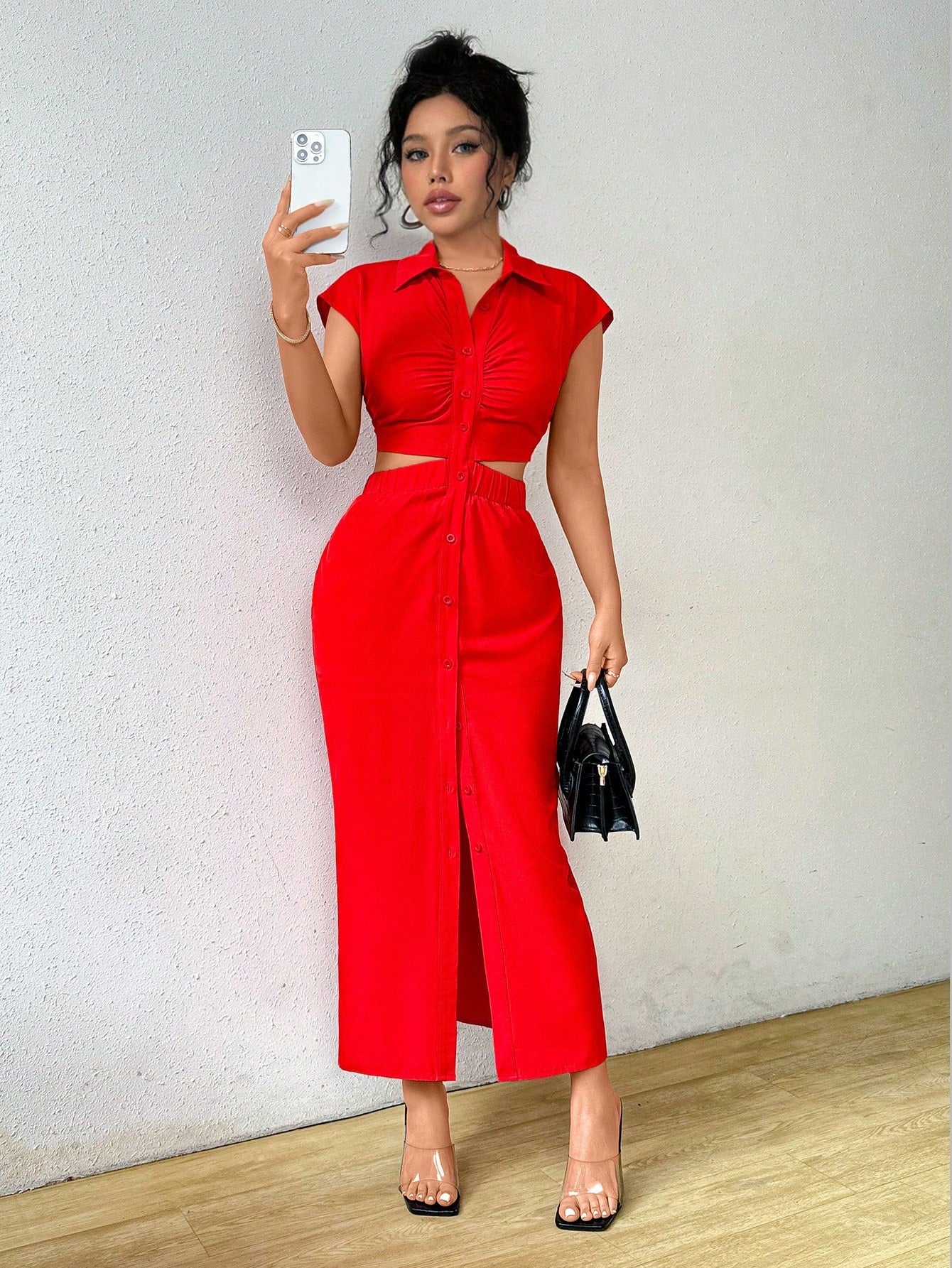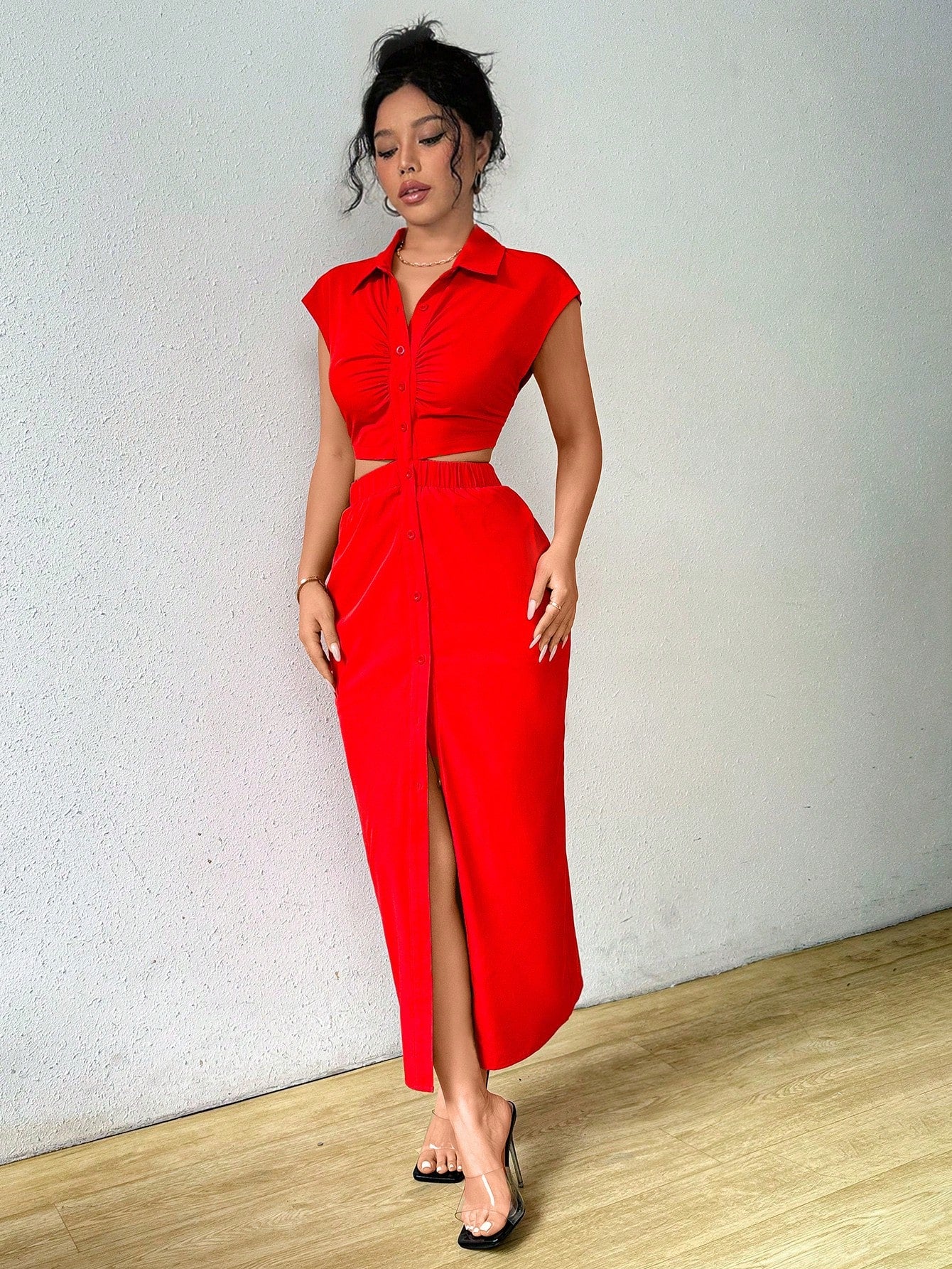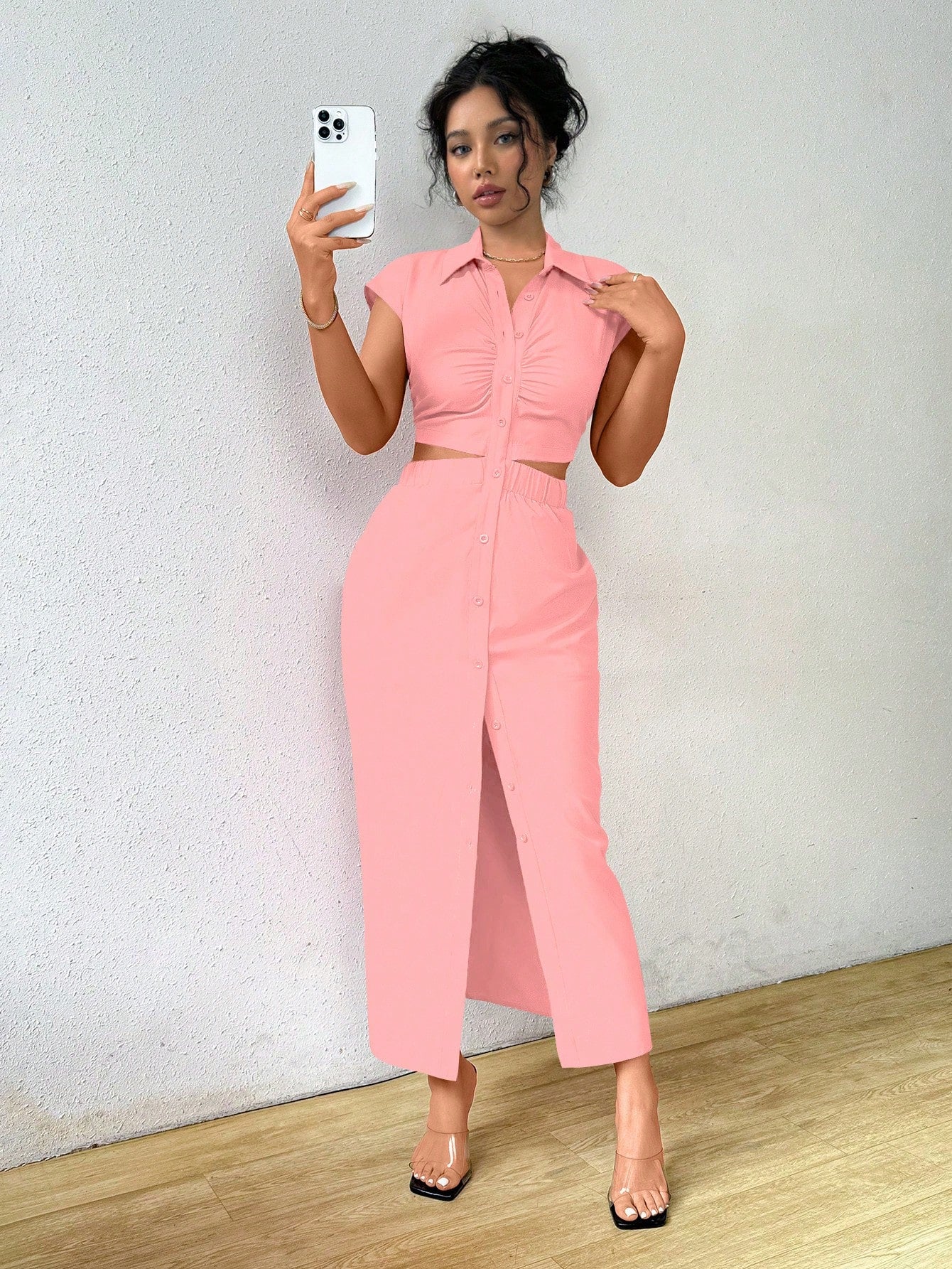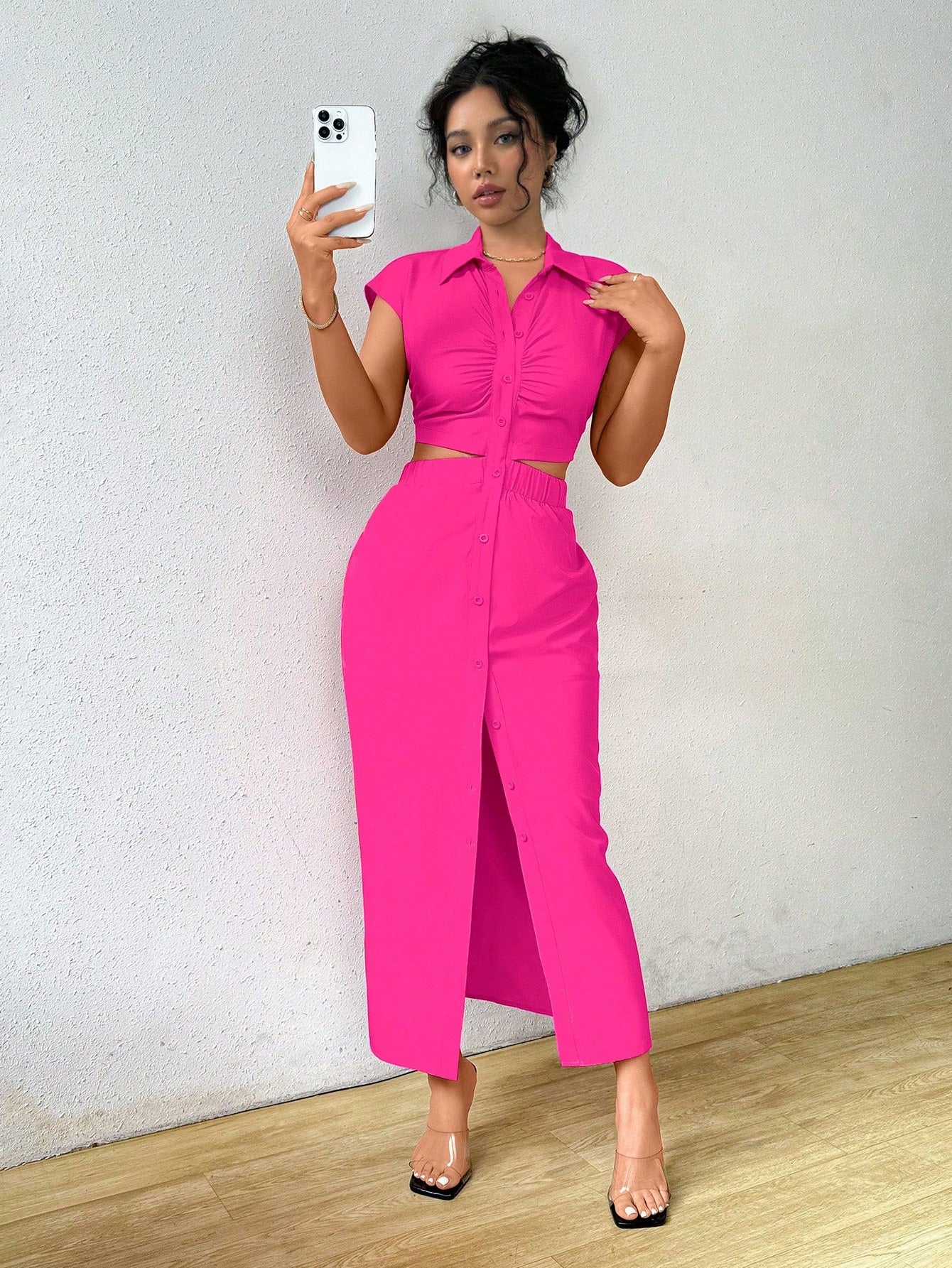 Raffinéa Summer Casual Solid Color V-Neck Waist-Revealing Button-Front Shirt Dress,Ladies Elegant Drawstring,Ruched Short Sleeve Collar Slim Fit Long Hot Pink Batwing Sleeve Plain Shirt Women Long Dresses,Spring/Summer,Casual Daily Wear Maxi Women Outfit