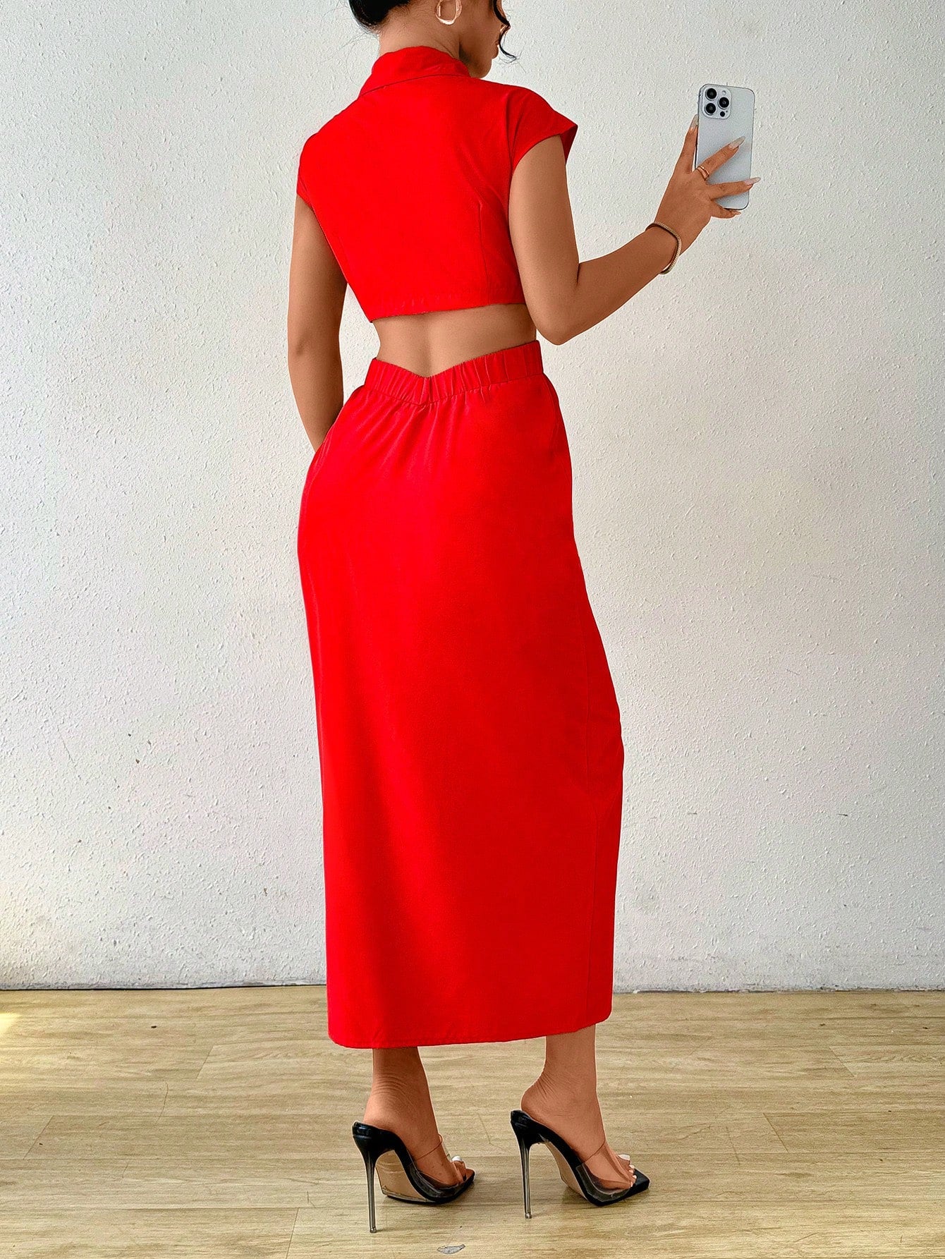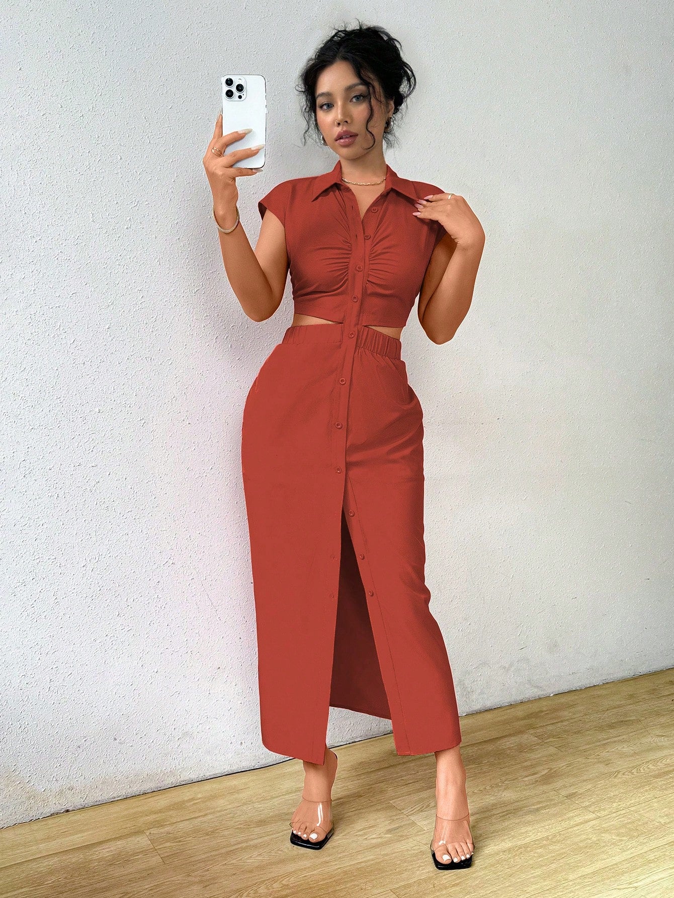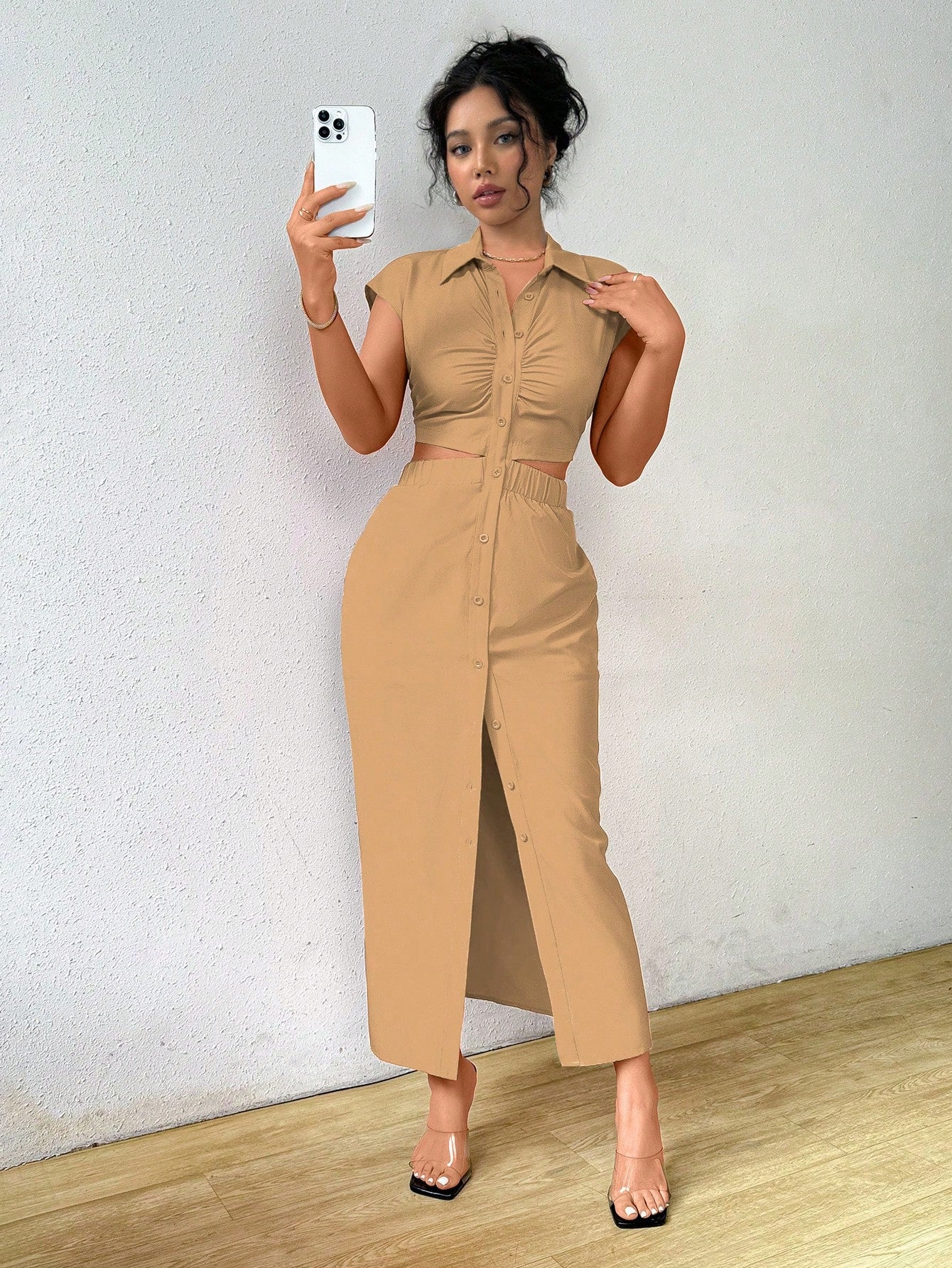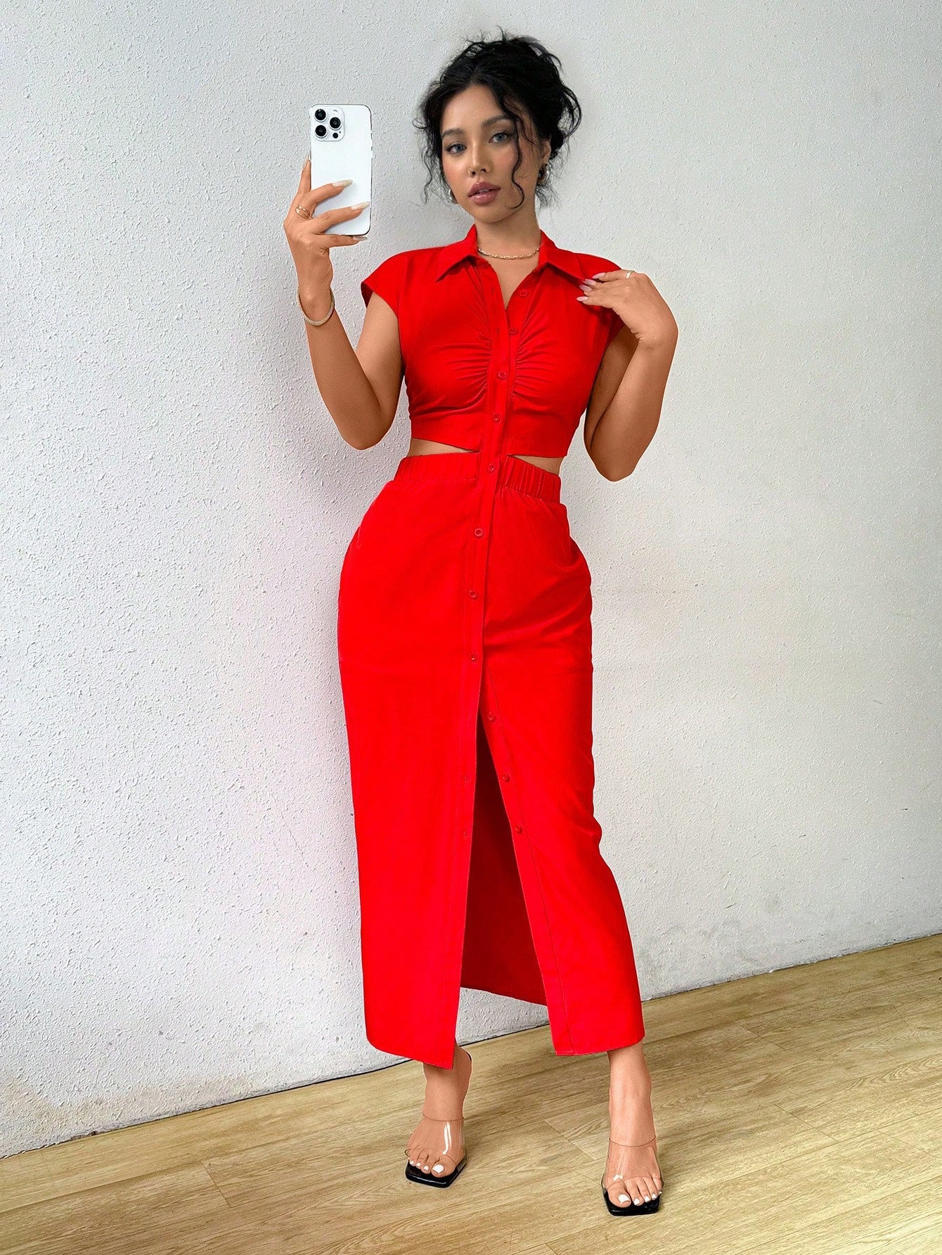 Raffinéa Summer Casual Solid Color V-Neck Waist-Revealing Button-Front Shirt Dress,Ladies Elegant Drawstring,Ruched Short Sleeve Collar Slim Fit Long Hot Pink Batwing Sleeve Plain Shirt Women Long Dresses,Spring/Summer,Casual Daily Wear Maxi Women Outfit