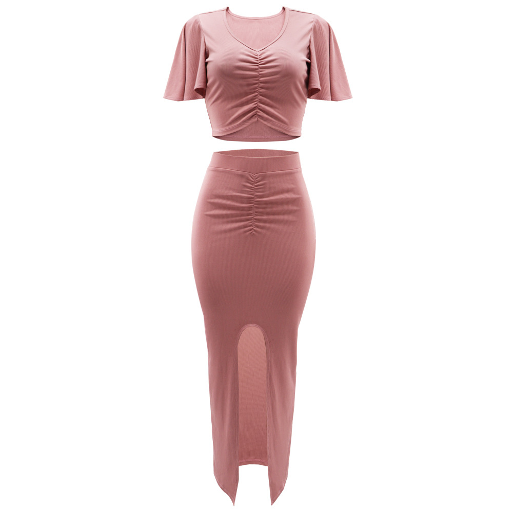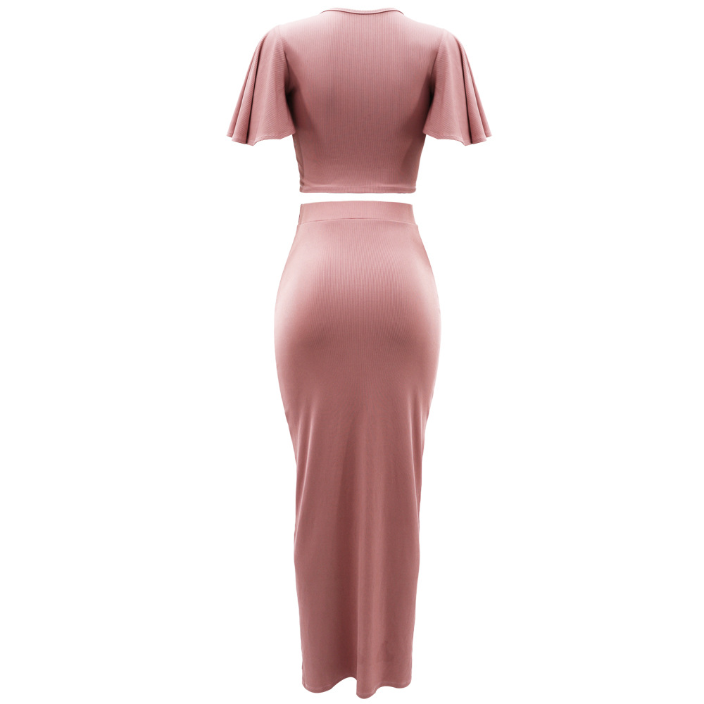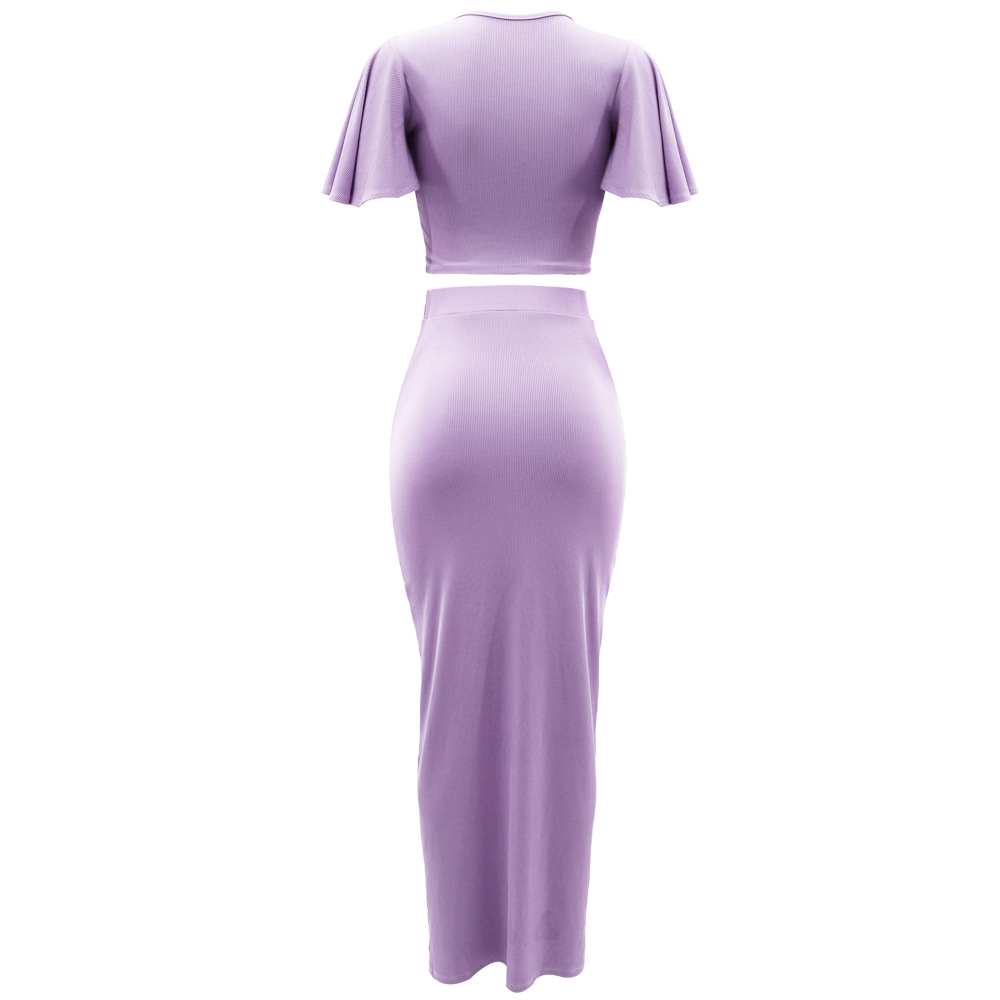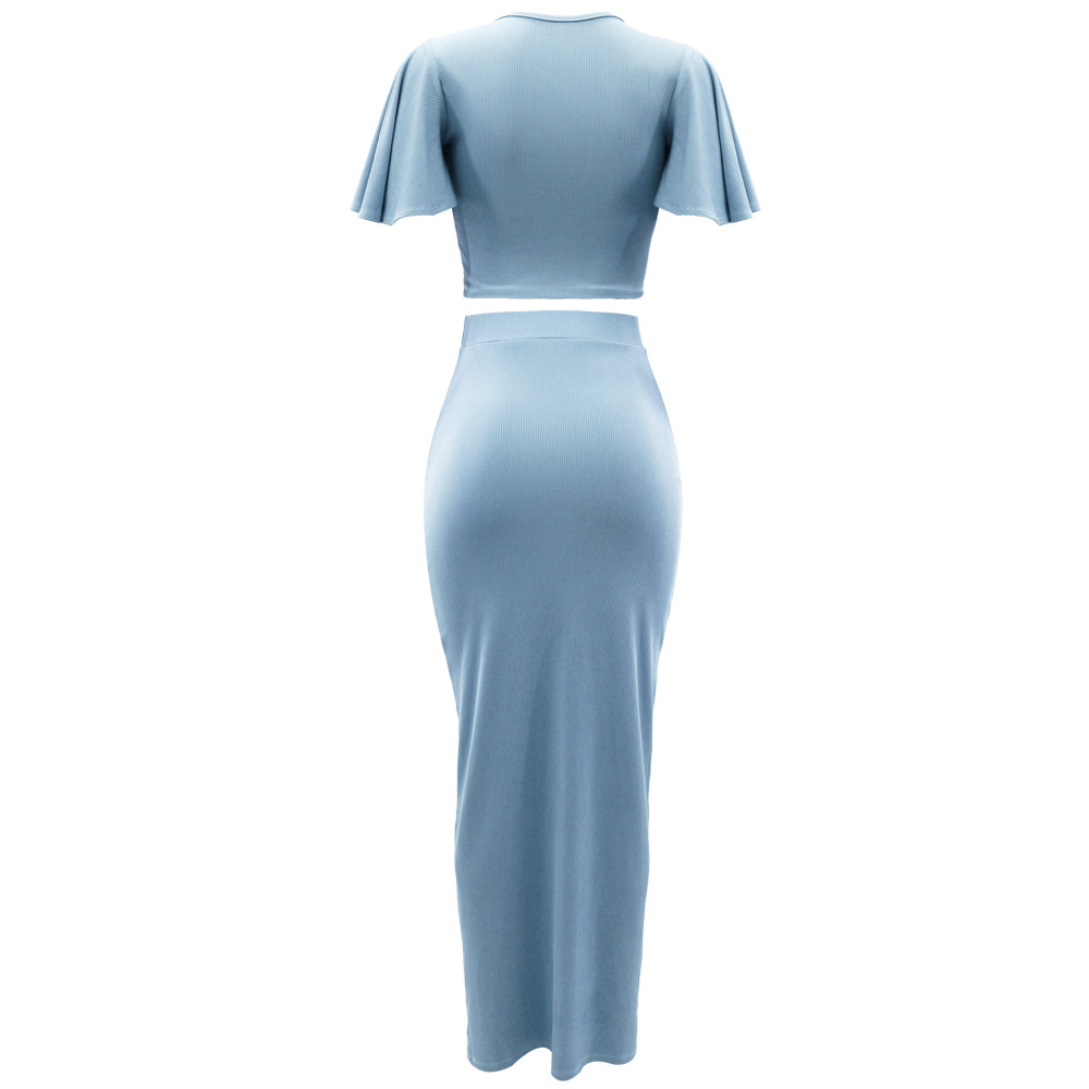 Ruffle Sleeve Cropped V neck Top Split Sheath Dress Summer Two Piece Set