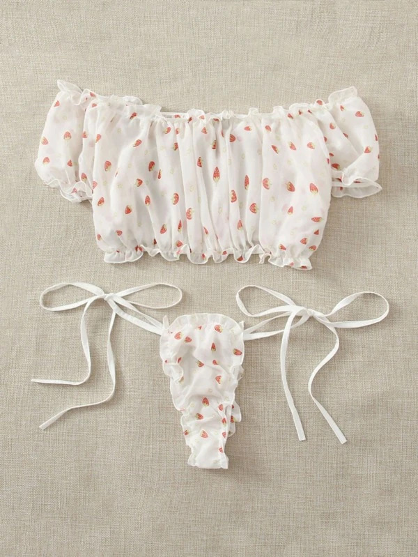 Sexy Lingerie Lace See-through Sexy Mesh Heart Printing Sexy Sleepwear Suit