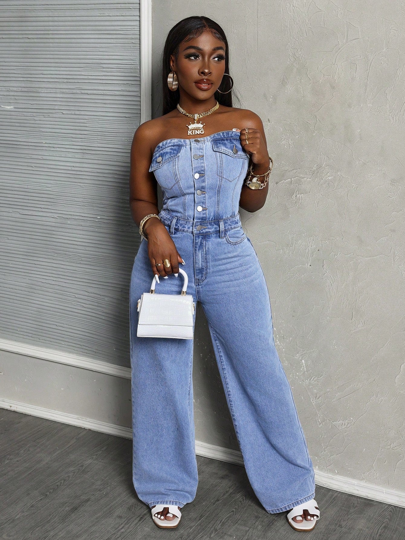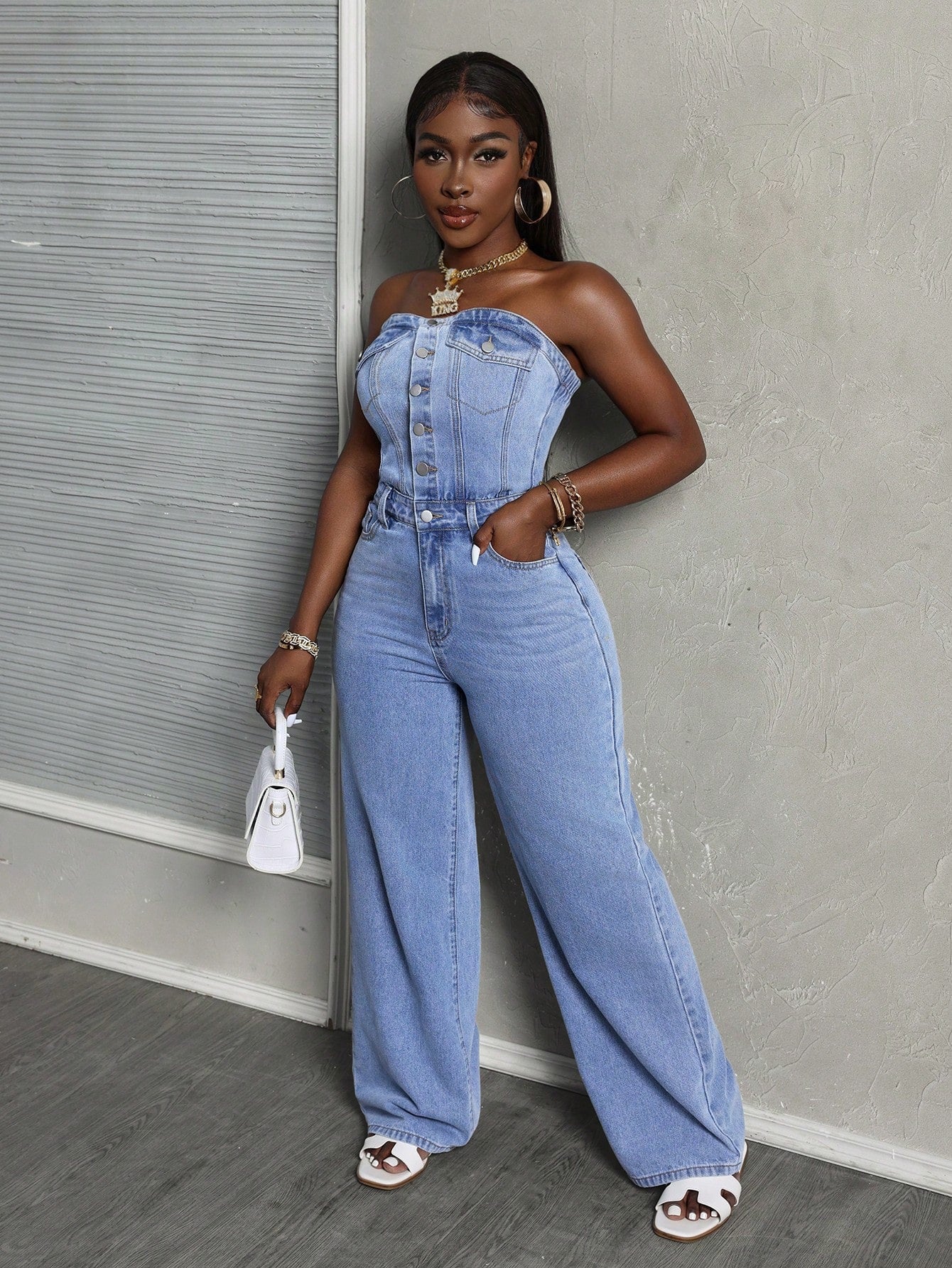 Slayr Women Strapless Denim Jumpsuit With Front Button Placket, Pockets, And Sleeveless Design