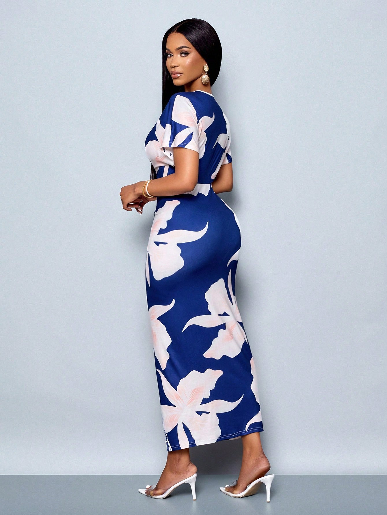 SOLERSUN 2025 Spring And Summer Women's Luxury Vacational Elegant Floral Positioning Print V-Neck Gathered Waist Long Blue Dress Resort Dress
