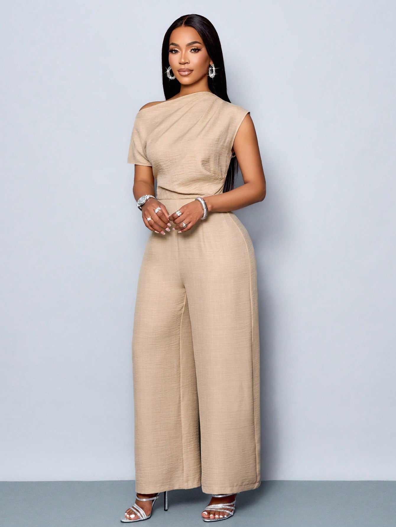 SOLERSUN Four Seasons Women's Wear Commuting Elegance Daytime Outing Casual Simple Apricot Off-Shoulder Asymmetrical Neckline Shoulder Pleats Short Sleeve Wide Leg Jumpsuit