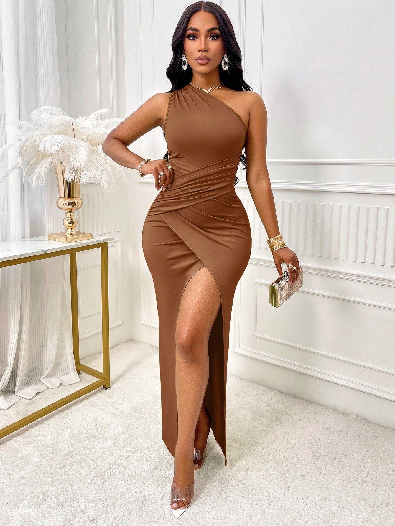 SOLERSUN "One Shoulder Solid Color Twist Knot Side Slit Wrap Dress Summer Dress Dress Long" Maxi Women Outfit