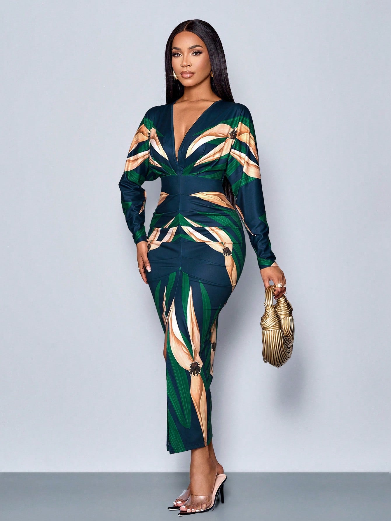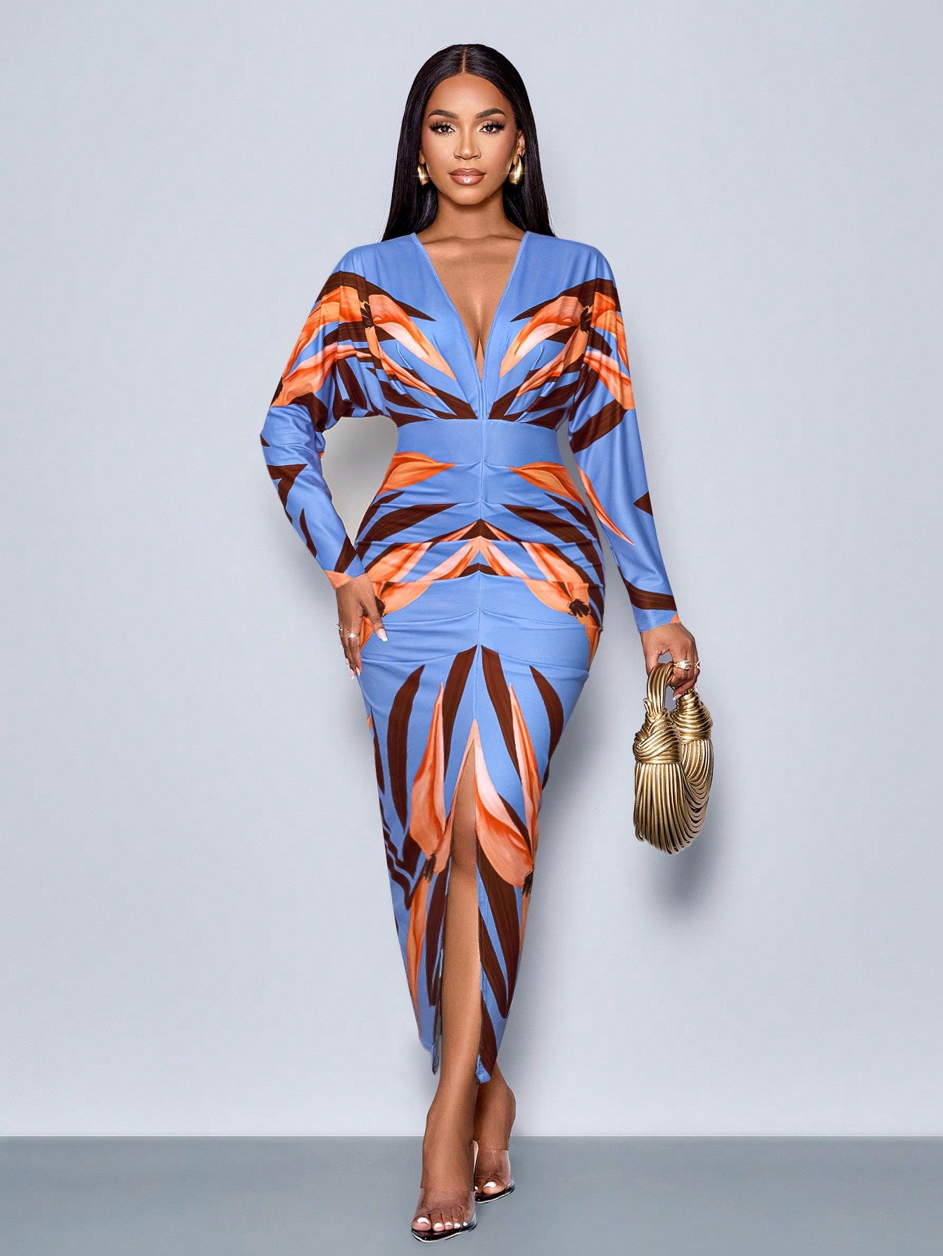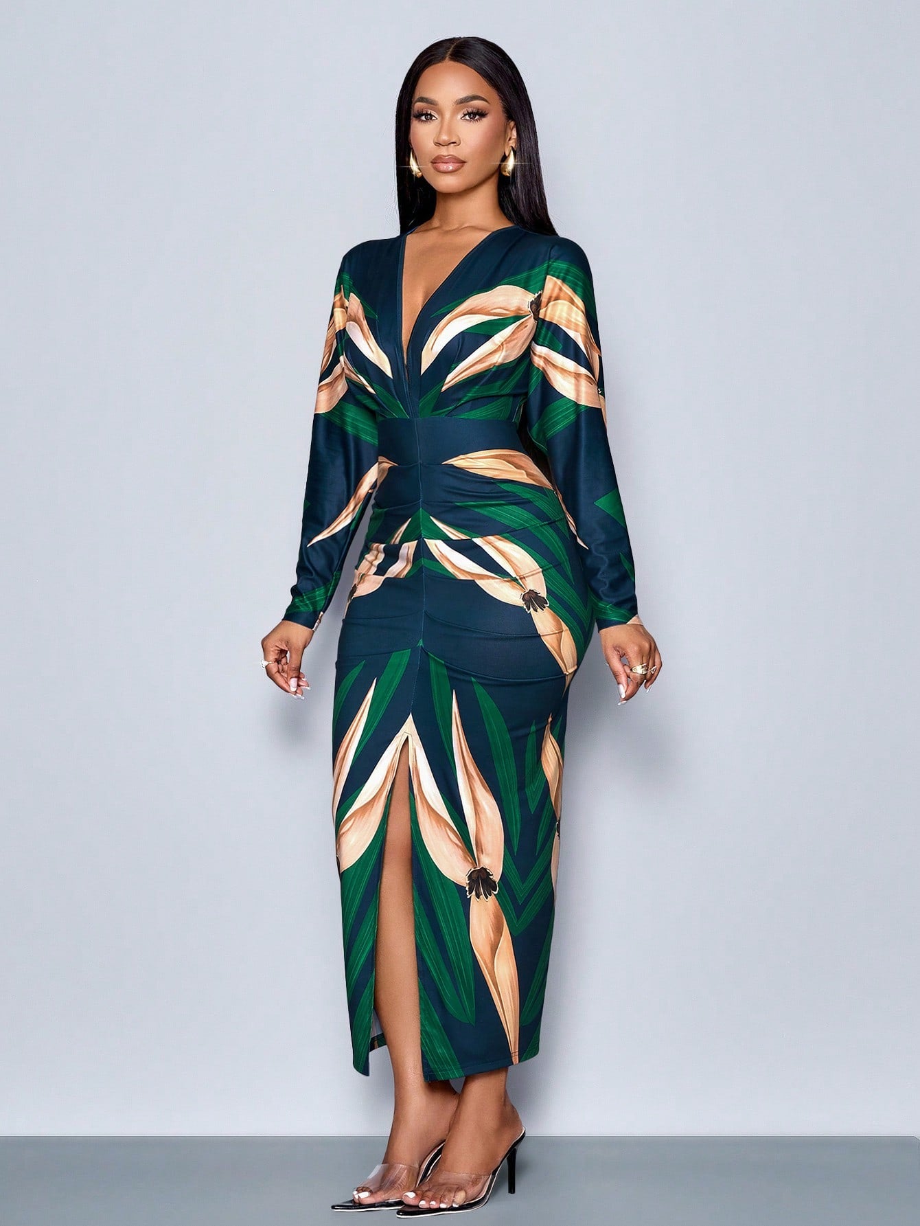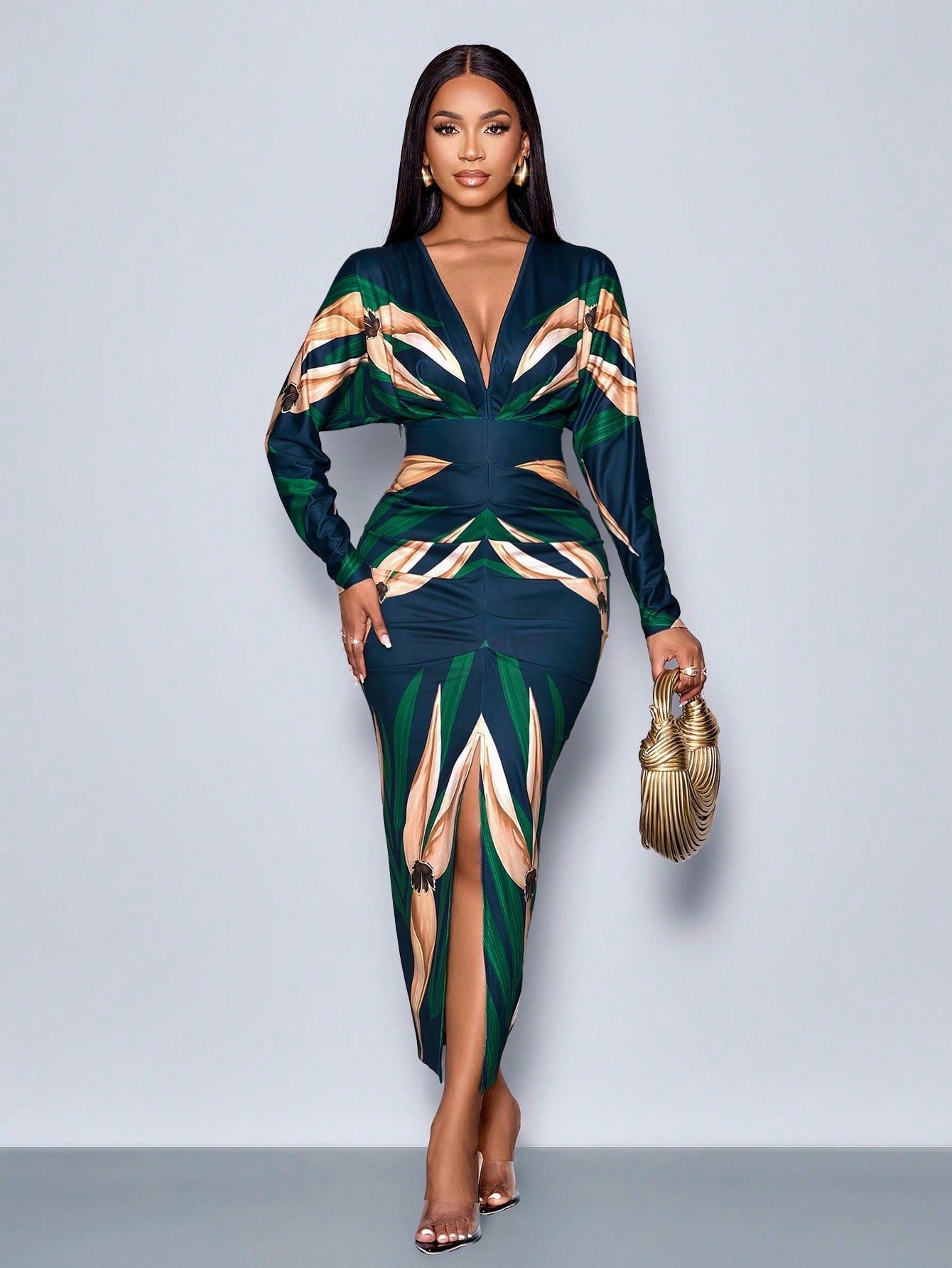 SOLERSUN Winter Clothes For Women Holiday Clothes Elegant Printed V-Neck Split Thigh Bodycon Party Dress Maxi Women Outfit
