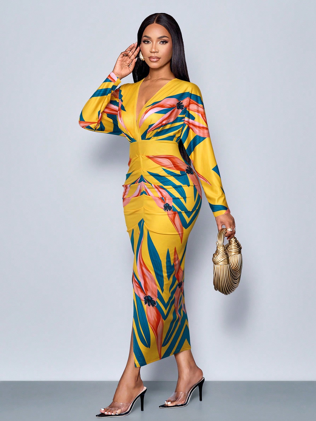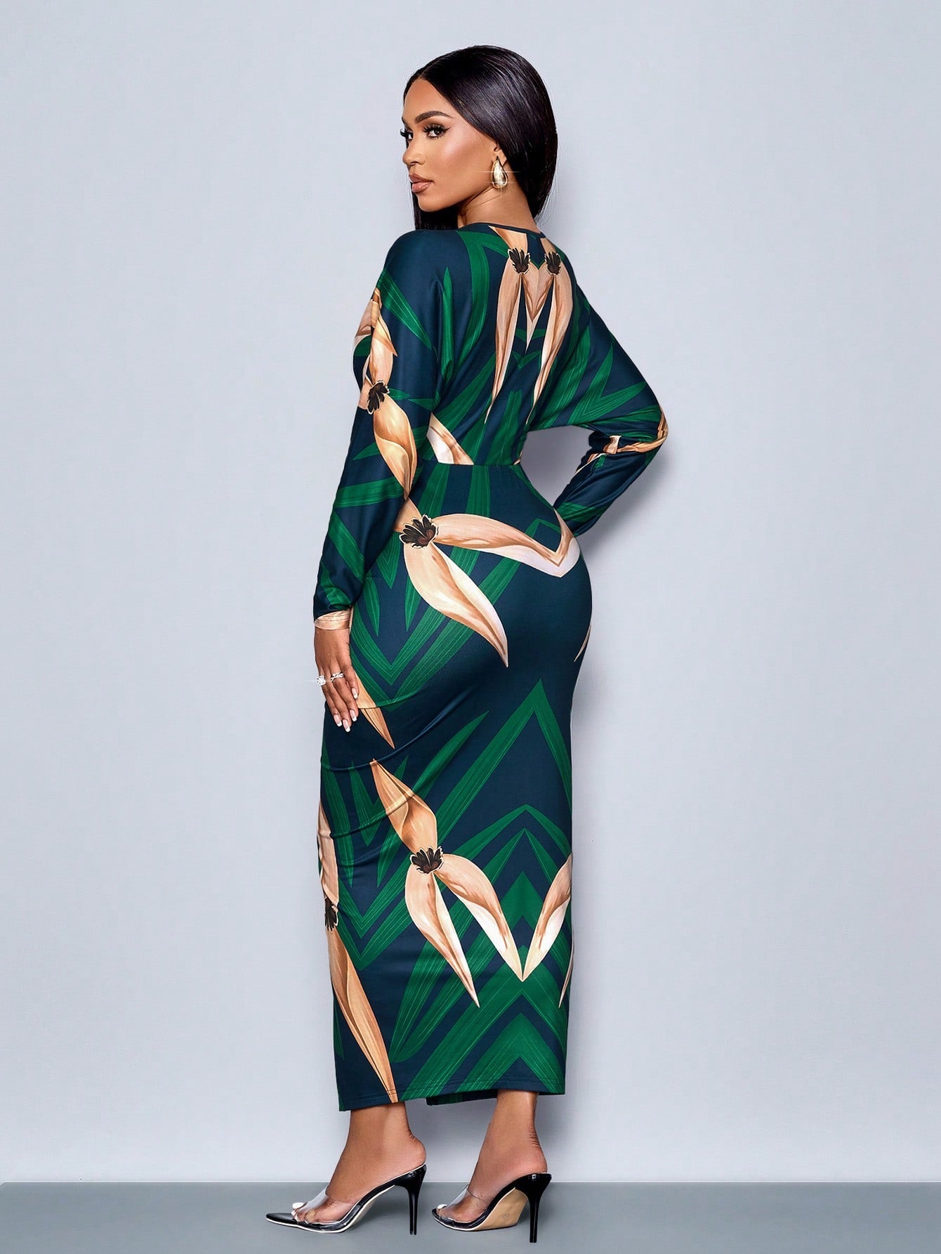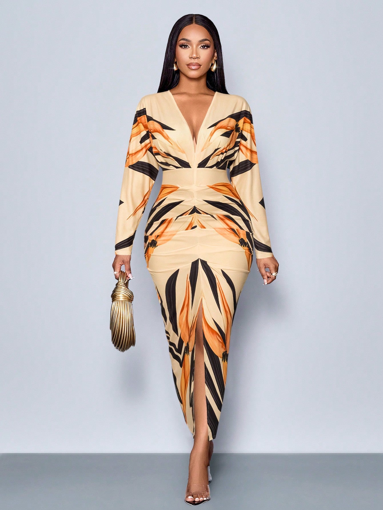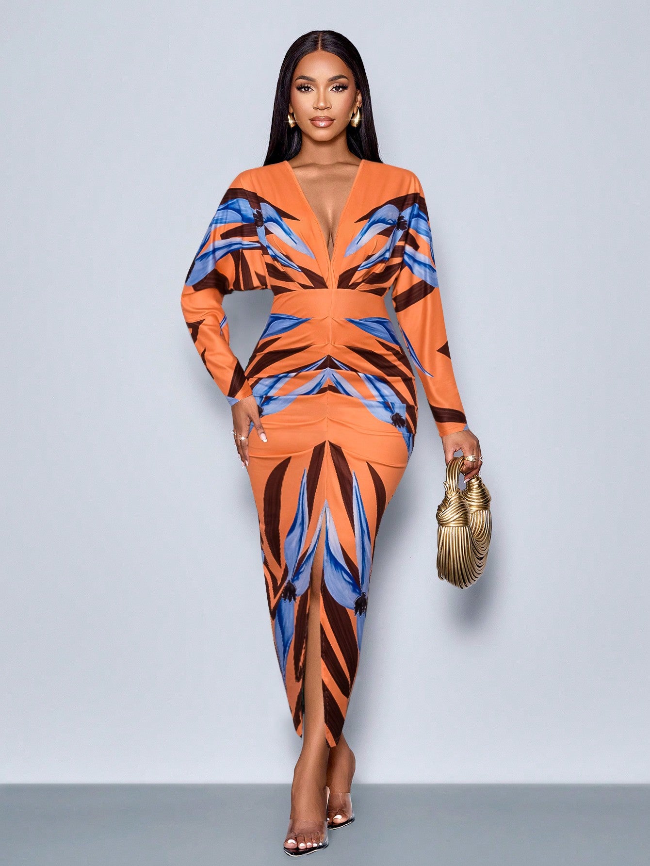 SOLERSUN Winter Clothes For Women Holiday Clothes Elegant Printed V-Neck Split Thigh Bodycon Party Dress Maxi Women Outfit