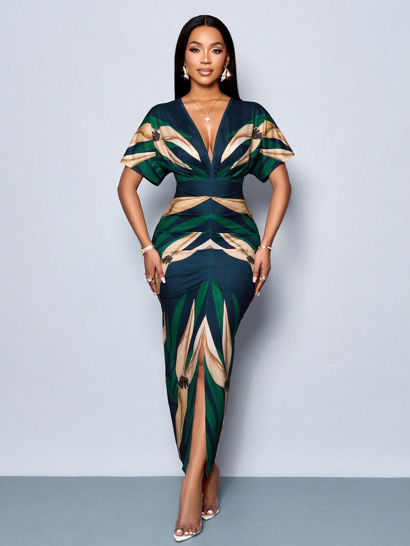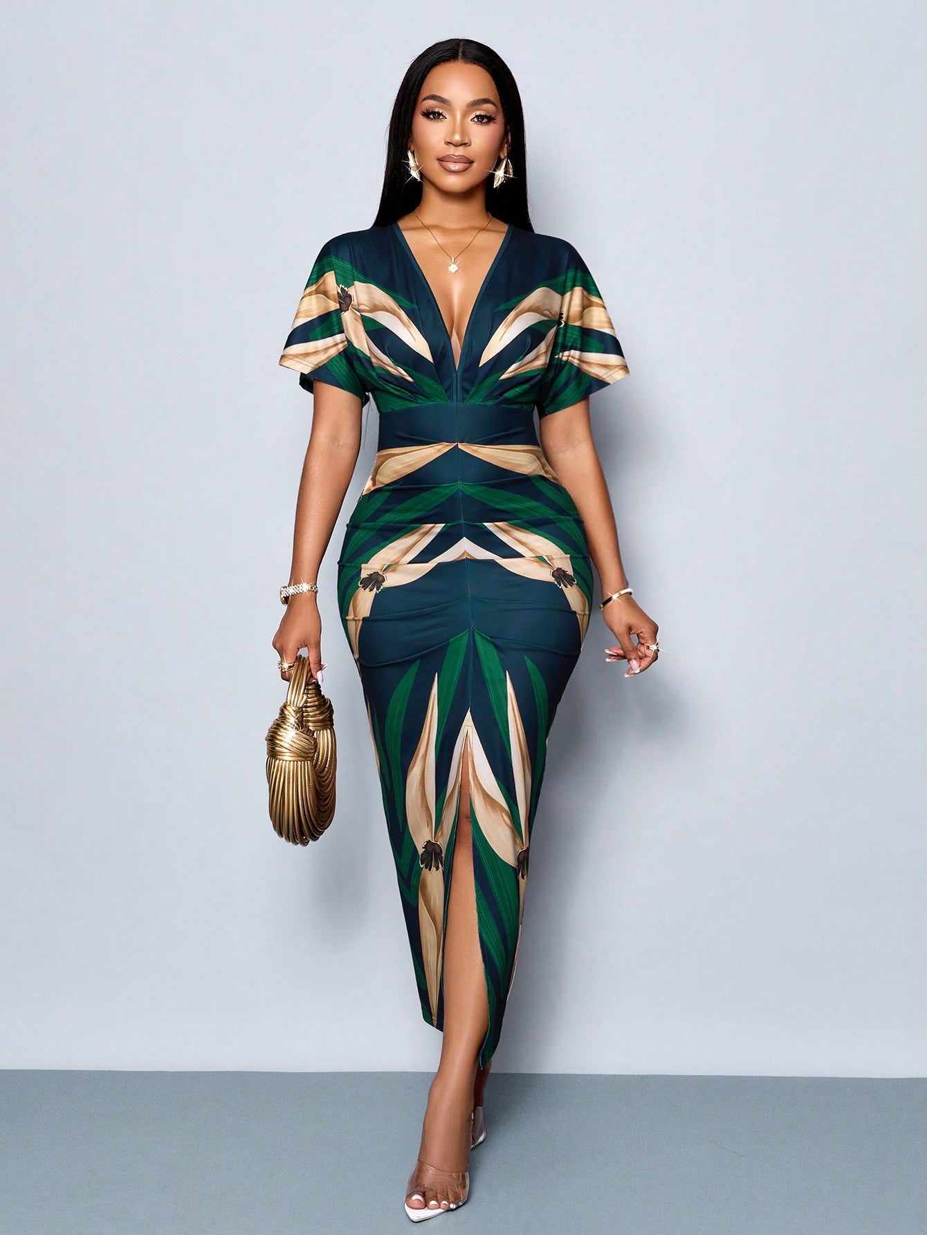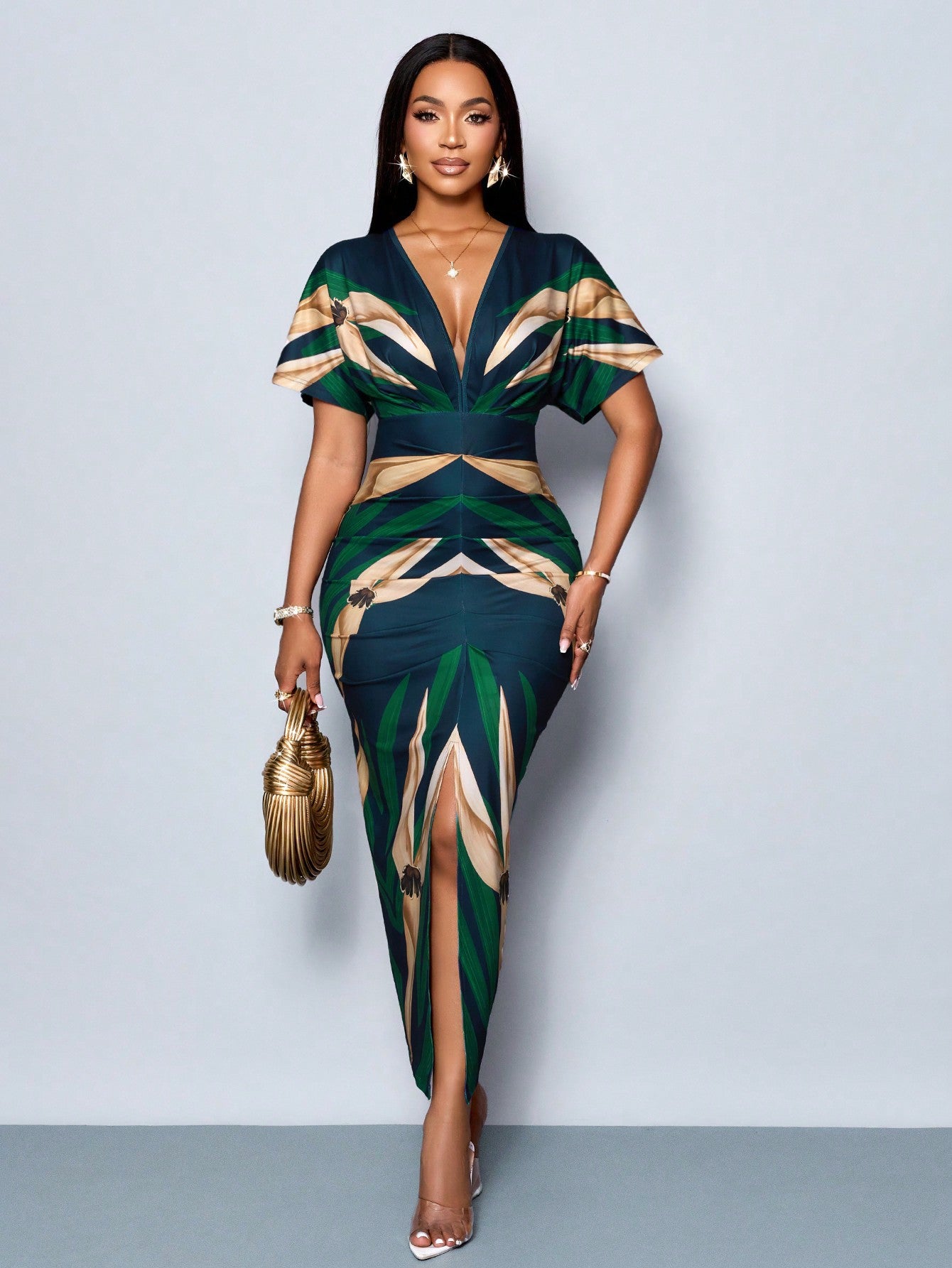 SOLERSUN Women's Elegant Printed V-Neck Split Thigh Bodycon Party Dress For Spring/Summer Holiday