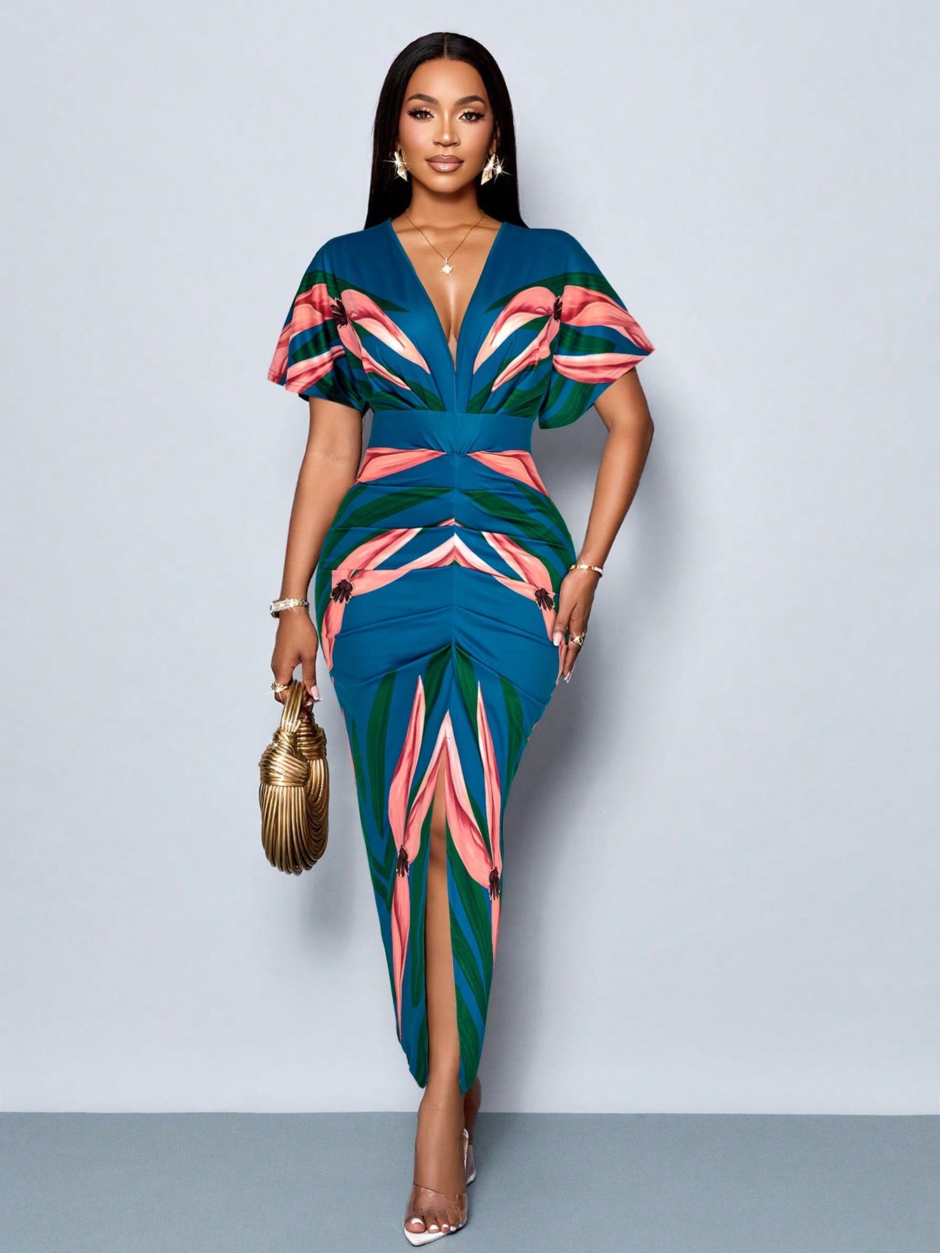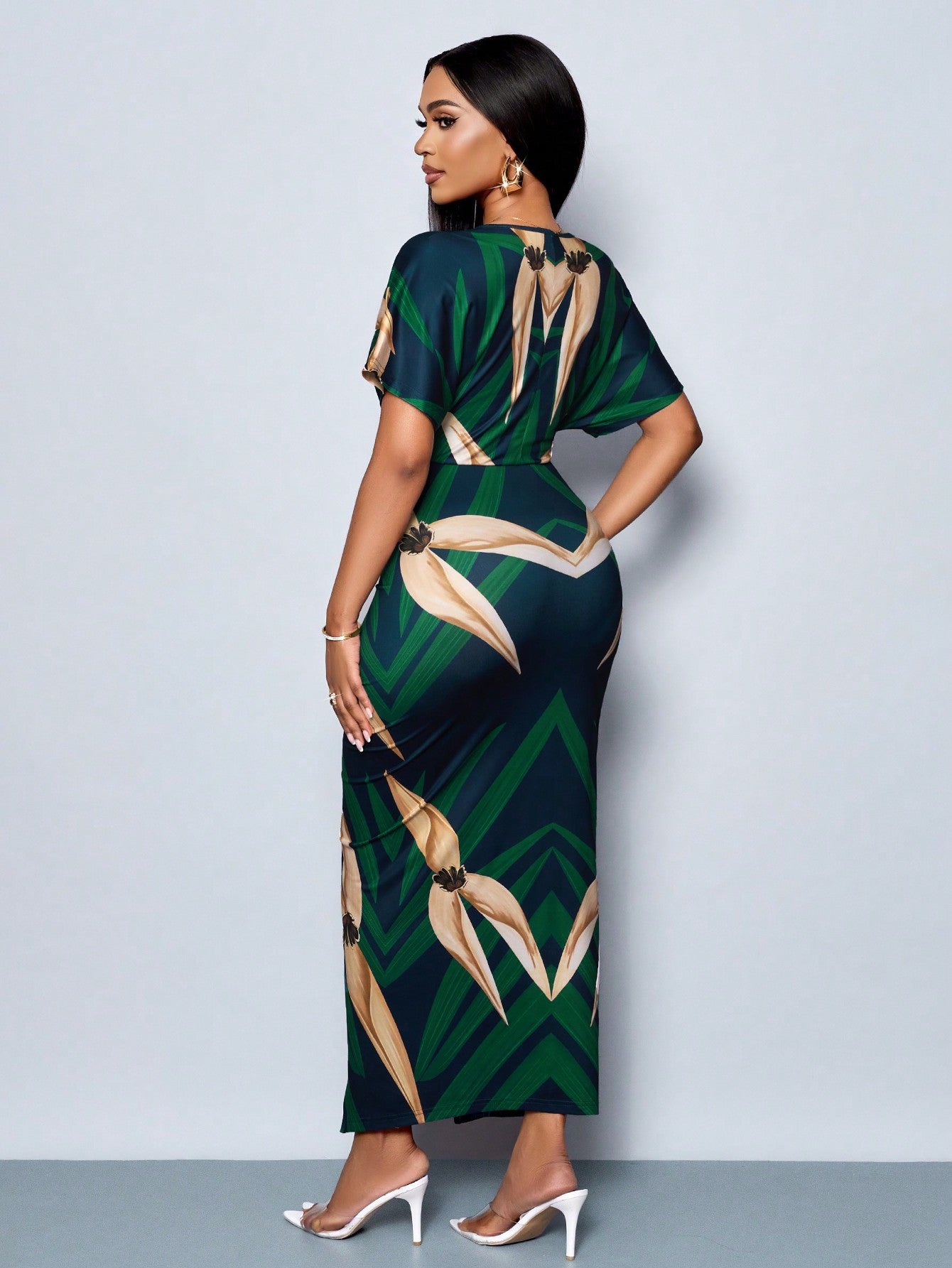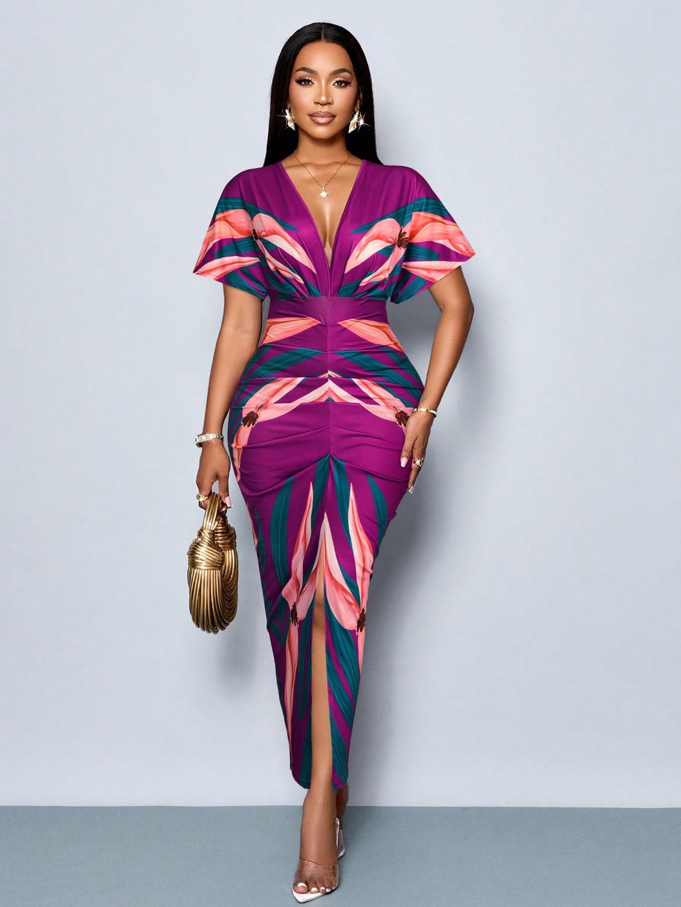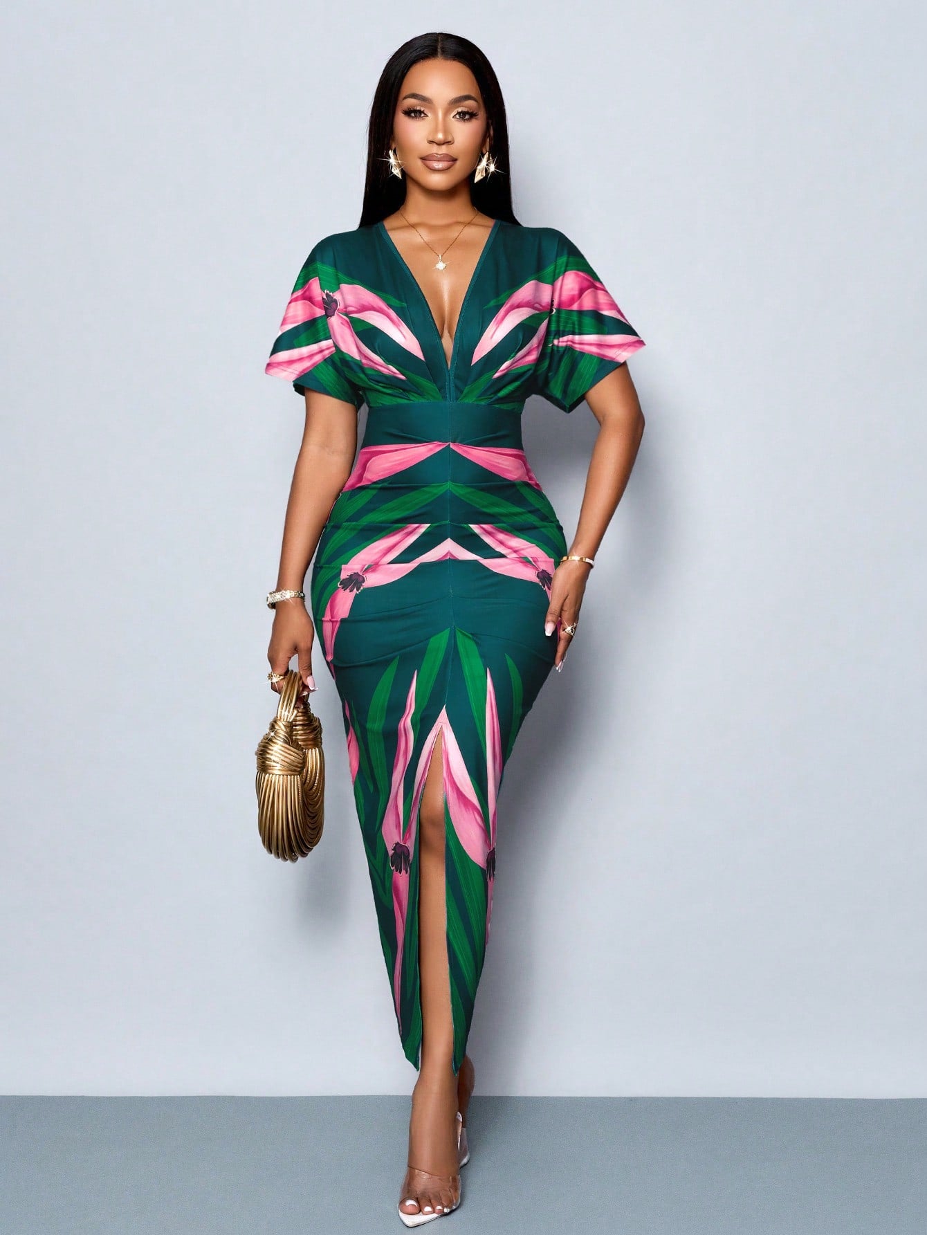SOLERSUN Women's Elegant Printed V-Neck Split Thigh Bodycon Party Dress For Spring/Summer Holiday