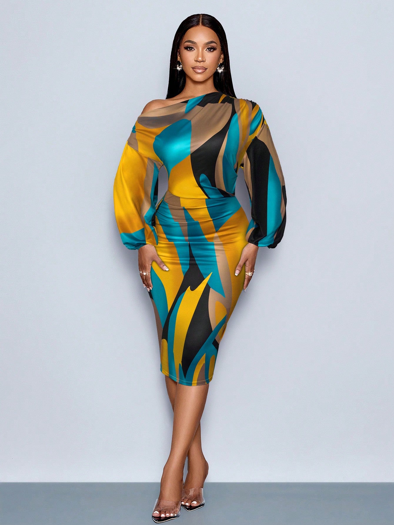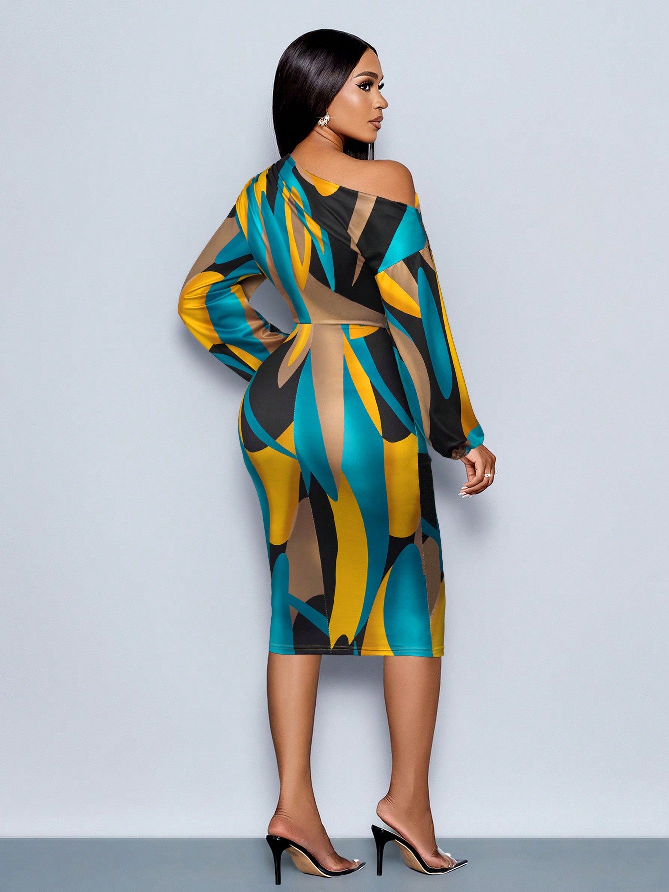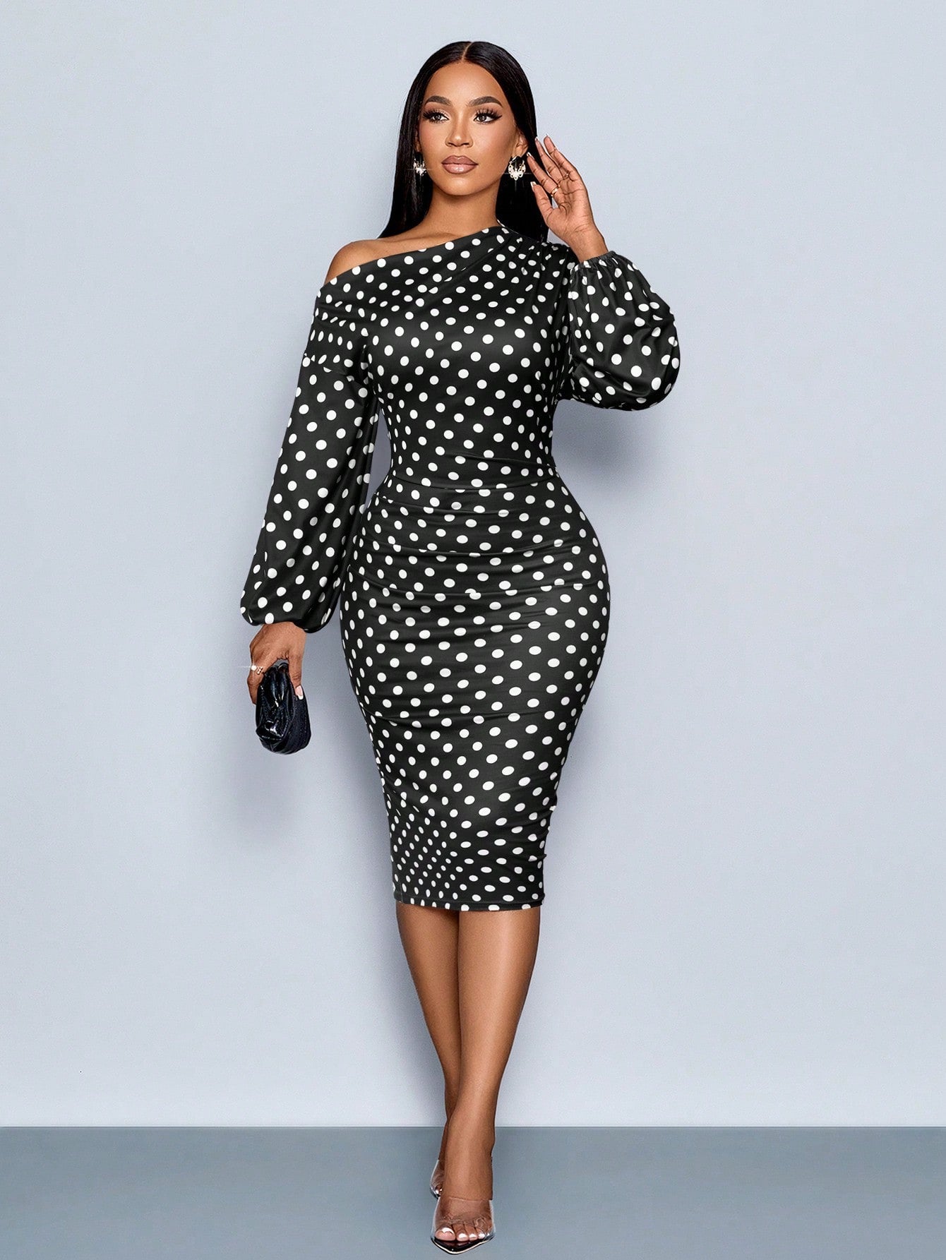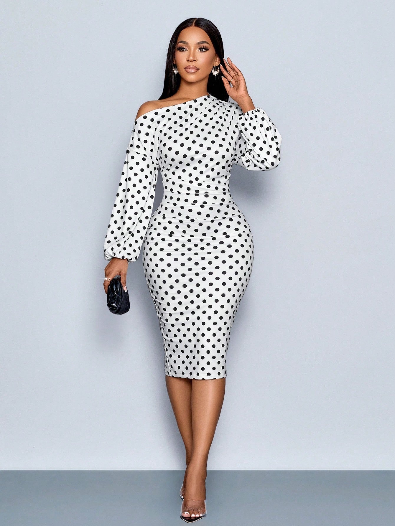 SOLERSUN Women's Winter Elegant New Year's Party Valentine's Day Ball Christmas French White Polka Dot Pattern Off Shoulder Long Sleeve Knitted Hip Cover Old Money Style New Year's Eve Sexy Casual Women's Midi Dress