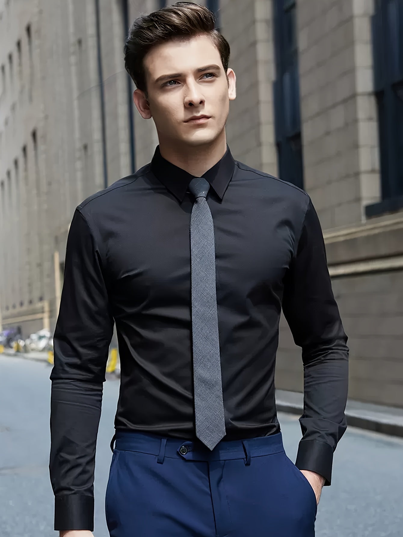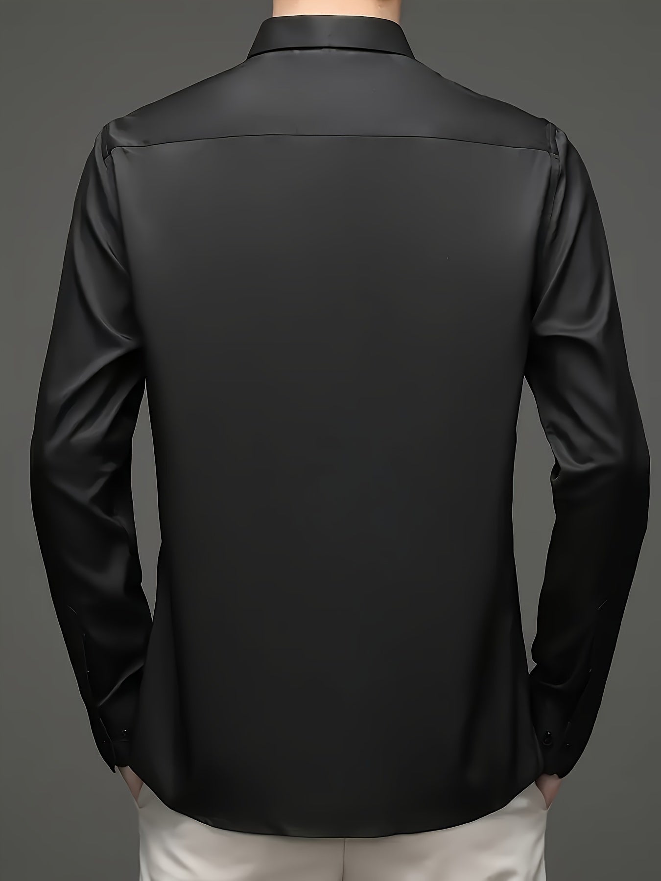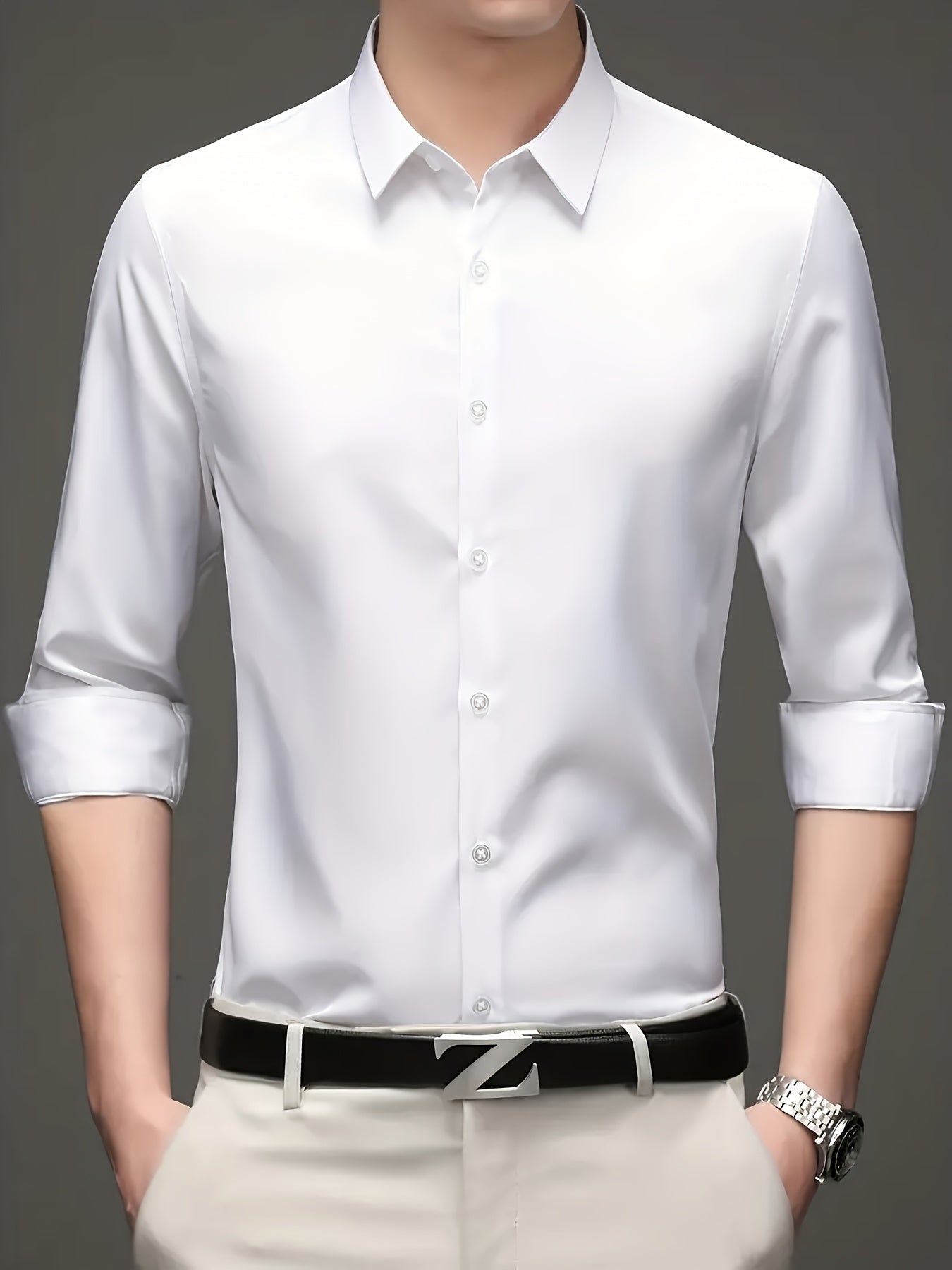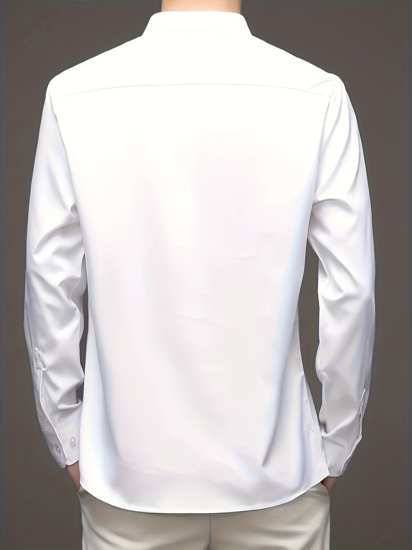 [Solid Color Polyester Dress Shirts] 2pcs Men's Solid Color Polyester Dress Shirts - Regular Fit, Long Sleeve, Lapel Collar, Slight Stretch Fabric, with Button Details, for All-Season Woven Shirting