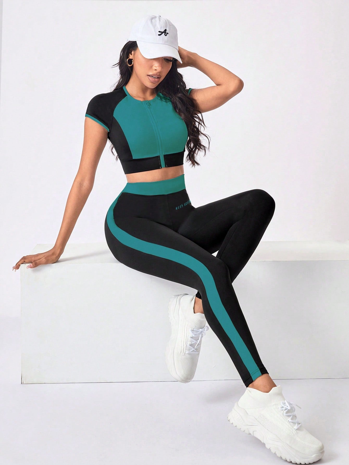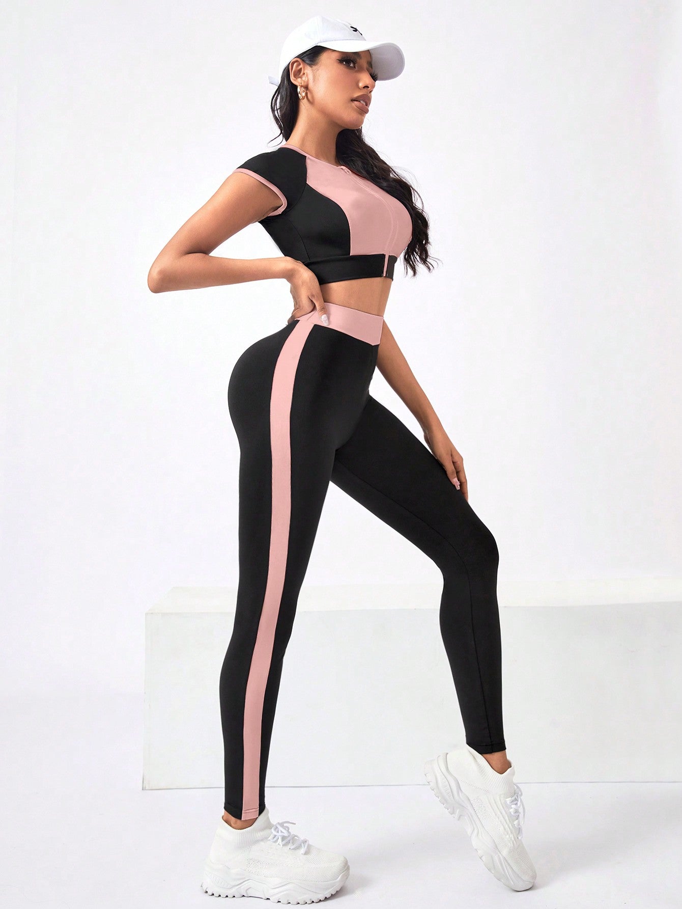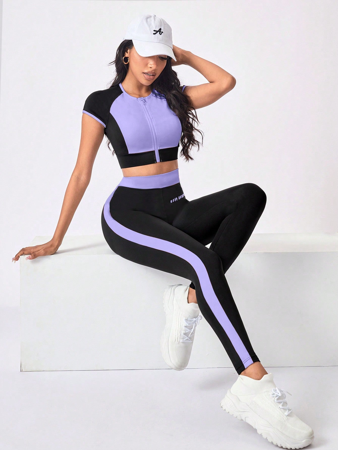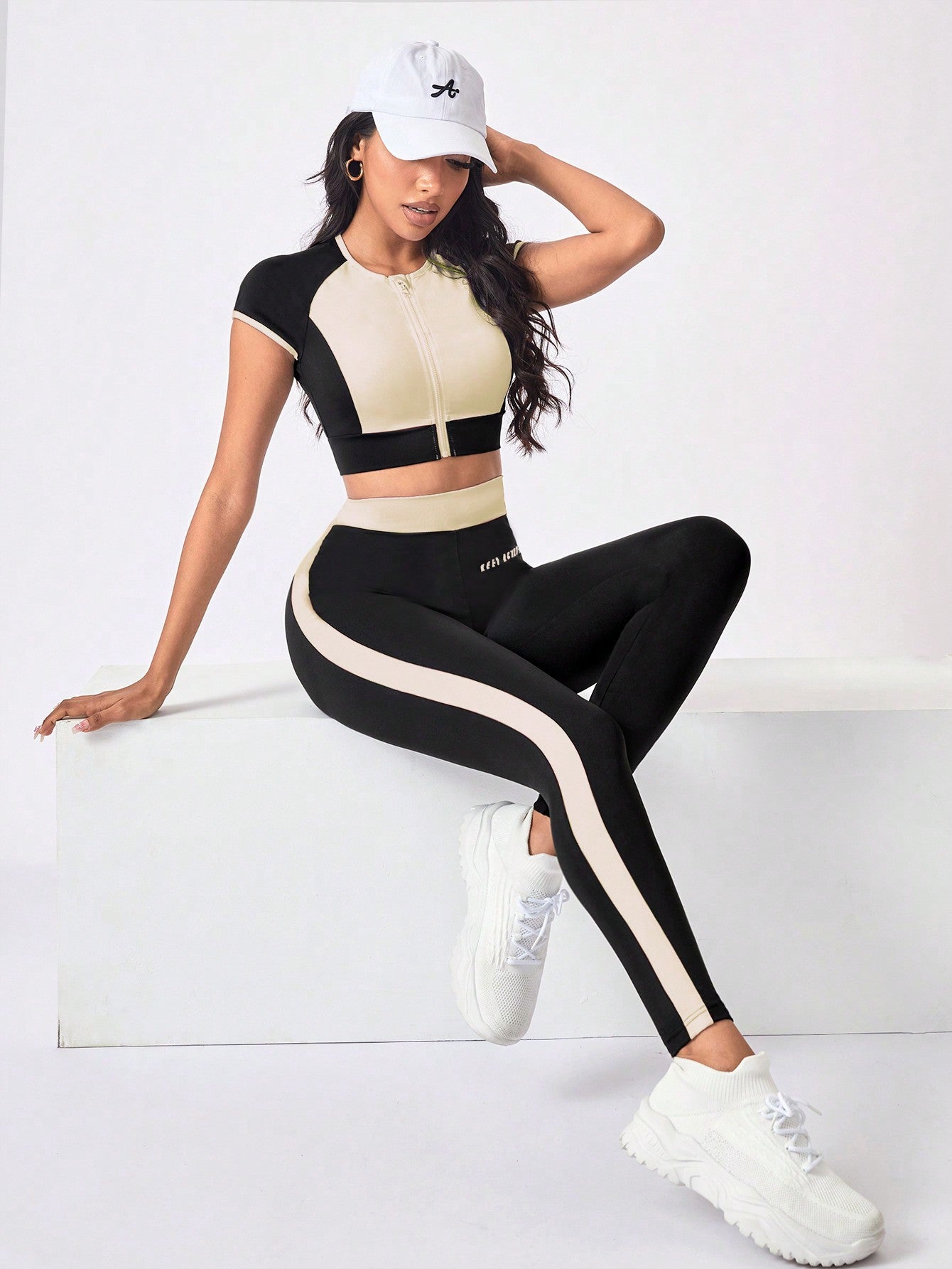 Sport Studio Women's Sportwear Set Crew Neck Short Sleeve Contrast Zipper Top & Striped Design Long Pants Workout Women Set