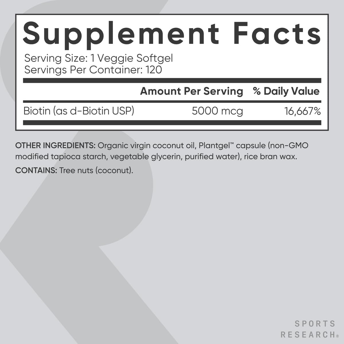 Sports Research Extra Strength Vegan Biotin (Vitamin B) Supplement with Organic Coconut Oil - Supports Keratin for Healthier Hair & Skin - Great for Women & Men - 5,000mcg, 120 Veggie Softgel Capsules