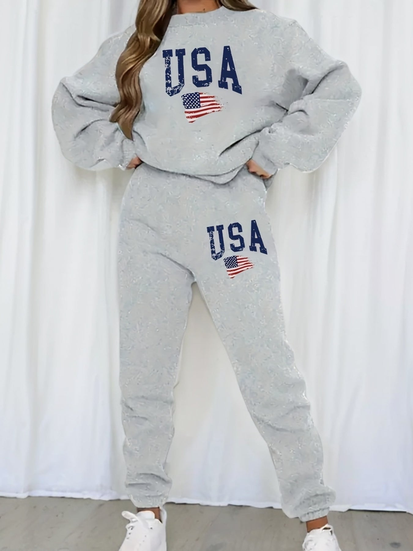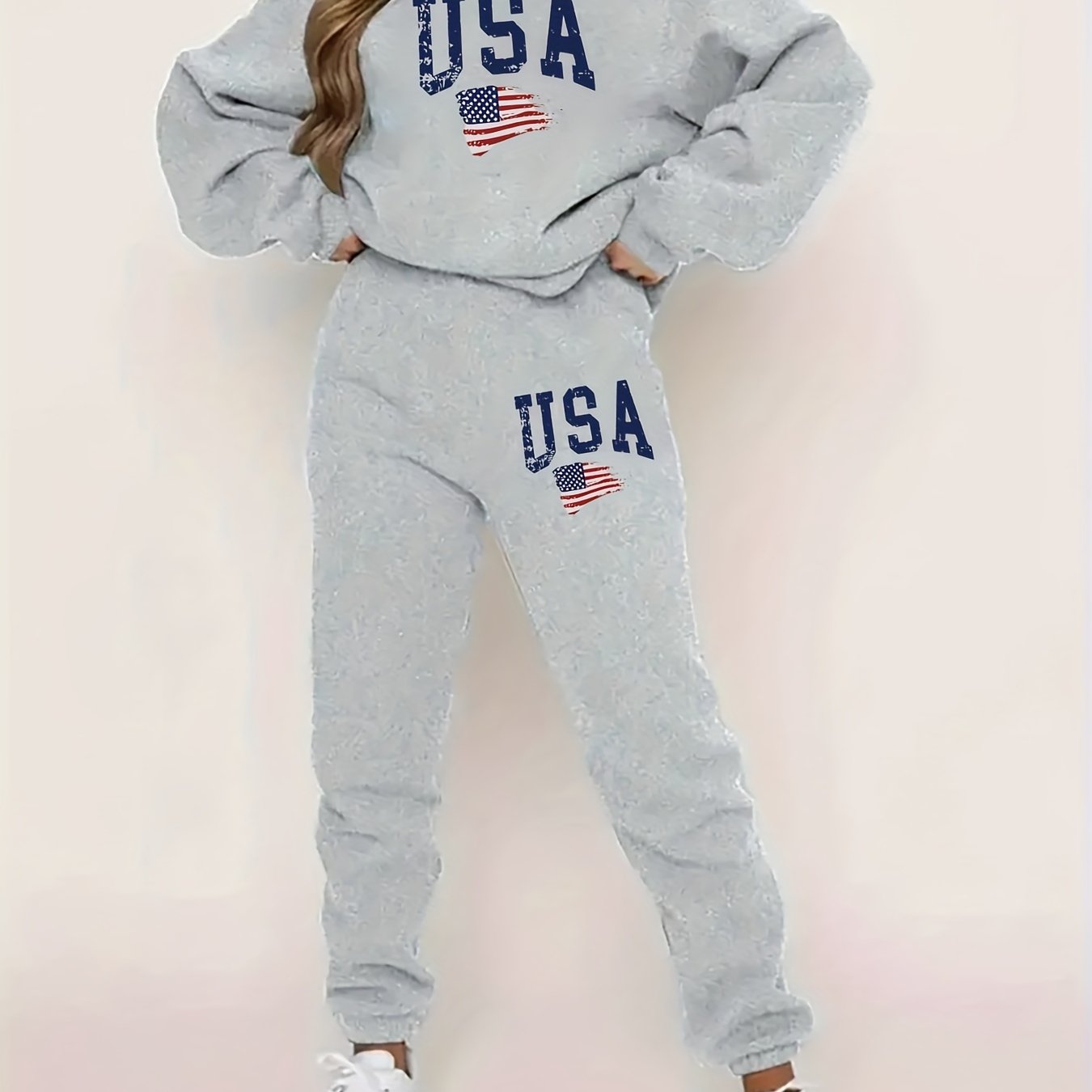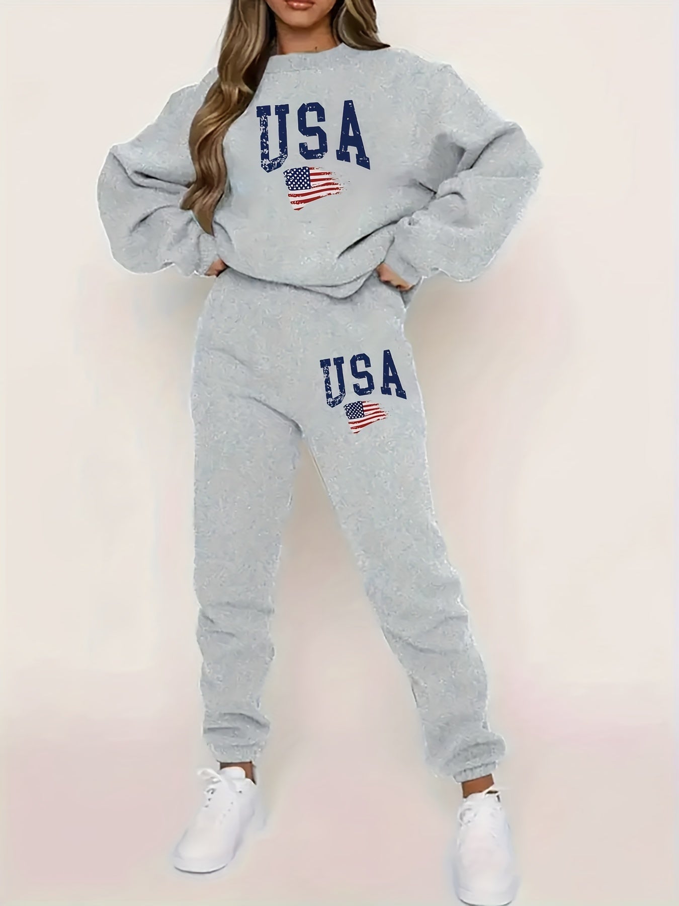 Stylish American Flag Print Pantsuit - Women's Casual Clothing Set with Long Sleeve Crew Neck Sweatshirt & Jogger Sweatpants, Comfortable Outfit for Daily Wear - Patriotic Fashion