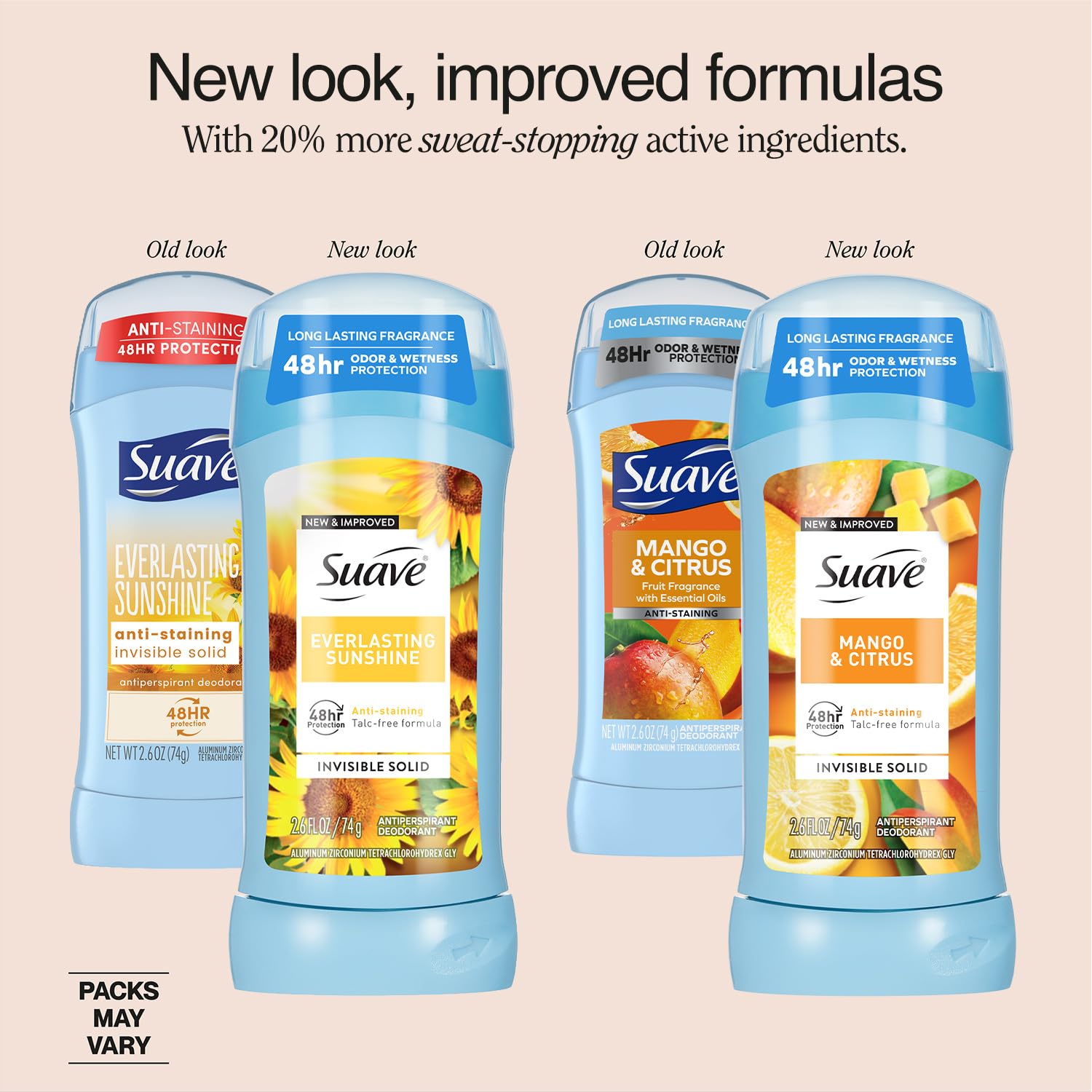 SUAVE DEODORANT VARIETY PACK: Each deodorant stick offers a refreshing escape. All in one bundle, enjoy the vibrant scents of Tropical Paradise, Mango & Citrus, and Everlasting Sunshine with passion flower and vanilla notes.